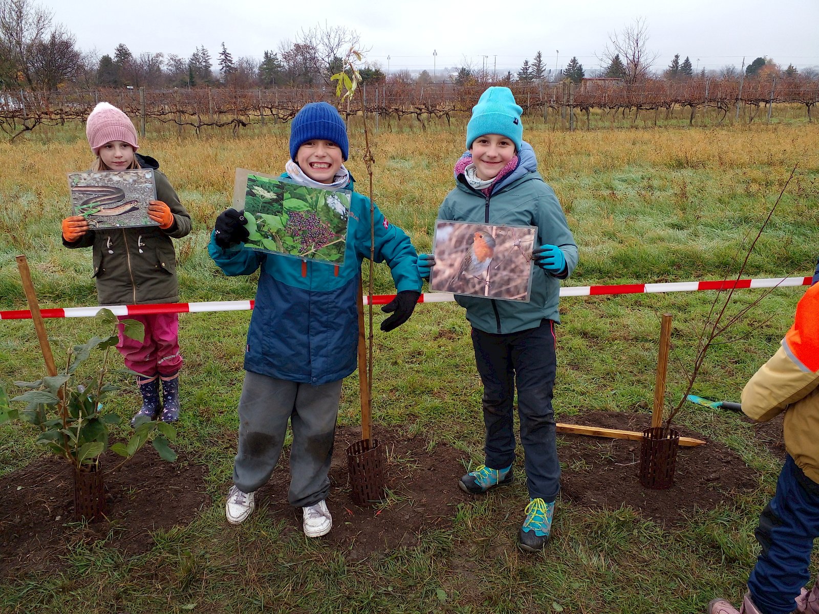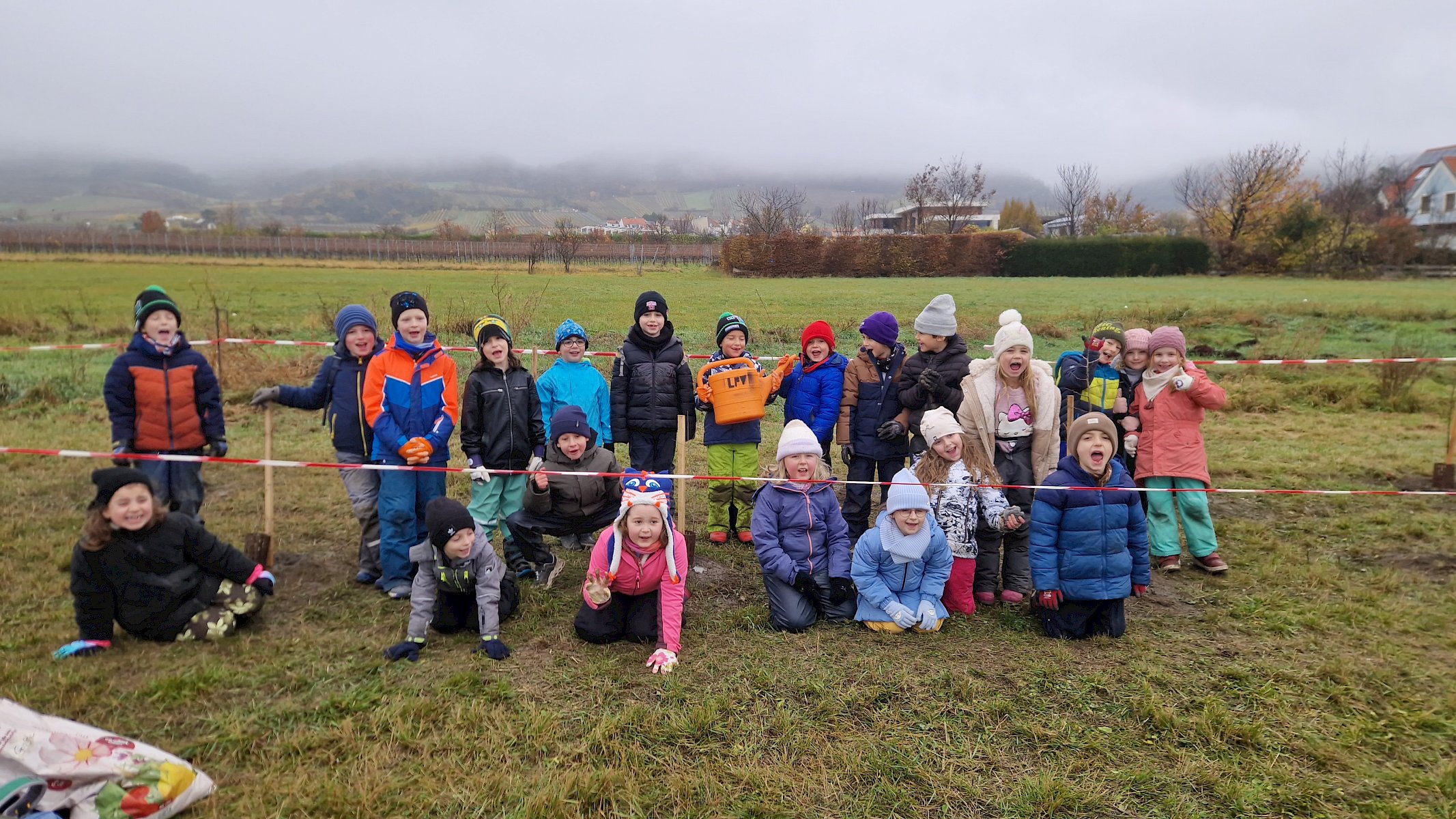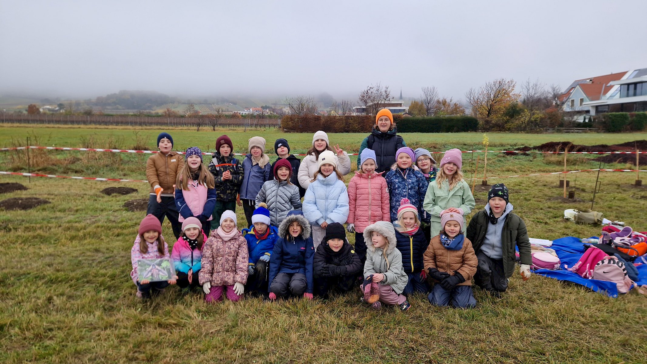 Nach der Auszeichnung ihres Projekts „Klassenzimmer in der Natur" beim Wettbewerb Changemaker #nature von Blühendes Österreich, BILLA gemeinnützige Privatstiftung packten nun alle Klassen der Volksschule Gumpoldskirchen gemeinsam bei der Umsetzung an. An zwei Tagen waren 147 Schüler:innen beteiligt und wurden fachlich sowie pädagogisch von unseren Naturpädagog:innen angeleitet und betreut. Im Rahmen des Projekts pflanzten sie auf einer ein Mal jährlich gemähten Wiese, im Eigentum der Marktgemeinde Gumpoldskirchen, in der Flur Steinfeld eine artenreiche Hecke aus heimischen Sträuchern aus regionaler Gehölzvermehrung (RGV).