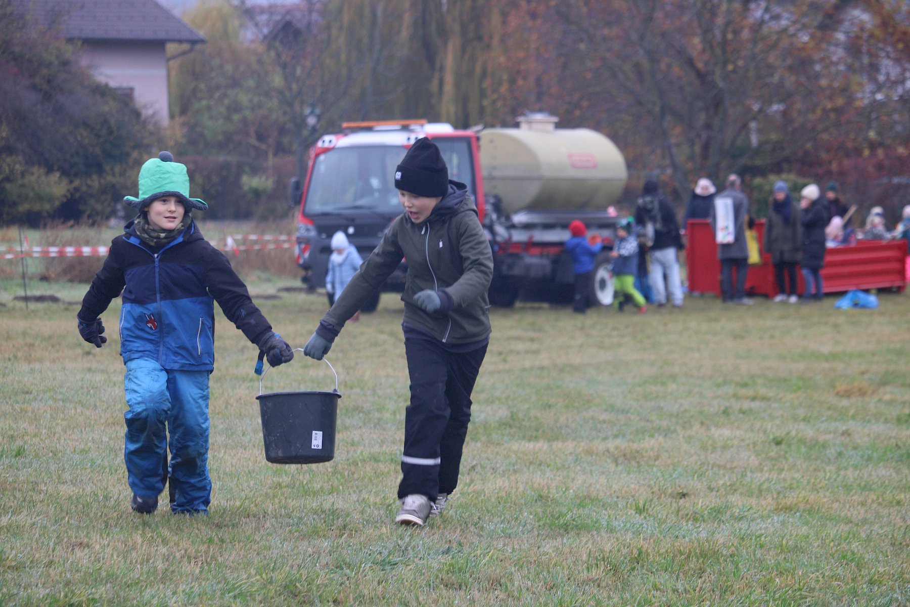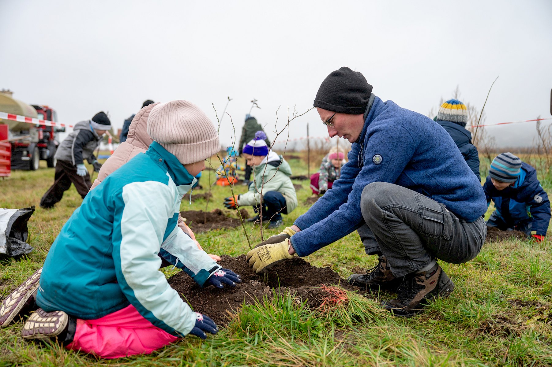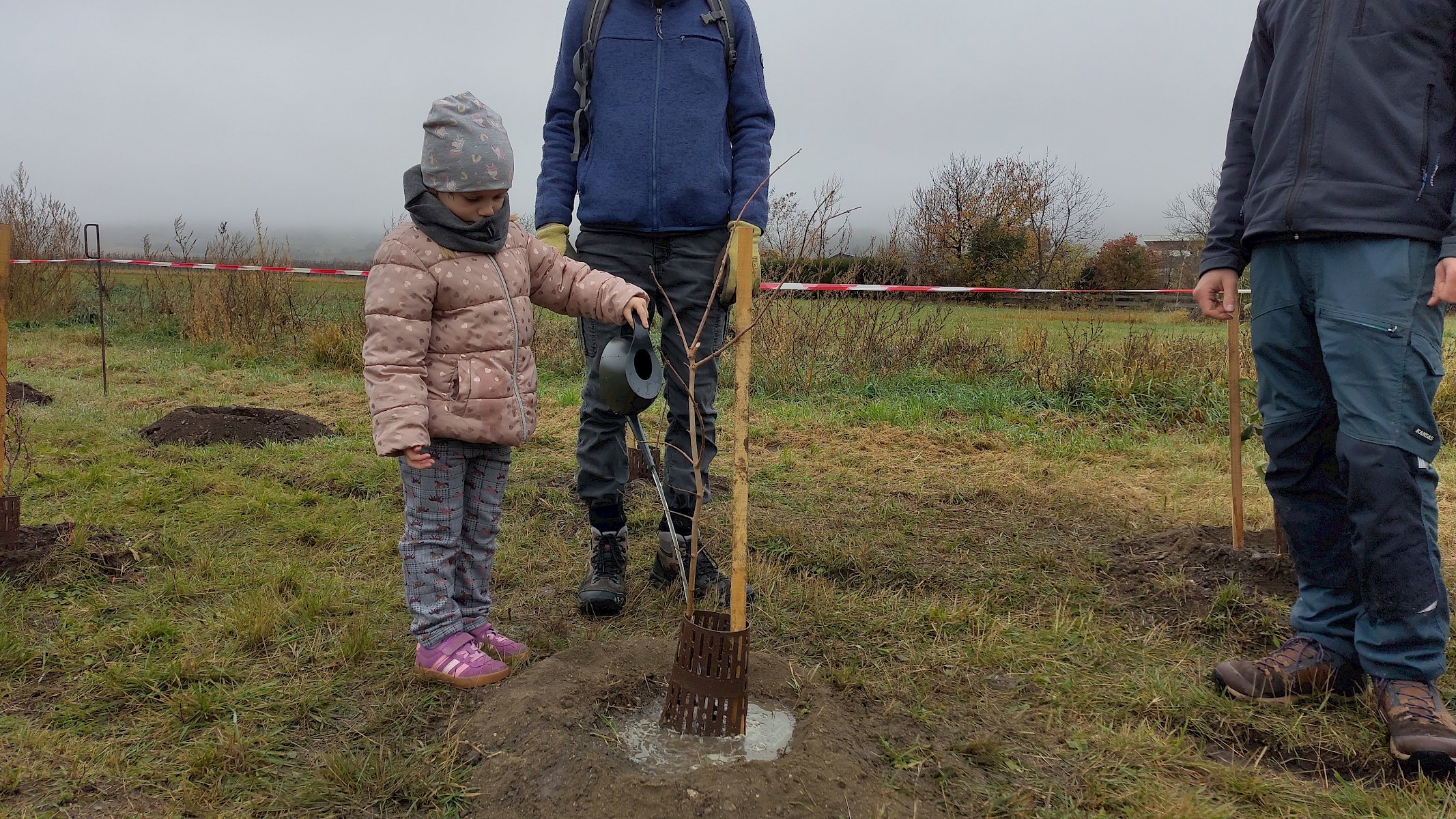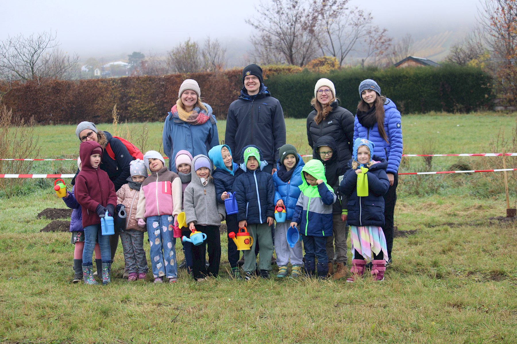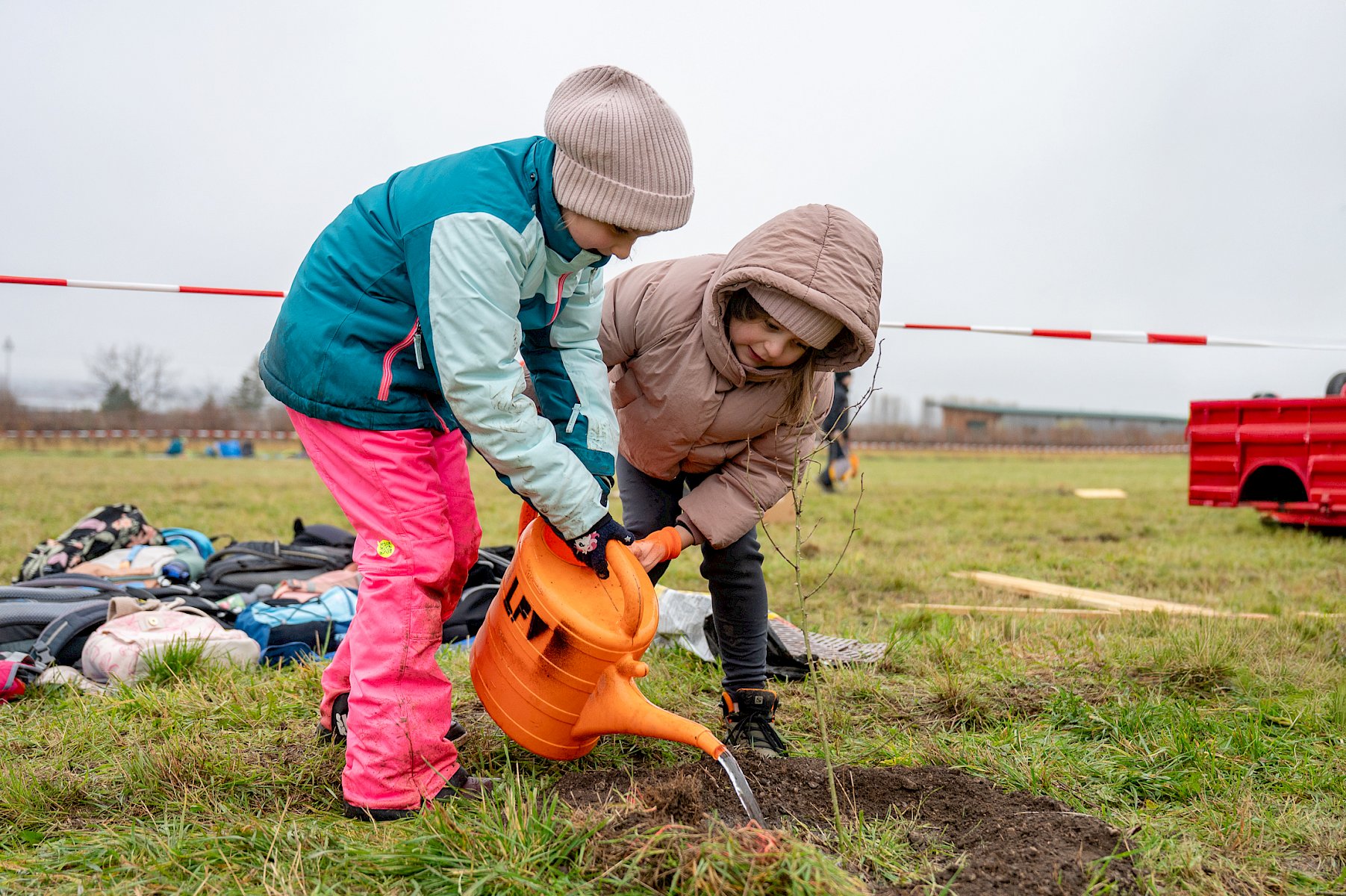 Anschließend teilten sich die Schüler:innen in Kleingruppen, erhielten jeweils einen Strauch samt Infoblatt zu einem Tier, das vom Strauch profitiert, und legten los. In Teamarbeit wurden an zwei Tagen insgesamt 80 Heckensträucher in vorbereitete Löcher gesetzt und die Wurzeln mit Erde bedeckt. Im Anschluss bekamen die Sträucher noch Pflock und Mähschutz. Die Schüler:innen trotzten tapfer dem kalten Wetter und konnten während der Arbeiten sogar einige Tiere beobachten. Begeistert wurden Regenwürmer, Käferlarven, eine Heidelibelle und ein Turmfalke im Rüttelflug erspäht. Zum Abschluss des zweiten Tages kamen dann noch Kinder vom Kindergarten mit ihren eigenen Gießkannen vorbei und halfen gemeinsam mit Leiterin Ingrid Hammer mit, die frisch gesetzten Hecken einzugießen.