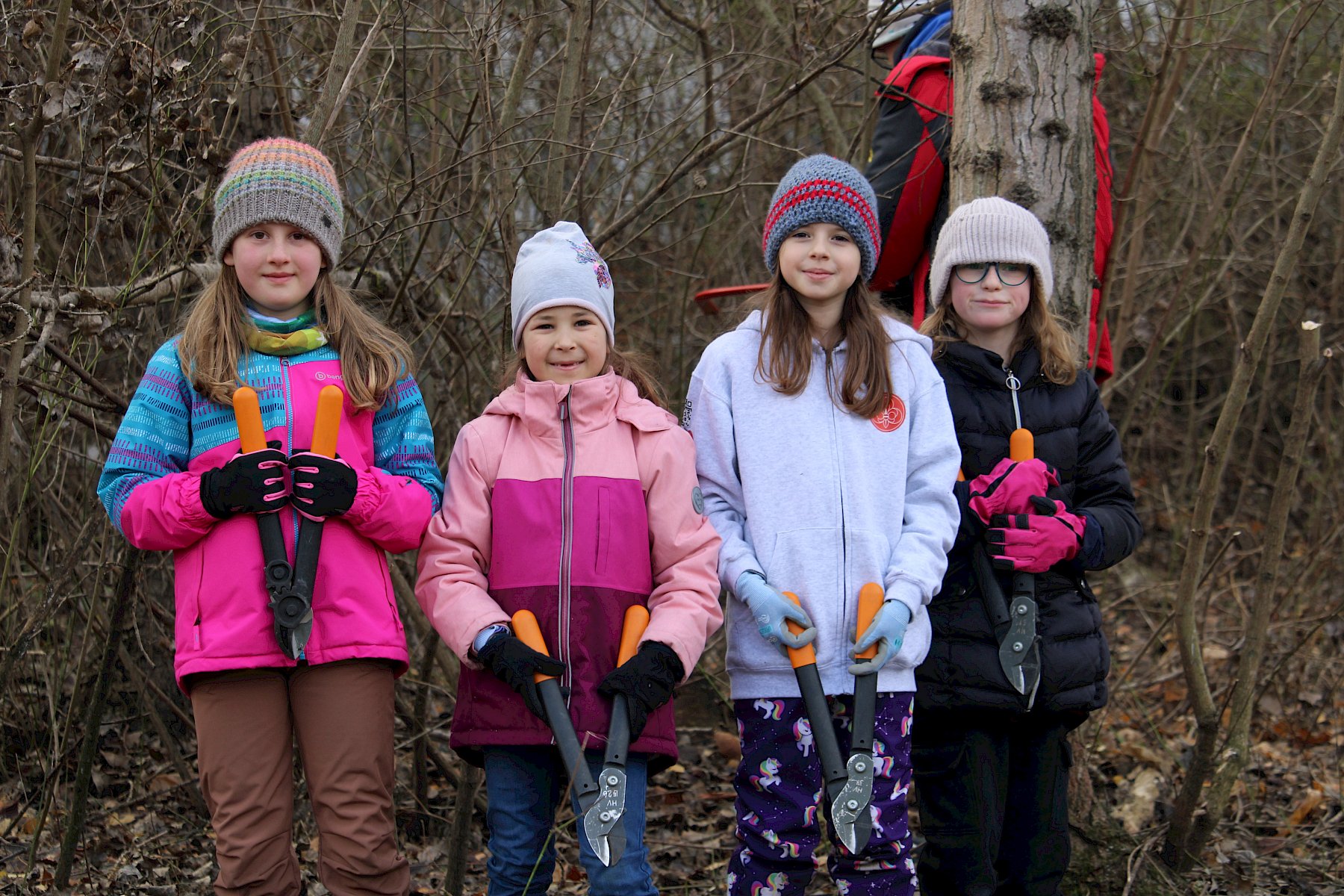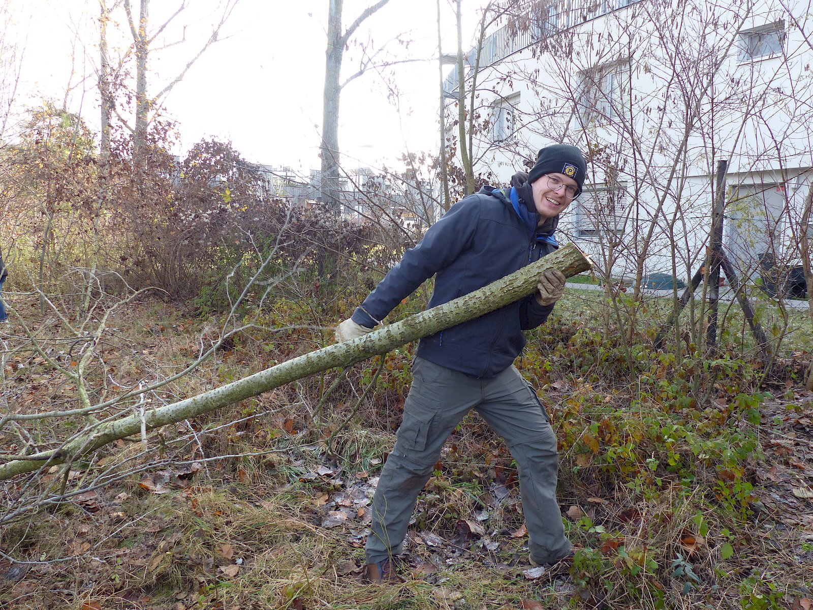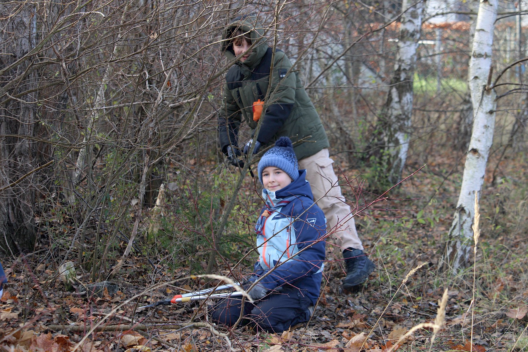 Dann ging es auch schon los! Bei kühlem, klarem Spätherbstwetter entfernten die motivierten Freiwilligen mit Astscheren, Sägen und Krampen junge Bäume sowie aufkommende Sträucher aus dem Trockenrasen. Gepflegt wurden zwei Flächen: Auf jener, die bereits im Vorjahr bearbeitet worden war, stand diesmal vor allem die Entfernung kleiner Baumaufkömmlinge im Mittelpunkt. Auf der zweiten Fläche lag der Schwerpunkt darauf, junge Gehölze wie den Liguster (Ligustrum vulgare) zurückzudrängen, um die offene Vegetation wiederherzustellen. Da die natürliche Dynamik durch weidende Tiere heute fehlt, drohten die Flächen allmählich zu verbuschen. Durch den Einsatz der Pfadfinder:innen erreicht wieder mehr Licht und Wärme den Boden, ideale Bedingungen für Arten wie Adriatische Riemenzunge (Himantoglossum adriaticum), Smaragdeidechse (Lacerta viridis) oder Neuntöter (Lanius collurio).