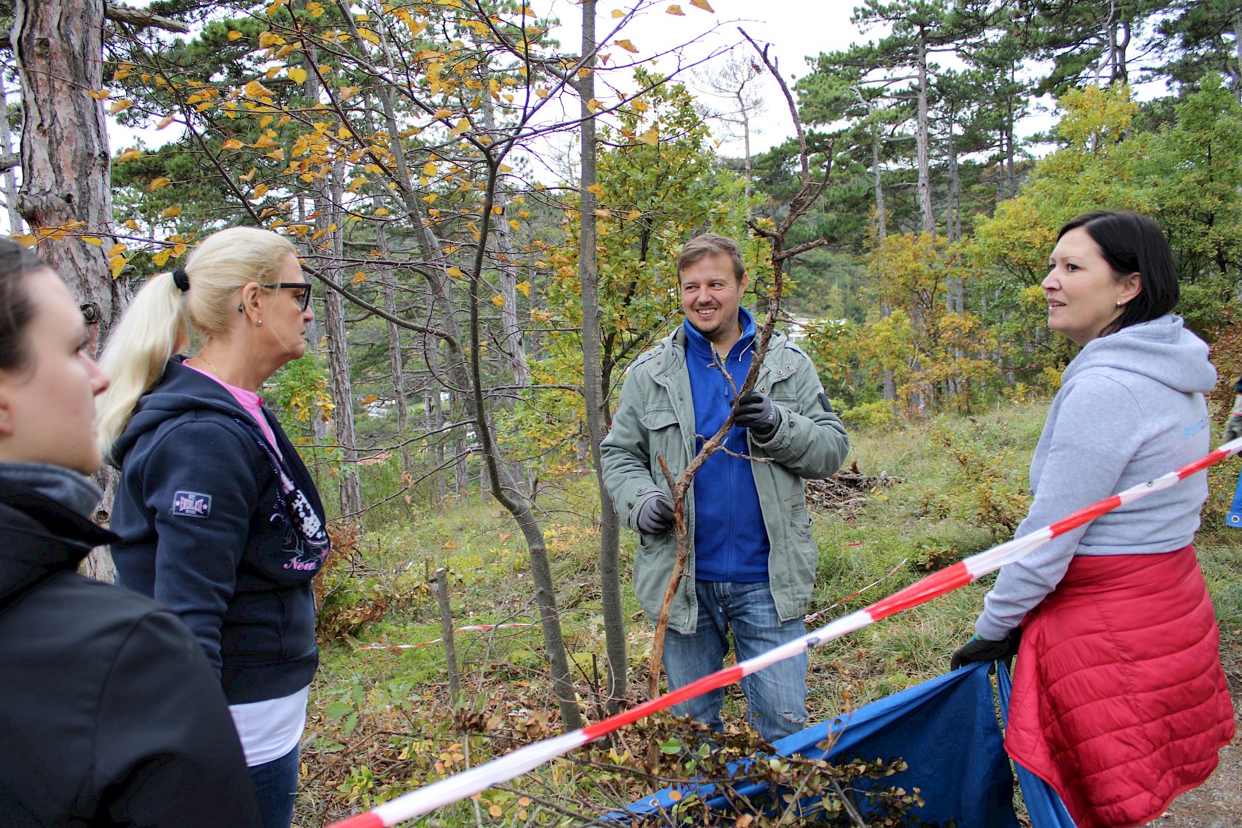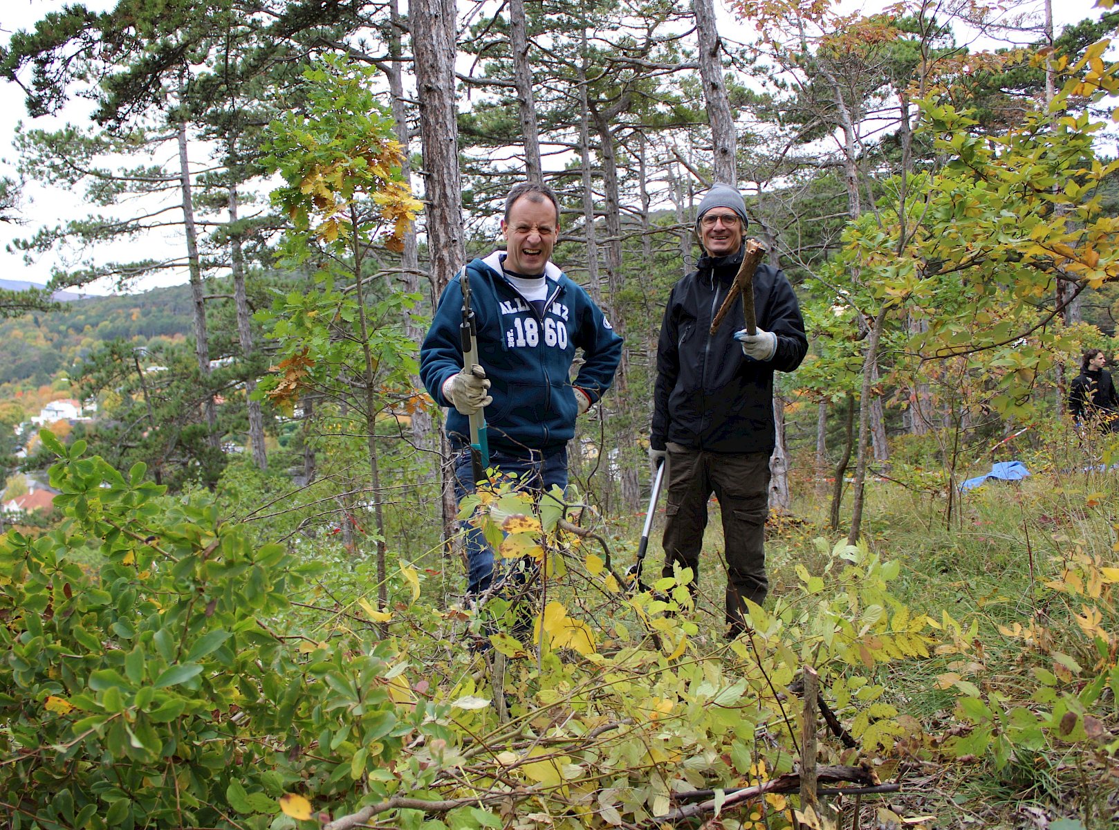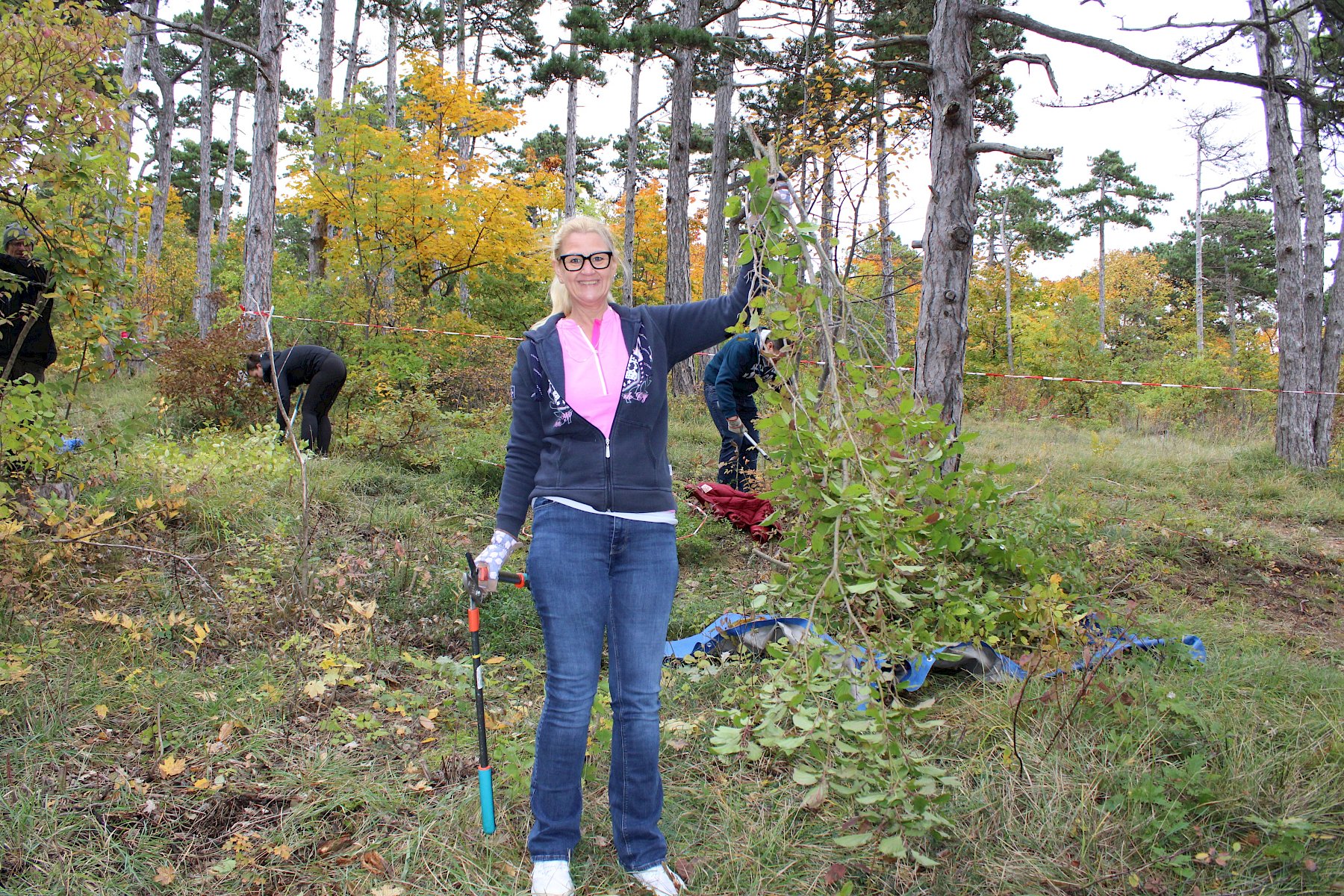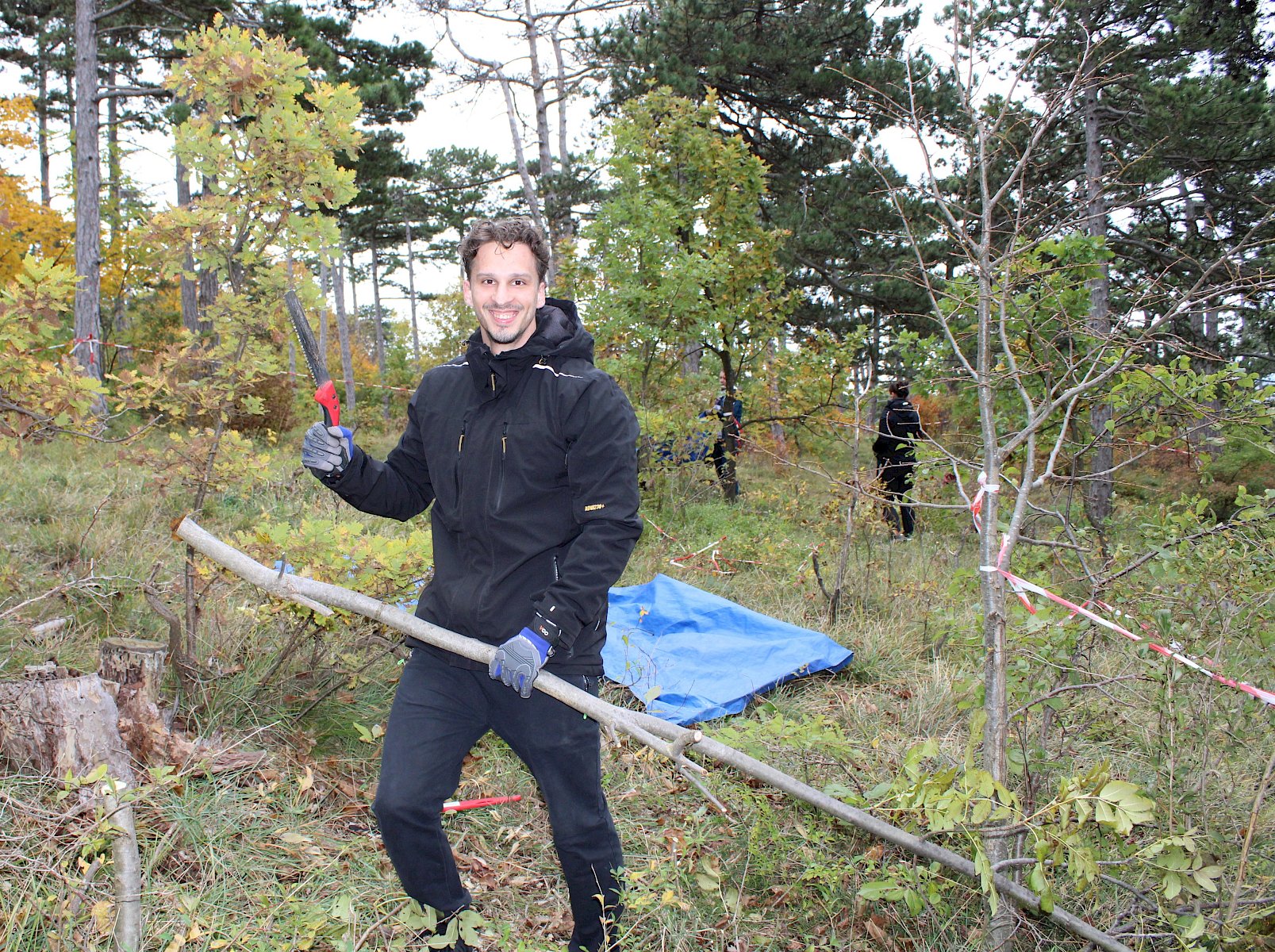 Von unserer Biologin Irene Drozdowski gab es zunächst für alle eine eine fachliche Einführung zu den Trockenrasen und deren Bedeutung. Trockenrasen zählen zu den artenreichsten Naturgebieten in Mitteleuropa und sind wahre Hotspots der Biodiversität. Um sie zu erhalten sind regelmäßige Pflegemaßnahmen notwendig, damit die Flächen nicht zusehends verbuschen und die seltenen Arten verdrängt werden. Nach einer sorgfältigen Einschulung zum Werkzeuggebrauch und der Arbeitssicherheit ging es auch schon los an die Arbeit. Es wurden zwei Gruppen gebildet: die "Hacker" rund um unsere Biolog:innen Felix und Fischi machten sich ausgerüstet mit Krampen zur Fläche unterhalb der Ferdinand-Raimund-Aussicht auf, um dort Flieder samt Wurzeln auszuhacken. Die "Schneider" rund um unsere Biolog:innen Irene, Norbert und Luca und Praktikantin Magdalena schnitten kleine und große Gehölze auf den neuen Renaturierungsflächen.