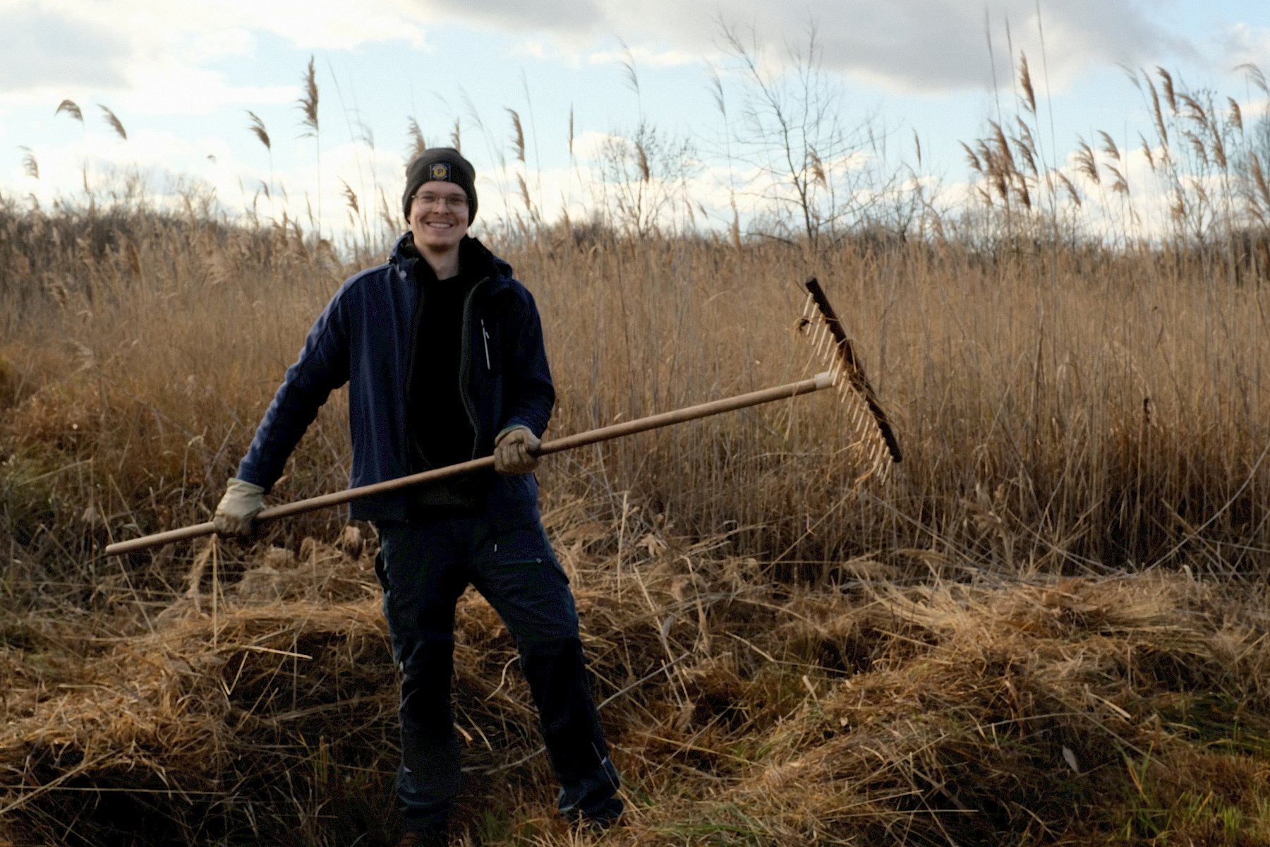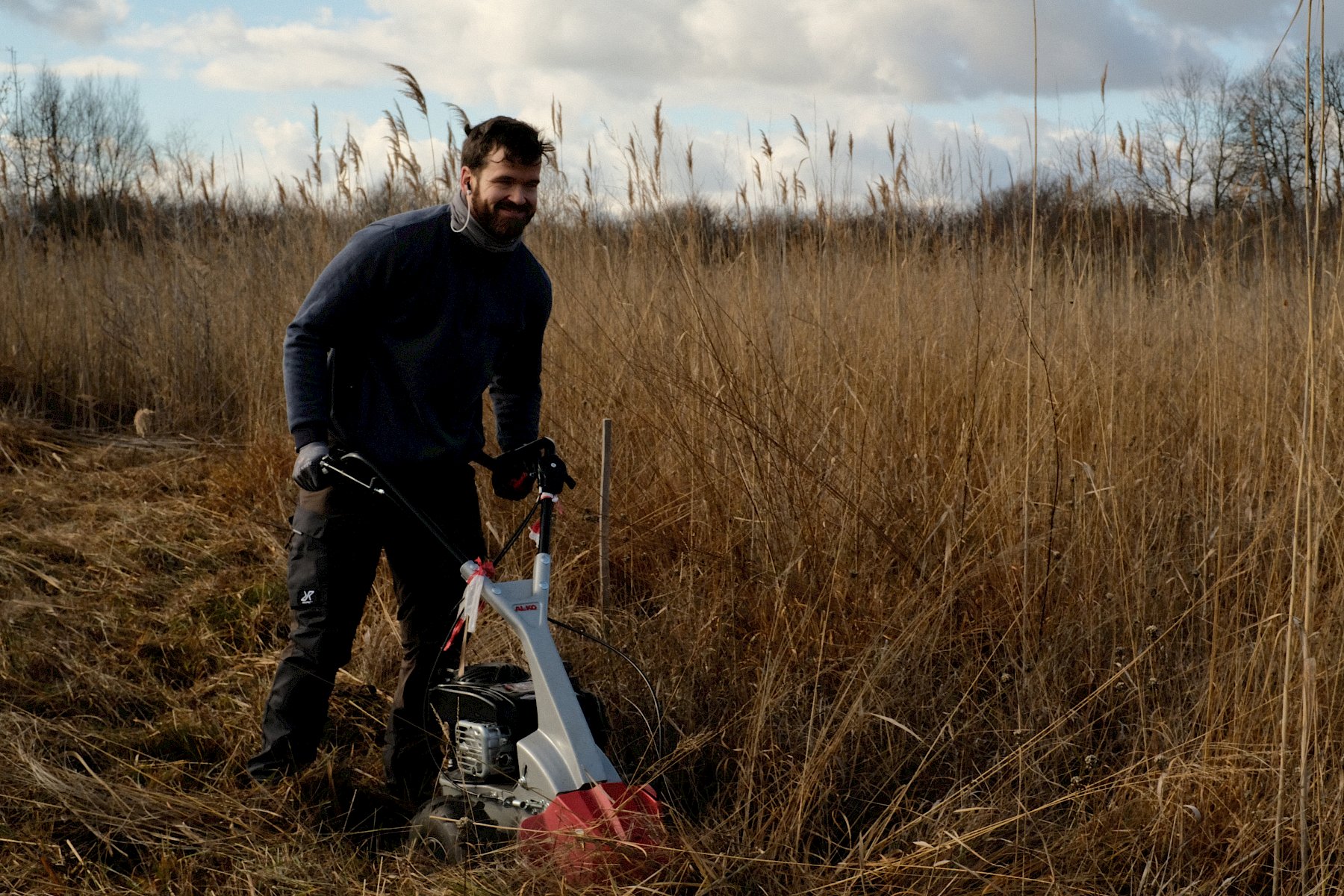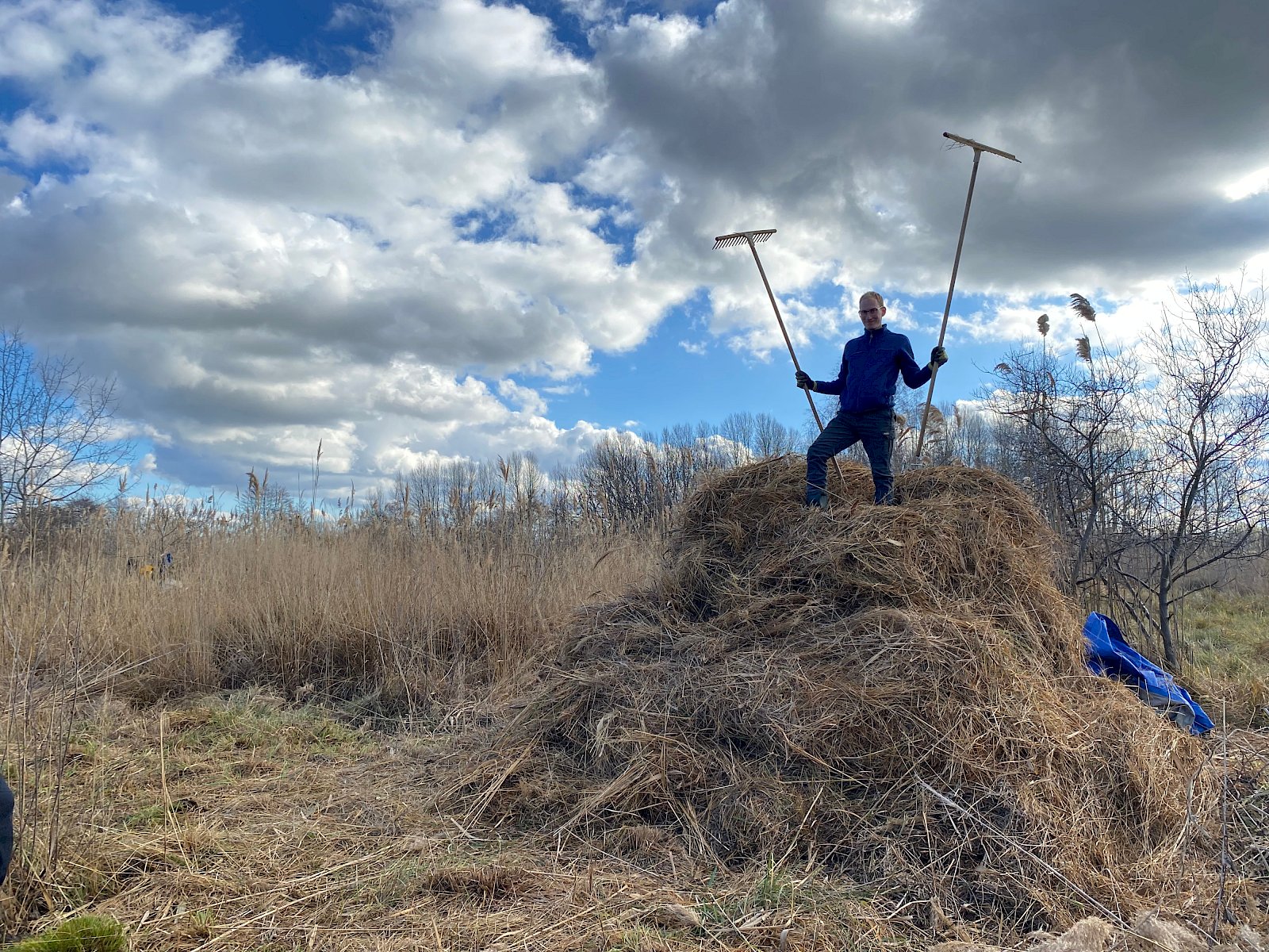 Währenddessen begannen unsere Biologen Luca und Manuel damit, unter Anleitung von Naturschutz-Expertin Irene Drozdowski ausgewählte Bereiche mit dem Balkenmäher zu mähen – eine herausfordernde Aufgabe auf den unebenen, von Gräben und Buckeln durchzogenen Flächen. Auf anderen Flächen kamen derweil zwei Freischneider zum Einsatz. Mit Rechen und Planen wurde das gemähte Schnittgut zusammengerecht und in Teamarbeit an den Flächenrand getragen. Nach dem verregneten Vortag stand das Wasser noch überall, sodass Gummistiefel die „Mode des Tages" waren. Dennoch gingen die Arbeiten gut voran und am Ende des Tages waren die Helfer:innen stolz auf ihren Beitrag zu mehr biologischer Vielfalt.