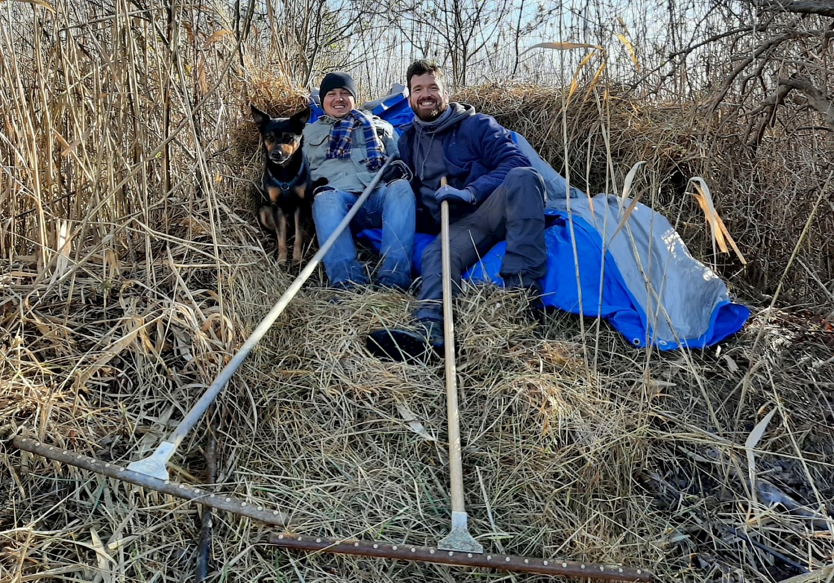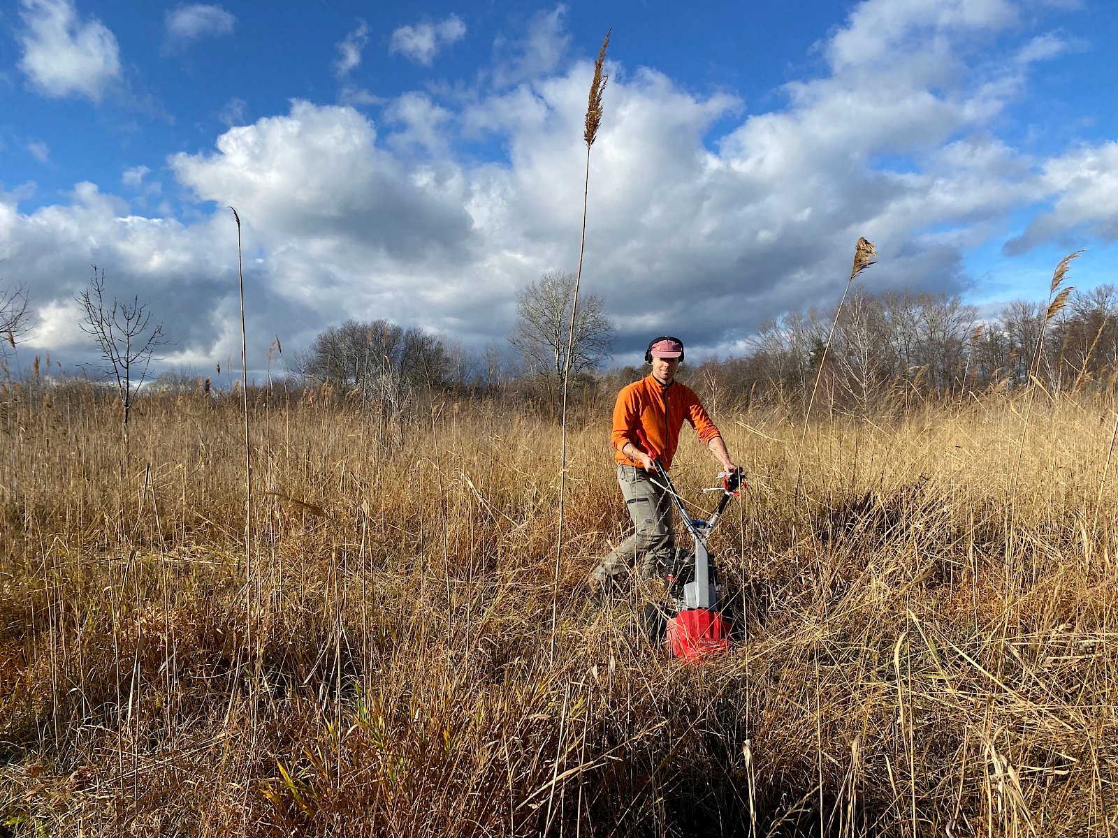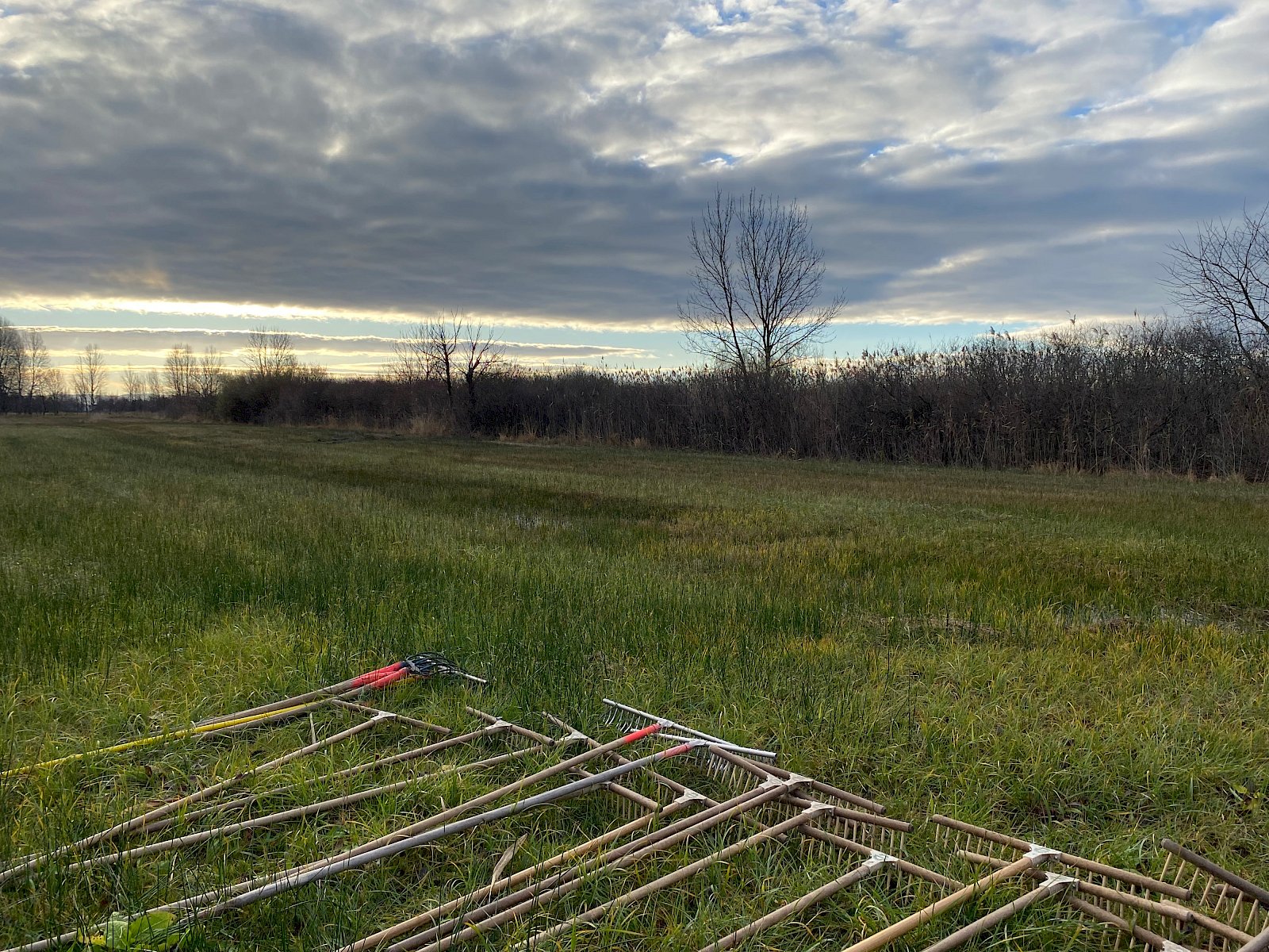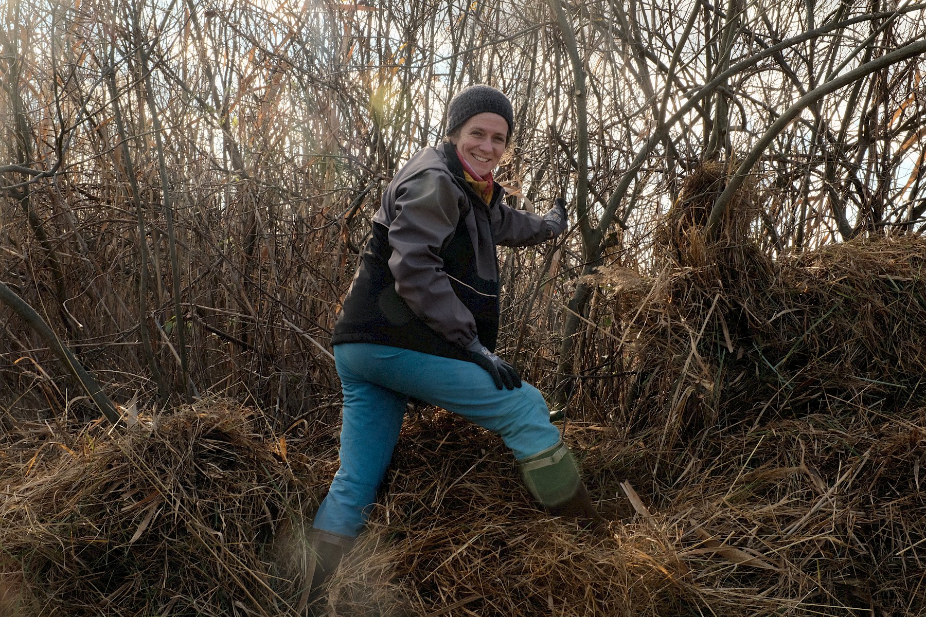 Währenddessen begannen unsere Biologen Luca und Manuel damit, unter Anleitung von Naturschutz-Expertin Irene Drozdowski ausgewählte Bereiche mit dem Balkenmäher zu mähen – eine herausfordernde Aufgabe auf den unebenen, von Gräben und Buckeln durchzogenen Flächen. Auf anderen Flächen kamen derweil zwei Freischneider zum Einsatz. Mit Rechen und Planen wurde das gemähte Schnittgut zusammengerecht und in Teamarbeit an den Flächenrand getragen. Nach dem verregneten Vortag stand das Wasser noch überall, sodass Gummistiefel die „Mode des Tages" waren. Dennoch gingen die Arbeiten gut voran und am Ende des Tages waren die Helfer:innen stolz auf ihren Beitrag zu mehr biologischer Vielfalt.