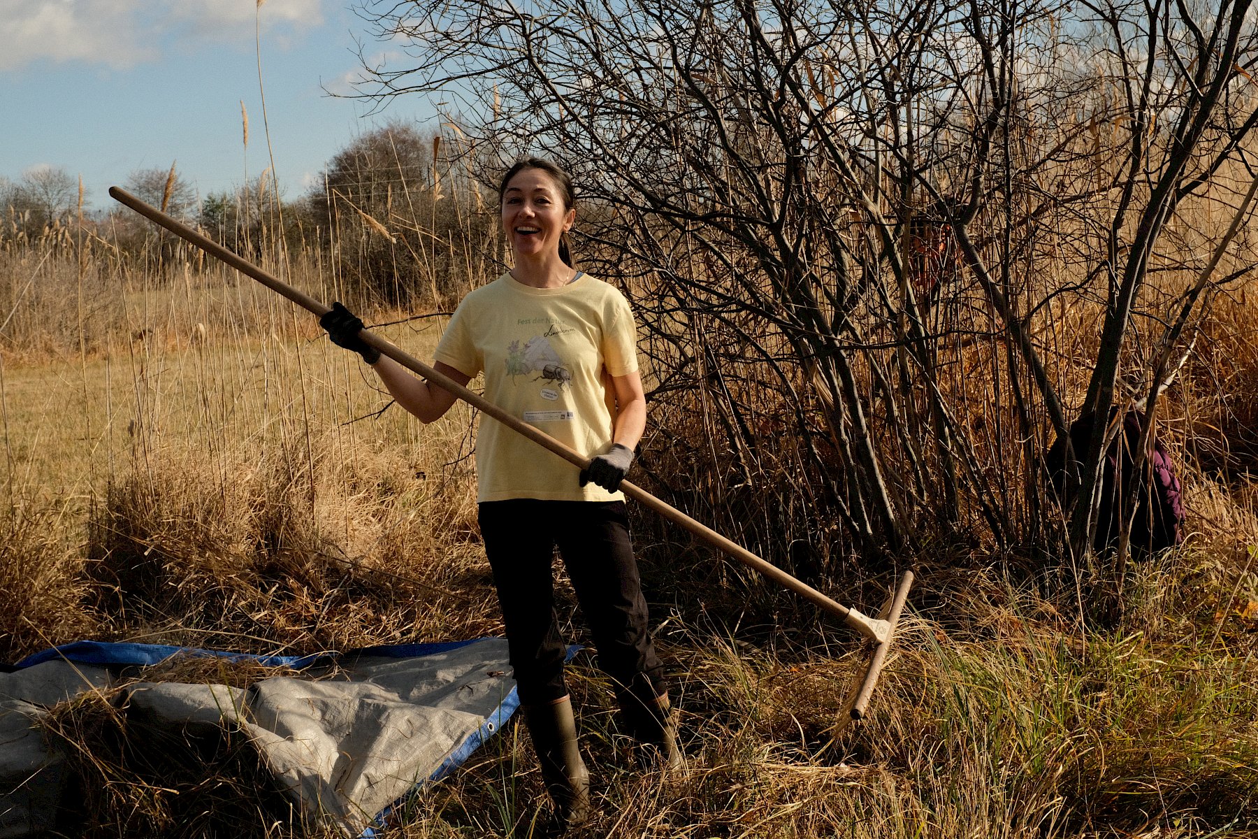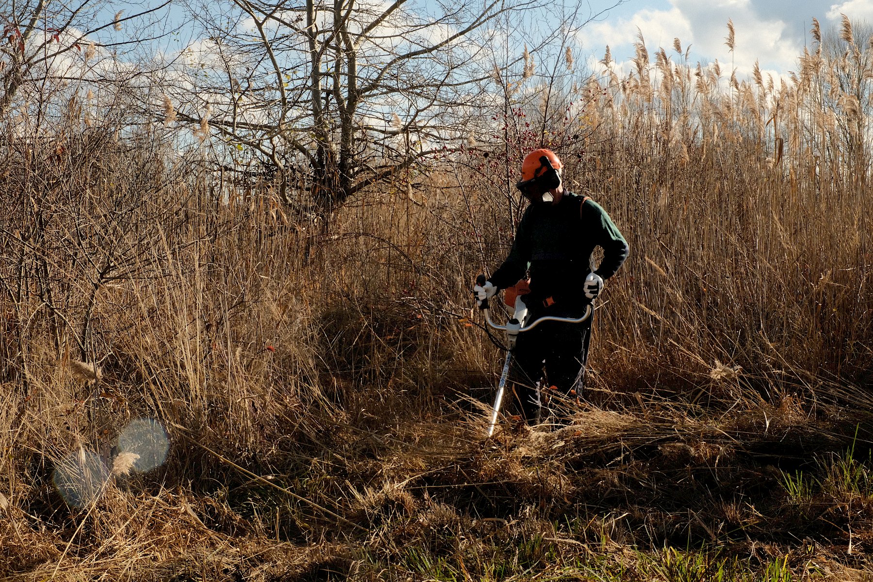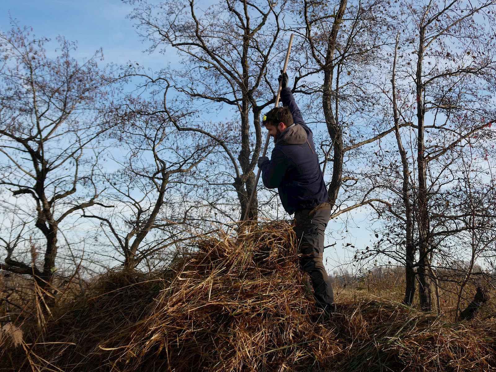 Mittwoch: Auch am zweiten Tag wurden ausgewählte Bereiche mit Balkenmäher und Freischneider gemäht. Das Schnittgut wurde zusammengerecht, auf Planen gesammelt und in Teamarbeit auf Haufen, welche entlang der Gräben zerstreut liegen, getragen und platzsparend verdichtet. Außerdem wurden mehrere Bäume gefällt, um zwei Feuchtwiesenbereiche besser zu vernetzen. Zu Mittag wurde gemütlich auf den Planen, die kurzfristig zu Picknickdecken umfunktioniert wurden, gejausnet, Tee getrunken und Kraft für den Nachmittag getankt.