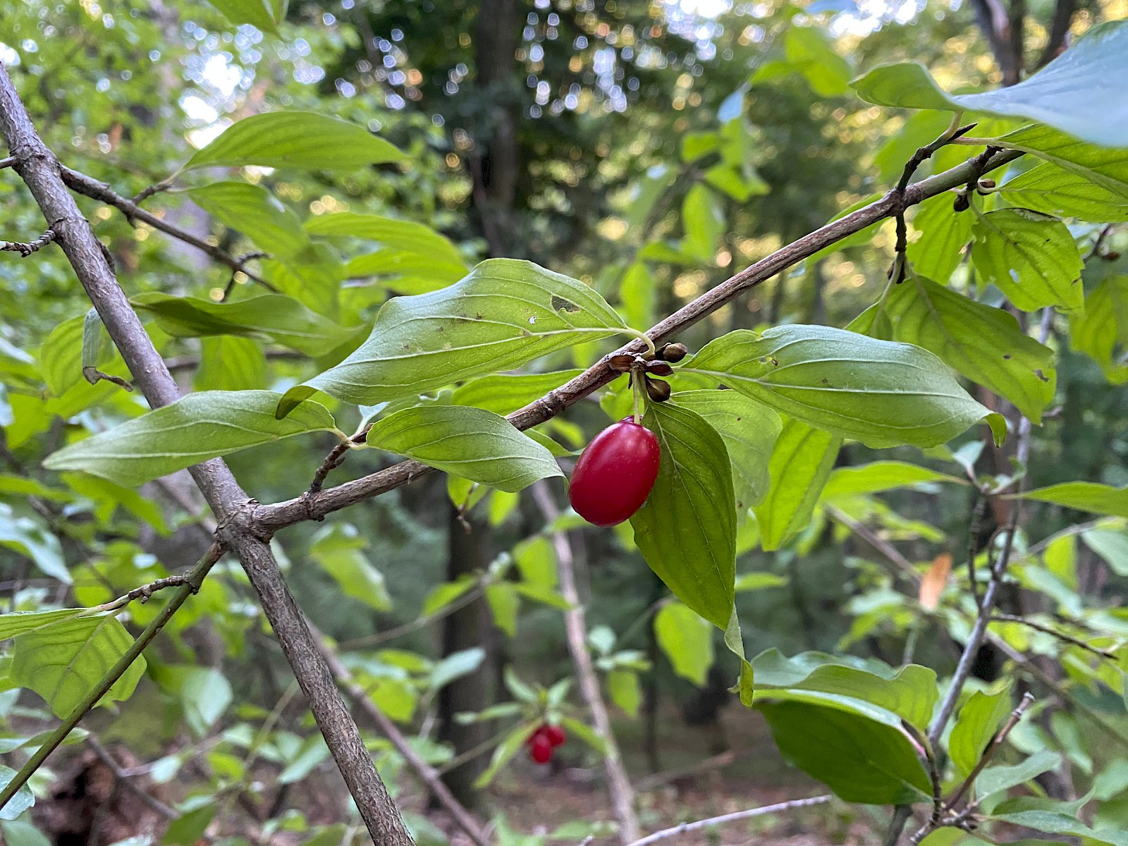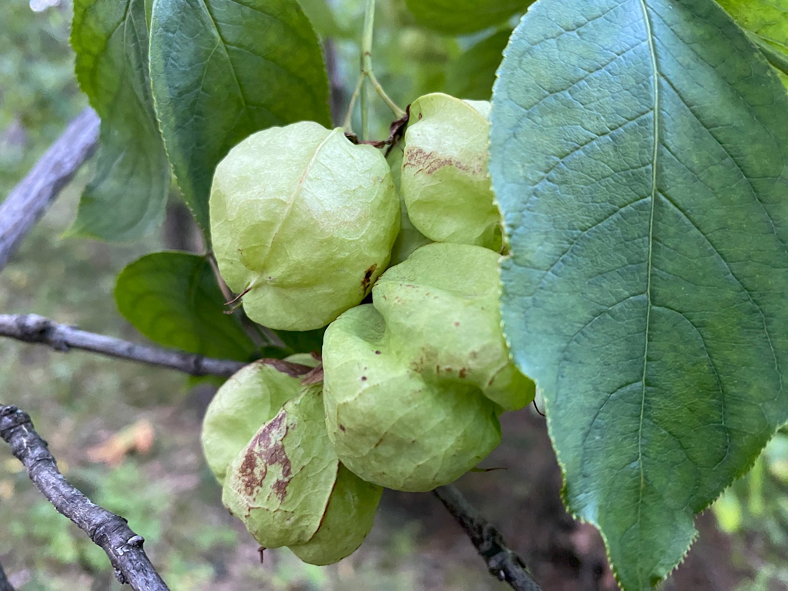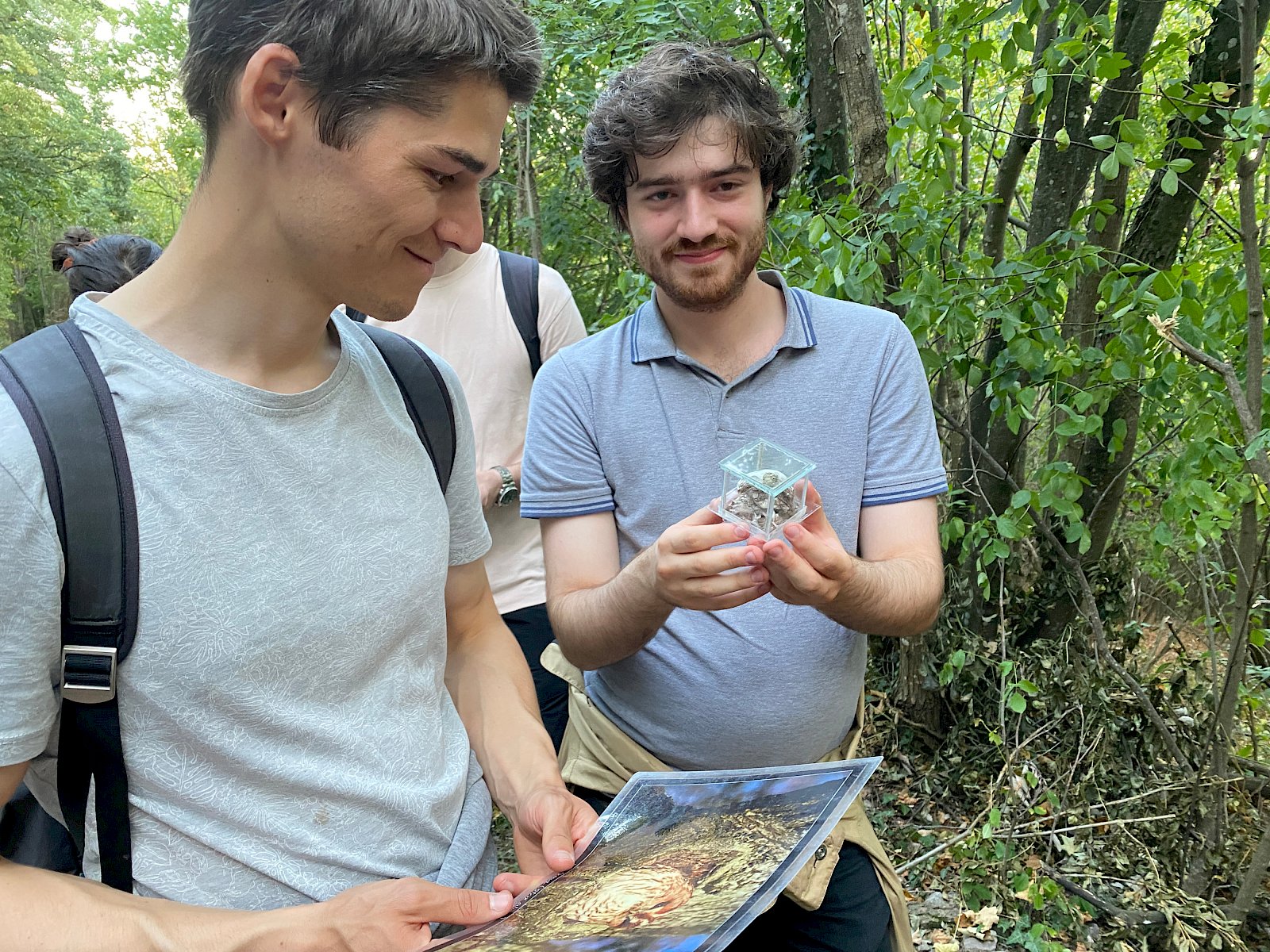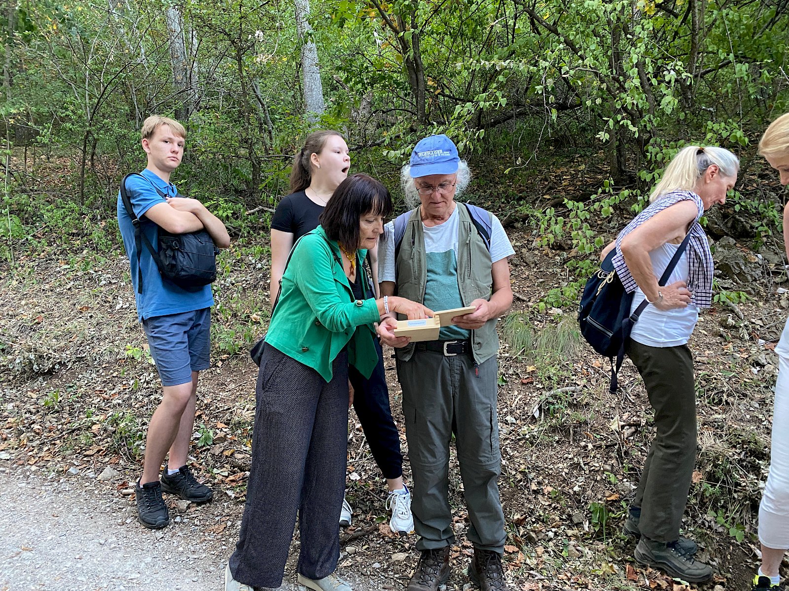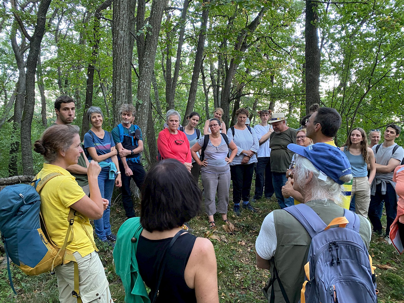 Am Kamm entlang ließ sich eindrucksvoll der Zusammenhang zwischen Licht, Hangneigung und deren Einfluss auf die Ausprägung der Waldtypen beobachten: von südseitig stehenden Eichen- und Föhrenwäldern, stellenweise mit Linden, bis hin zu schattig gelegenen Buchenwäldern. Gemeinsam mit den an den trockeneren und sonnigeren Hängen wachsenden Sträuchern, wie etwa dem Dirndlstrauch (Cornus mas), bilden sie einen wichtigen Schutzwall gegen Erosion. Vereinzelt konnten wir auch die bei uns seltene Pimpernuss (Staphylea pinnata) bewundern. Die Teilnehmer:innen erhielten außerem spannende Einblicke in die Vielzahl der Organismen, die auf Eichen leben – insbesondere in die Gruppe der Gallwespen und die von ihnen gebildeten Pflanzengallen.