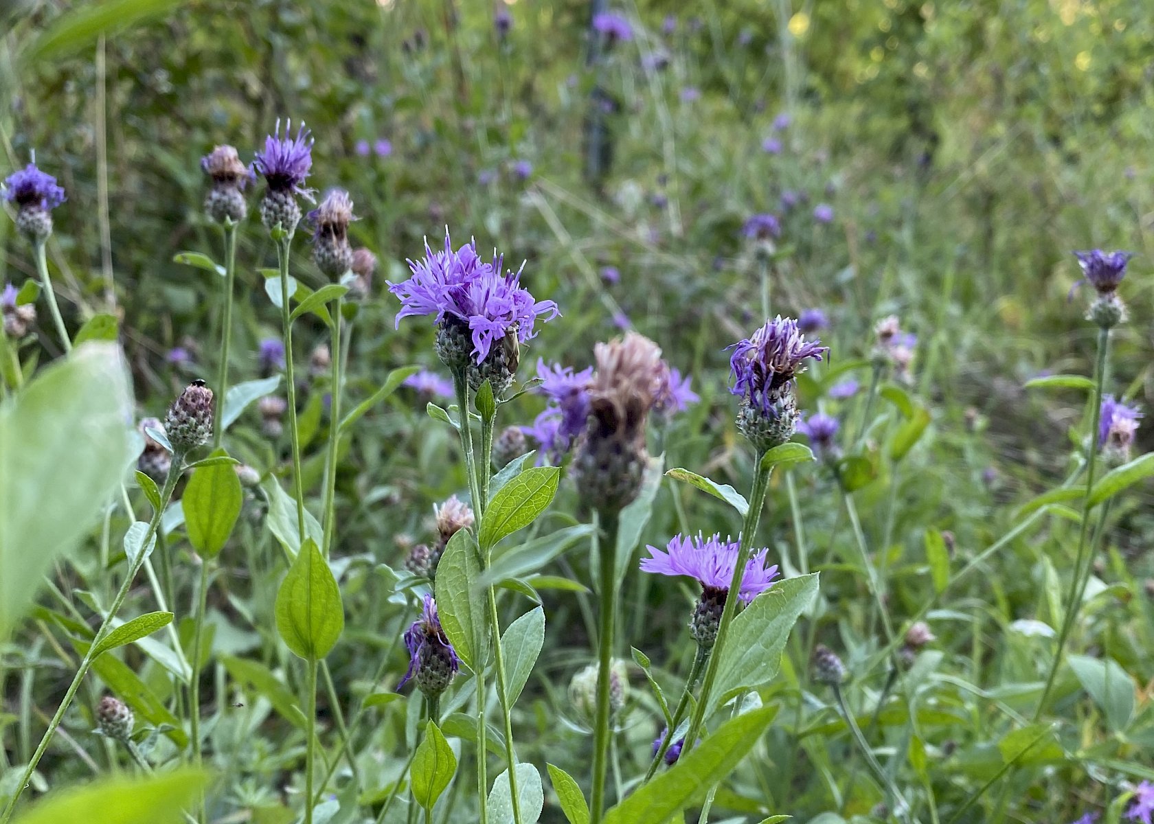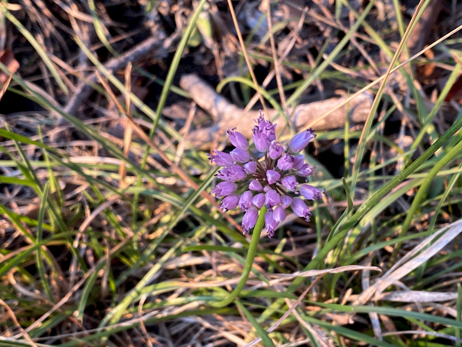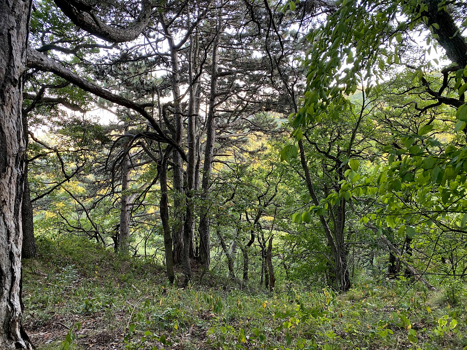 Oben angekommen präsentierte sich der primäre Schwarzföhrenwald mit seinen schirmförmigen Kronen in einem ganz anderen Erscheinungsbild als der restliche Wald. Im Unterwuchs entfaltete sich ein Trockenrasen mit einer bunten Mischung aus Berglauch (Allium lusitanicum), Duftskabiose (Scabiosa canescens) und Wiesen-Flockenblume (Centaurea jacea).