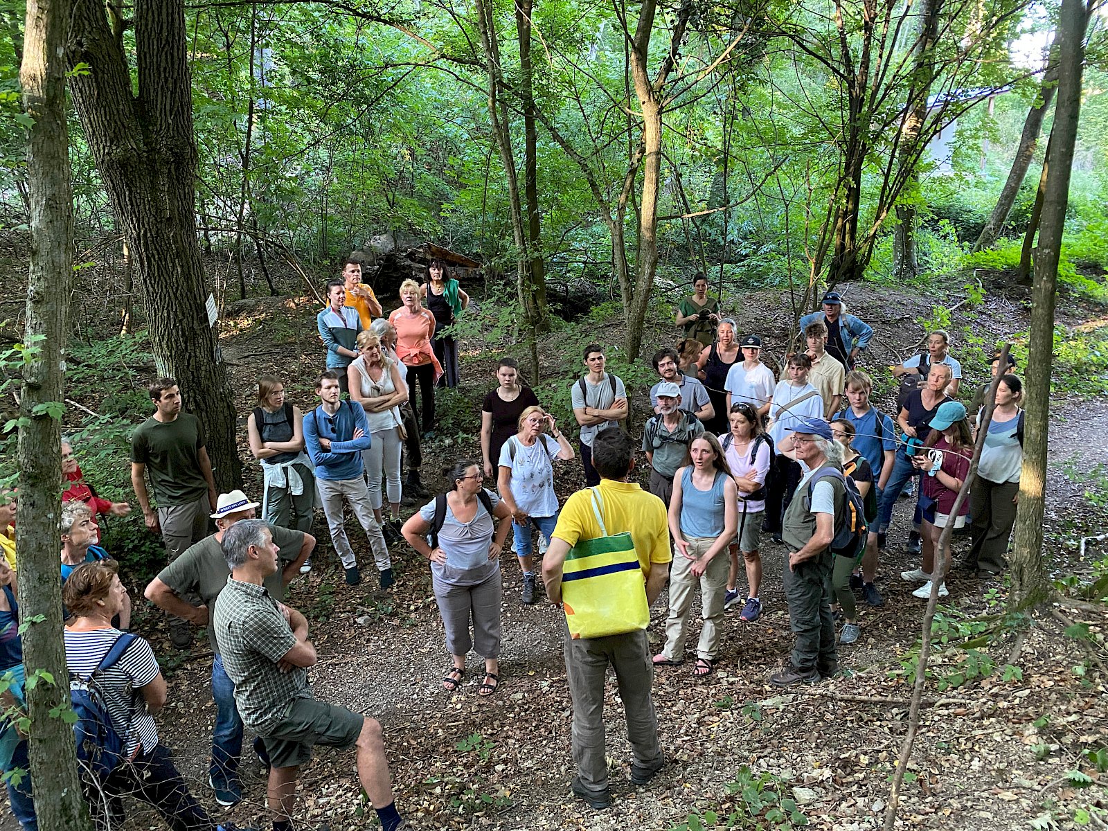 Die Führung führte die Teilnehmer:innen zunächst entlang des Waldsaumes und der angrenzenden Weinbaugebiete – begleitet von der Schwärzlichen Flockenblume (Centaurea nigrescens), die vor allem in den Übergangsbereichen zwischen Wald und Offenland vorkommt und in Österreich nur in Ostösterreich sowie in Kärnten verbreitet ist. Anschließend ging es weiter in den Kardinalgraben und hinauf entlang seines Kammes aus Dolomitgestein. Im Zuge der Kartierung wurde dieser ökologisch besonders wertvolle Teil des Perchtoldsdorfer Waldes als Naturwaldreservat ausgewiesen. Die Naturinteressierten konnten viel über die Bedeutung von absterbenden Bäumen und von Totholz als Lebensraum für bedrohte Arten wie den Hirschkäfer (Lucanus cervus) und der Alpenbock (Rosalia alpina) erfahren.