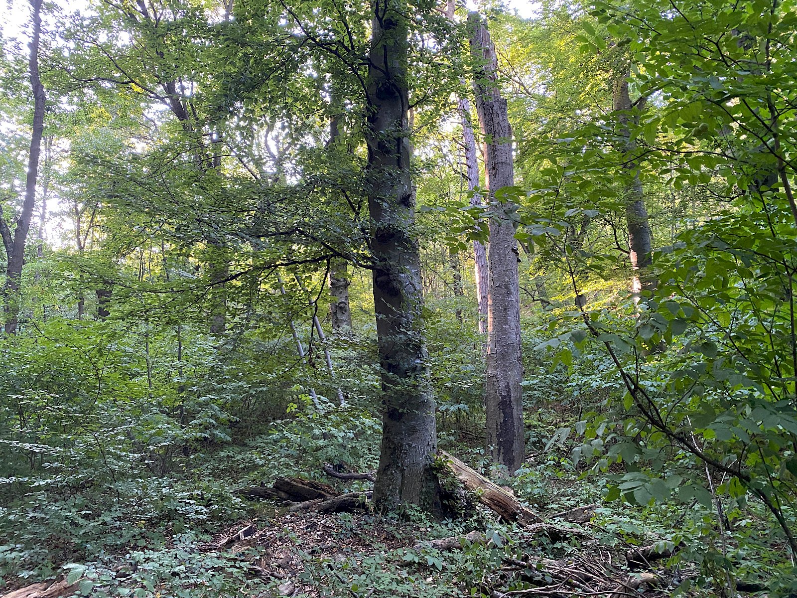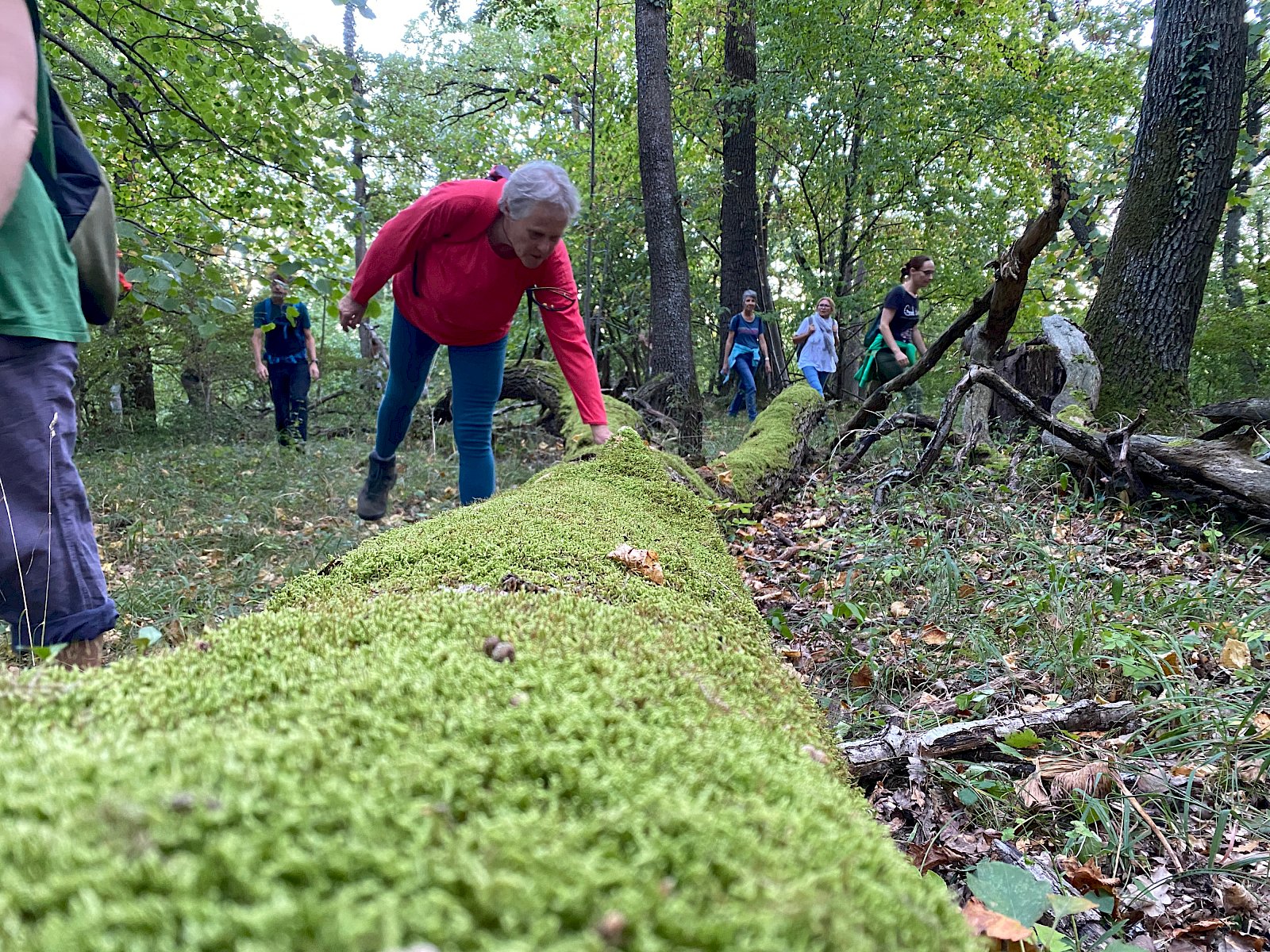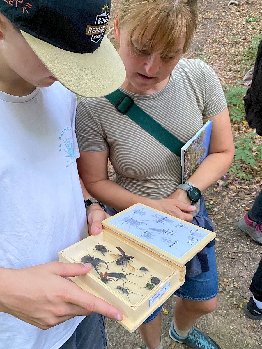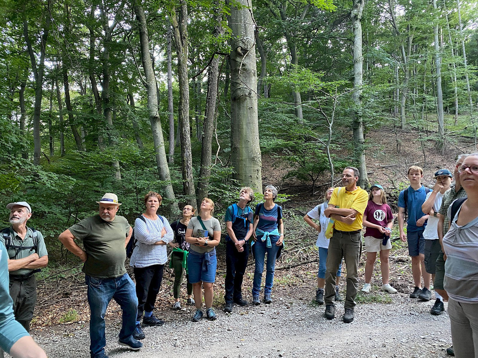 Nachdem die Naturinteressierten den Kamm erfolgreich erklommen hatten, führte der Weg an den Forschungsprojektflächen für Waldentwicklung und Biodiversität des BVW Connect vorbei. Dabei handelt es sich um wirtschaftlich ungenutzte Waldflächen mit besonderer Zusammensetzung und hoher ökologischer Bedeutung. Sie dienen als Waldtrittsteine für seltene und anspruchsvolle Arten wie Schwarzspecht (Dryocopus martius), Mittelspecht (Leiopicus medius), Weißrückenspecht (Dendrocopos leucotos) sowie Waldkauz (Strix aluco) und Uhu (Bubo bubo). Diese Arten sind auf reichlich Totholz und die darin vorkommenden Insekten angewiesen. Durch Bilder und Präparate wurde den Teilnehmer:innen die Vielfalt des Waldes noch anschaulicher vermittelt.