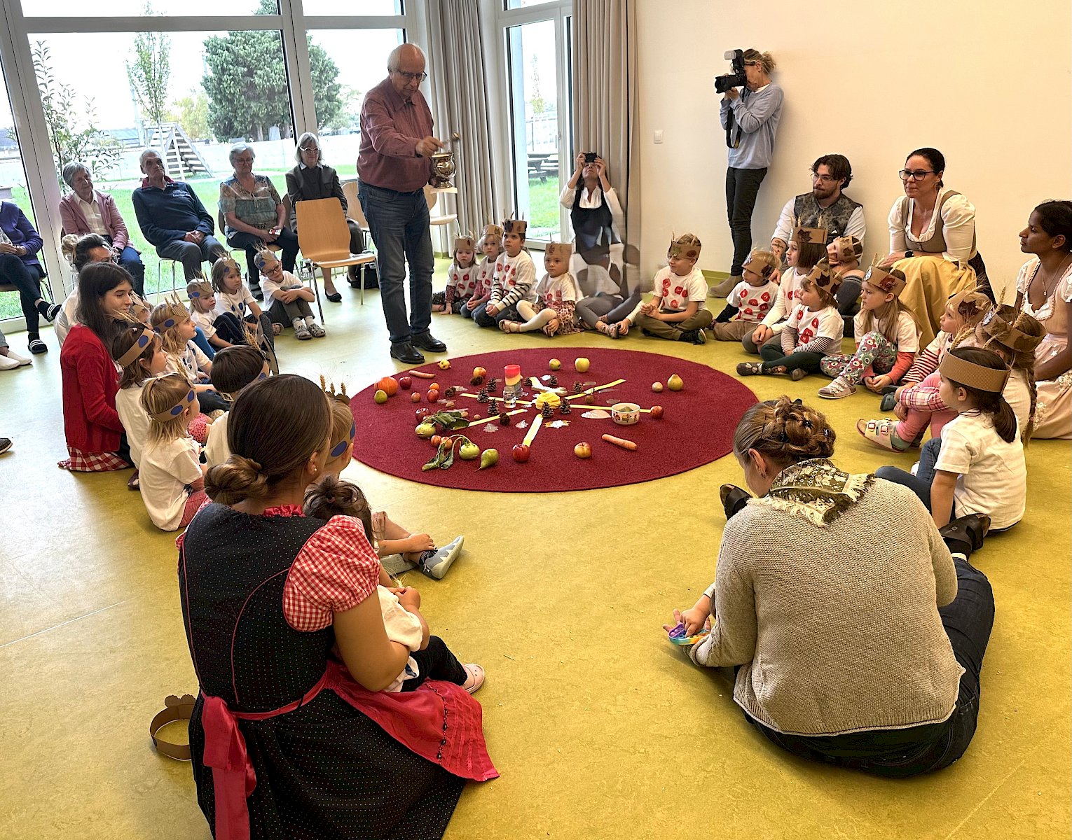 Die heutige Feier stand ganz im Zeichen des Erntedanks: die "Zwetschken" und die "Apfel" - Gruppe mit bunt gestalteten T-Shirts und Erntedankkronen trug gut gelaunt und mit viel Freude Lieder vor und Pfarrer Karl Seethaler segnete das mitgebrachte Obst und Gemüse. Bei soviel Engagement des Kindergarten Teams ist klar: der Titel "Naturpark Kindergarten" wurde hier zu Recht verliehen!