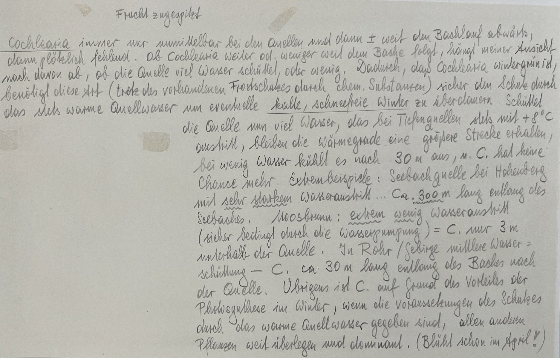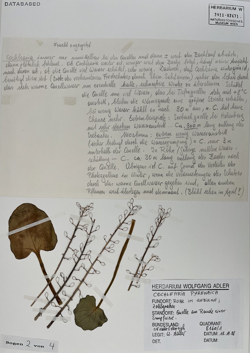 Ein besonders anschauliches Beispiel dafür ist der abgebildete Herbarbeleg aus dem Jahr 1988 von Botaniker Prof. Wolfgang Adler, der sehr detaillierte Anmerkungen zum Lebensraum und zu den Ansprüchen des weiter verbreiteten Pyrenäen-Löffelkrauts (Cochlearia pyrenaica) notierte, ergänzt durch Informationen zum endemischen Dickwurzel-Löffelkraut. „Nebenbei“ konnte Alex zudem einen ganzen Stapel Belege genauer bestimmen, bei denen zuvor nur die Gattung angeführt war. Darunter befanden sich auch einige sehr interessante endemische Arten aus der Slowakei, Rumänien, Frankreich, Spanien und Schottland.