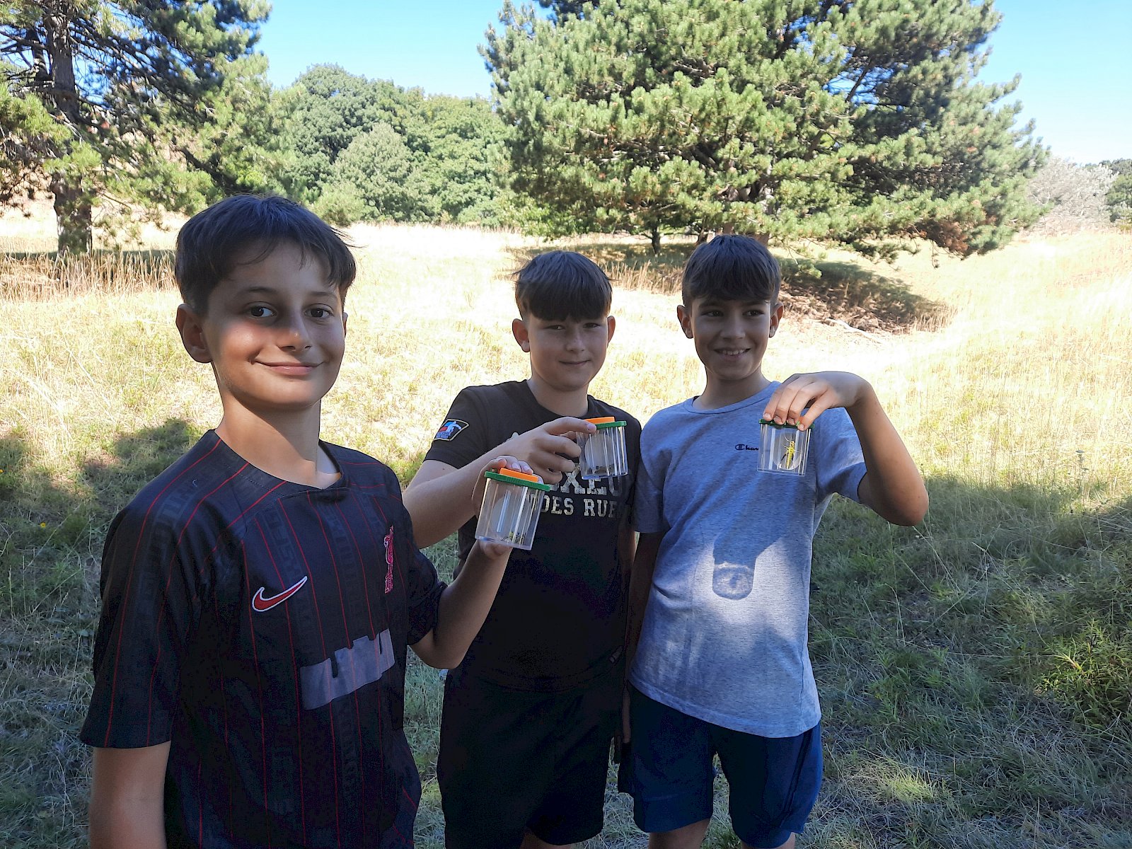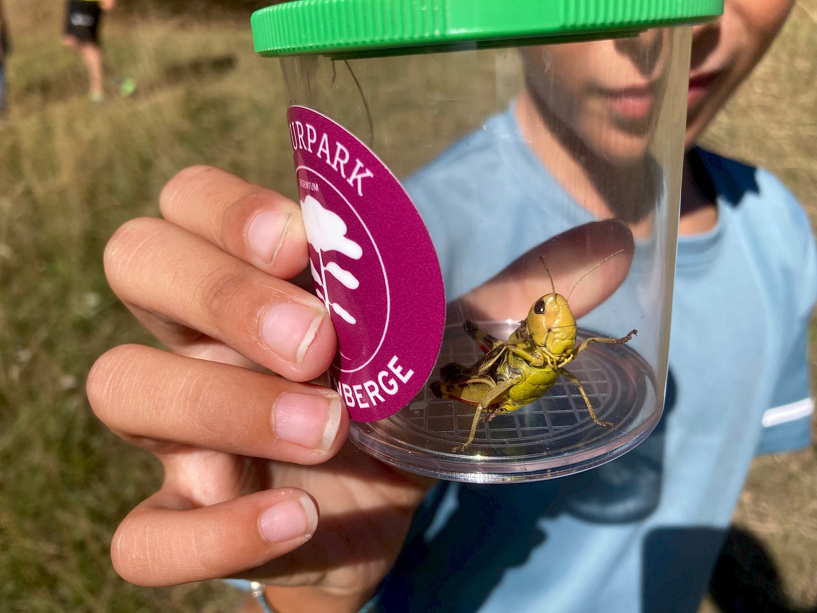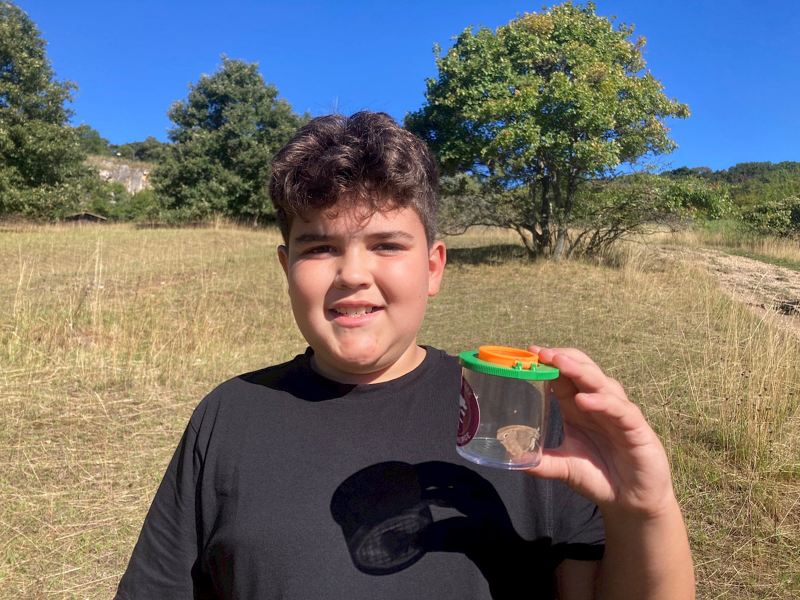 Bei der Insektensuche mit Becherlupen wurden die Kinder selbst zu Forscher:innen und konnten den Trockenrasen nach spannenden Insekten absuchen. Dabei entdeckten sie unter anderem Große Höckerschrecken (Arcyptera fusca), Grüne Heupferde (Tettigonia viridissima), Große Ochsenaugen (Maniola jurtina), Gottesanbeterinnen (Mantis religiosa) und viele mehr.
