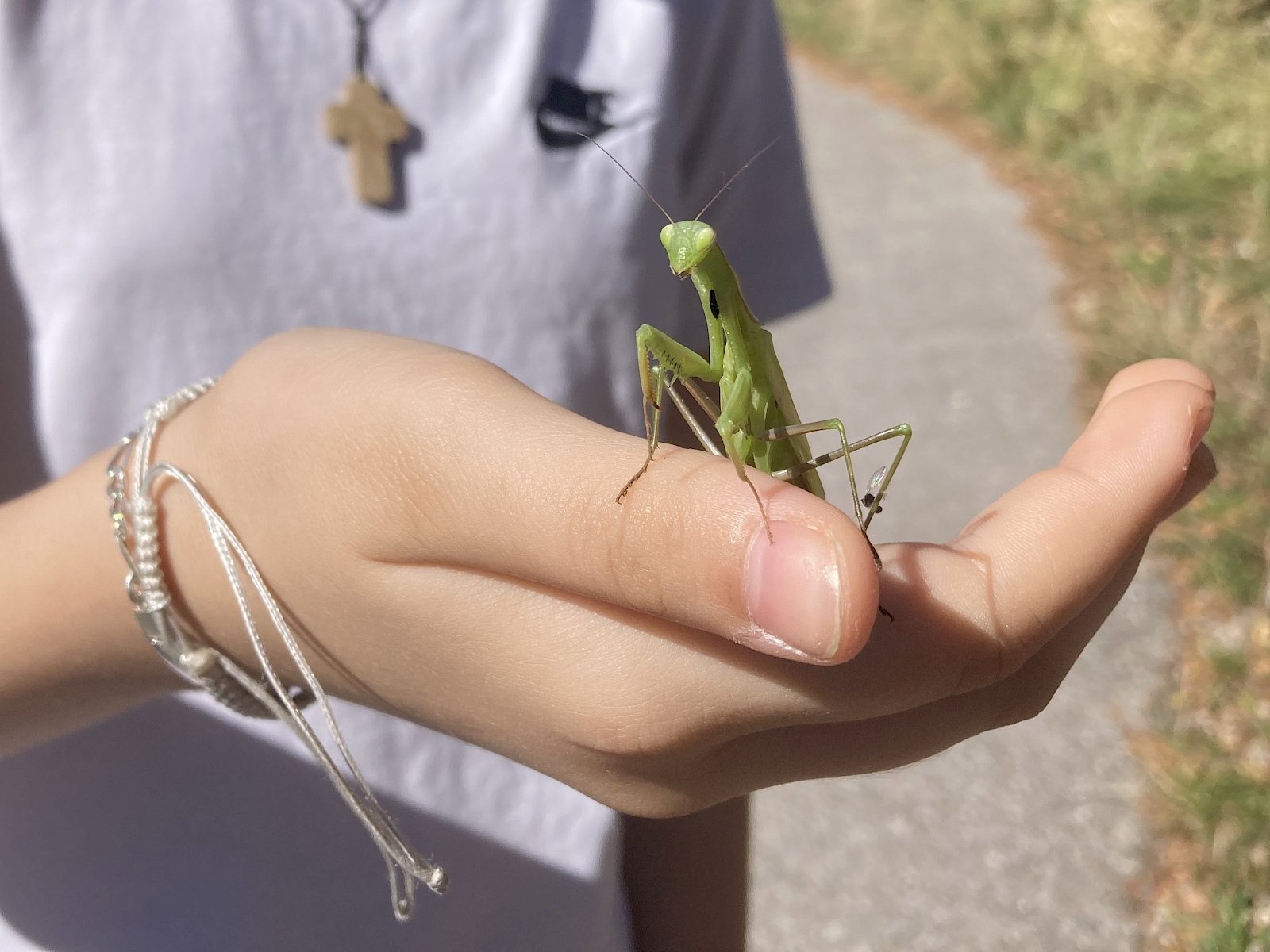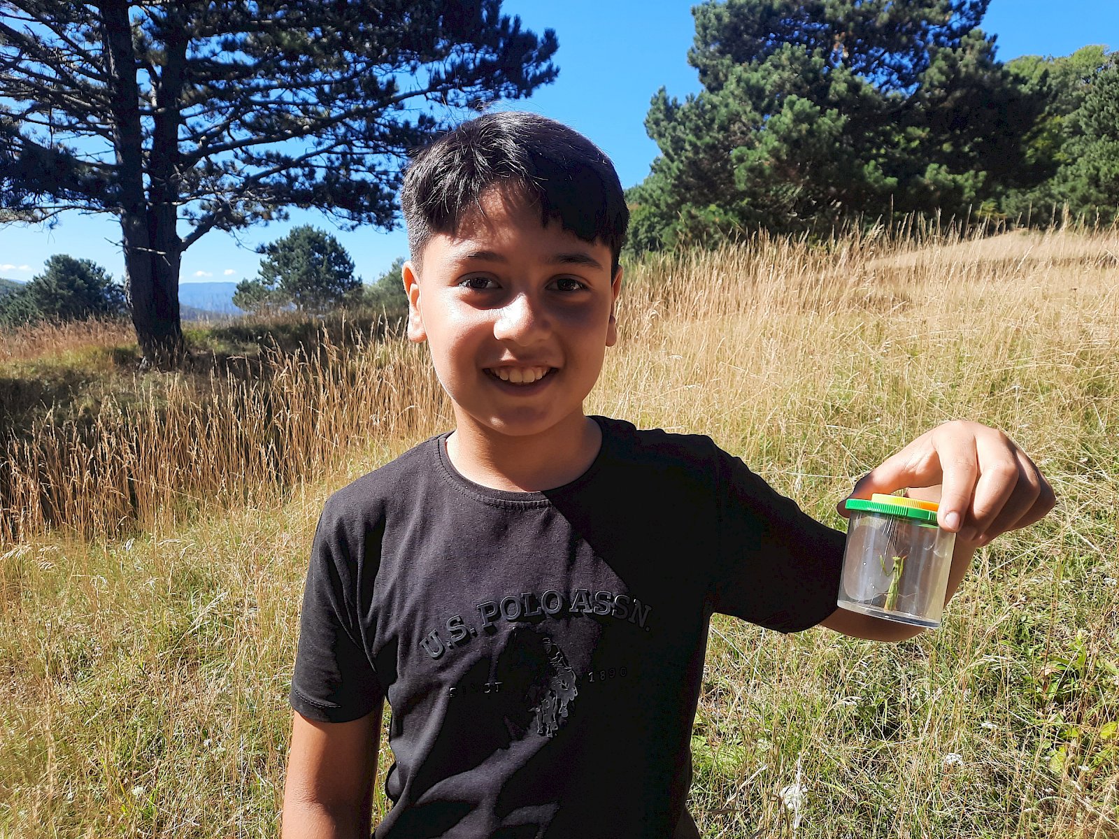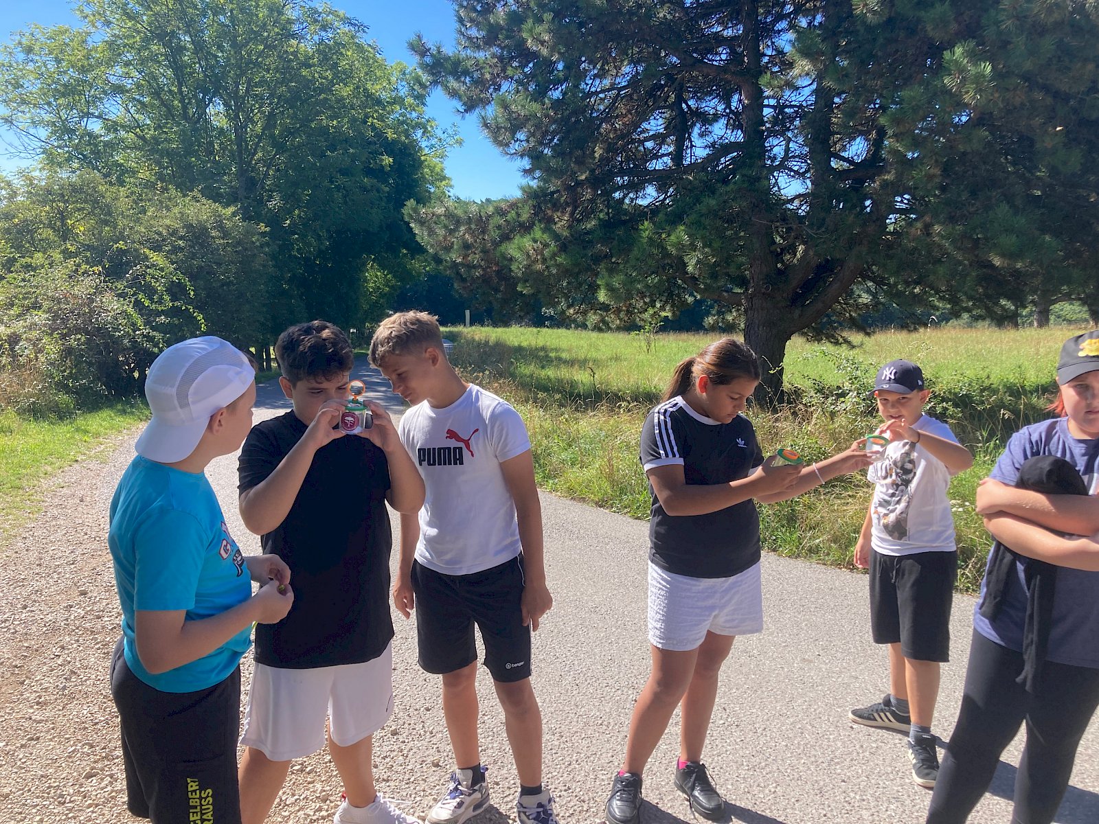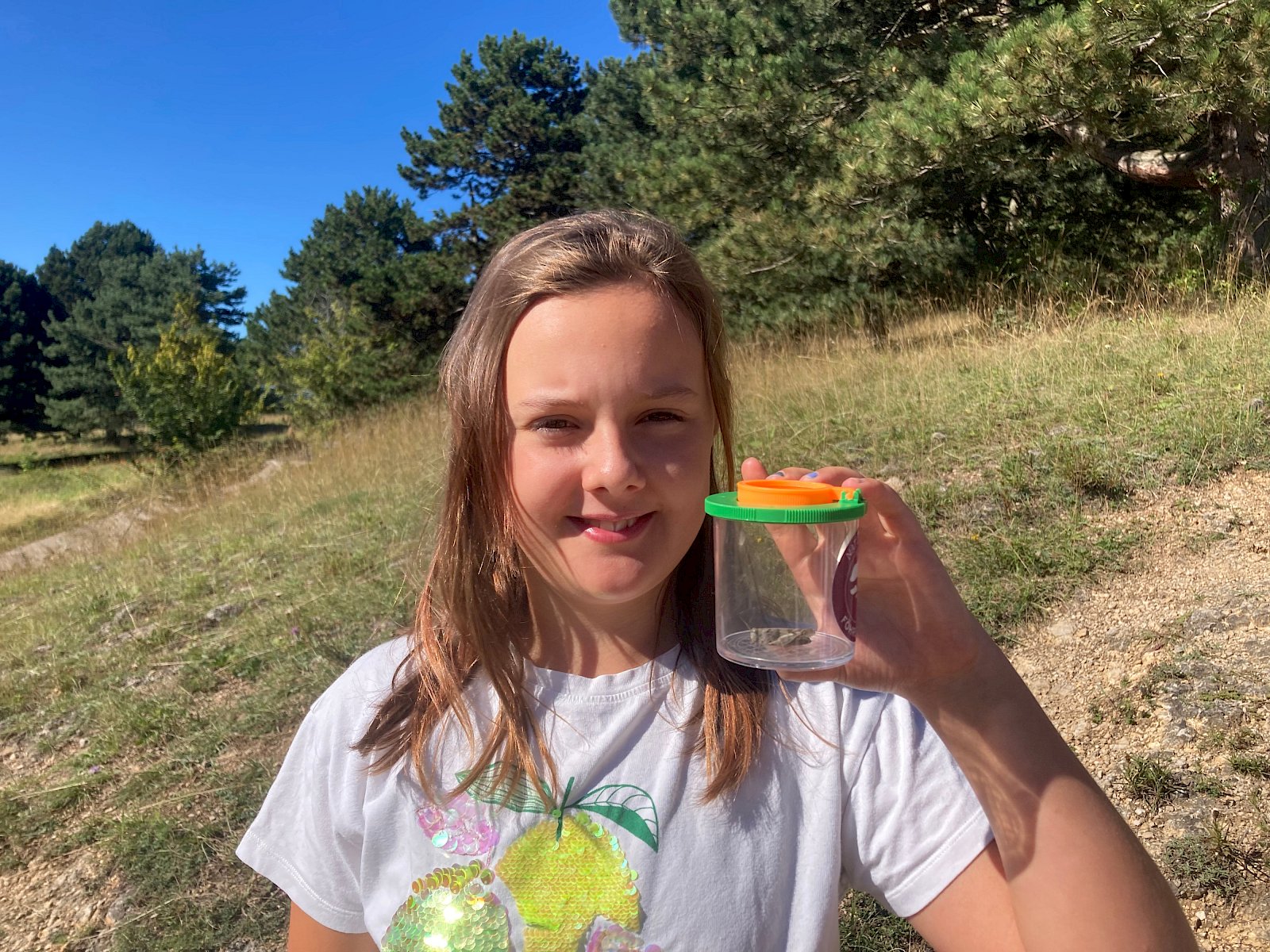 Bei der Insektensuche mit Becherlupen wurden die Kinder selbst zu Forscher:innen und konnten den Trockenrasen nach spannenden Insekten absuchen. Dabei entdeckten sie unter anderem Große Höckerschrecken (Arcyptera fusca), Grüne Heupferde (Tettigonia viridissima), Große Ochsenaugen (Maniola jurtina), Gottesanbeterinnen (Mantis religiosa) und viele mehr.