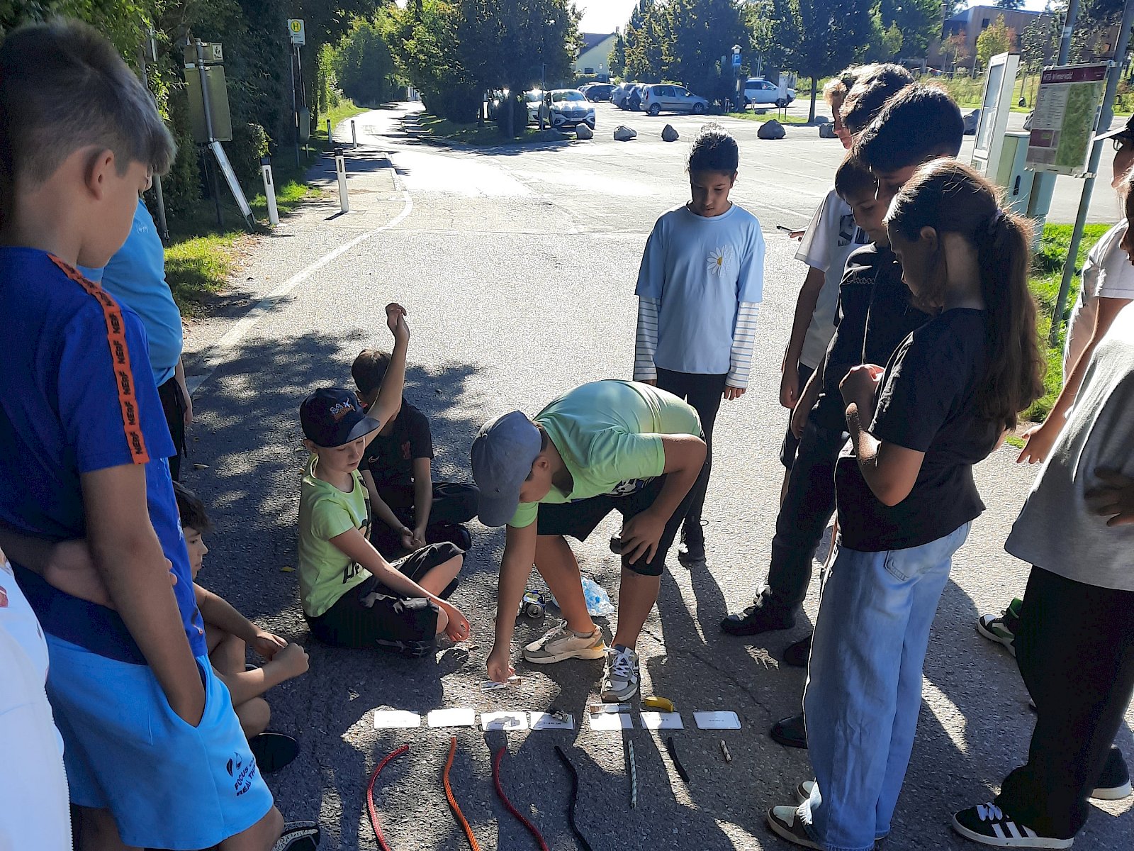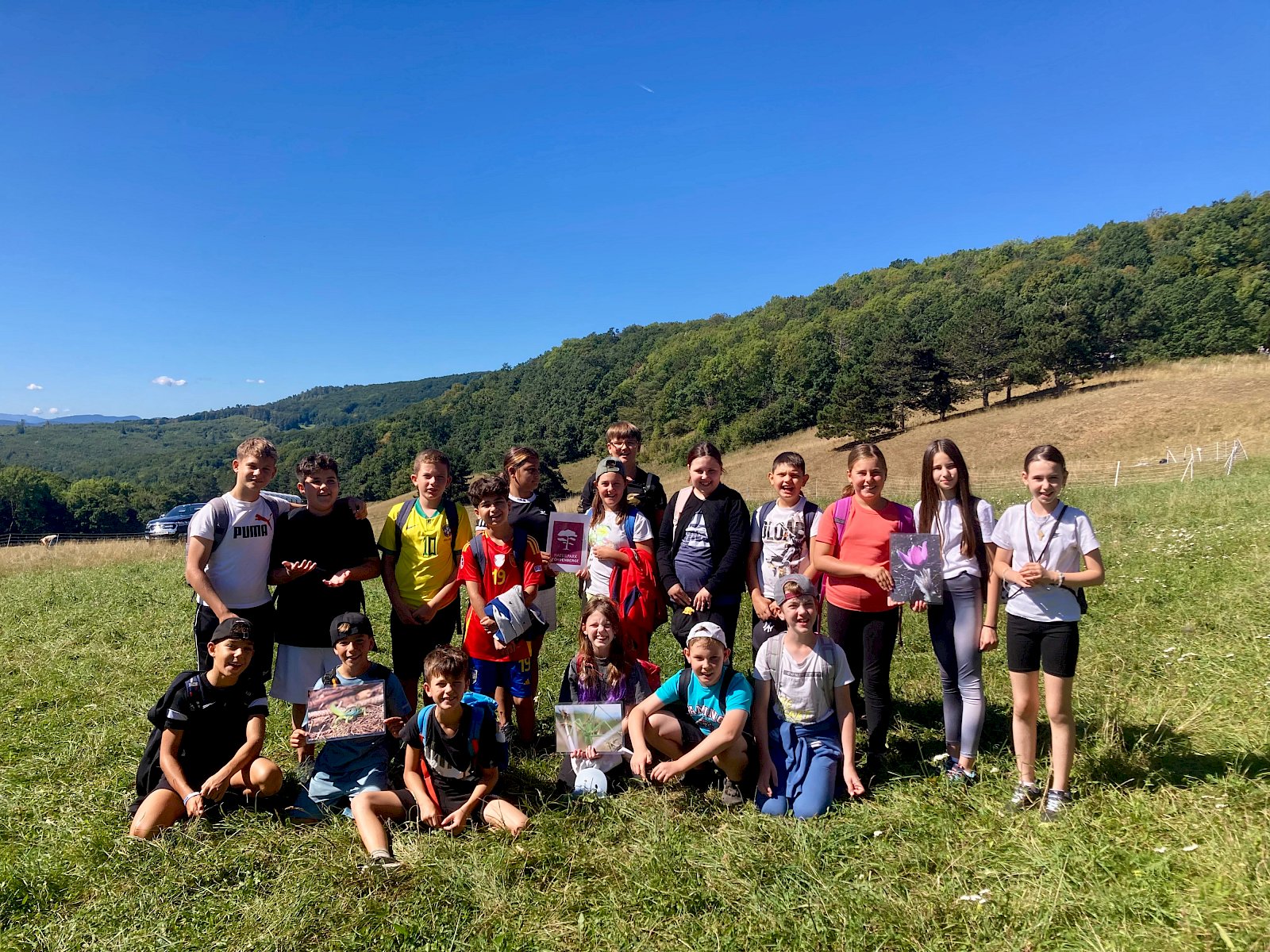 Die Kinder lernten die vier Säulen der Naturparke – Bildung, Schutz, Regionalentwicklung und Erholung – spielerisch kennen und durften sich beim Pantomime-Spiel versuchen: hier wurde das Thema Trockenrasen mittels verschiedener zu erratender Gegenstände vermittelt. An einer weiteren Station erfuhren die Schüler:innen die unterschiedliche Verrottungsdauer von Müll in der Natur. „Wie lange dauert es, bis eine Zigarette ,verschwunden' ist?" „Und wie lange bleibt eine Plastikflasche in der Landschaft?" „Wie lange bin ich im Vergleich dazu schon auf der Welt?" Das Zuordnen der Gegenstände war für die Kinder eine knifflige Aufgabe, die ihnen bewusst machte, wie wichtig es ist, Müll nicht in der Natur liegen zu lassen.
