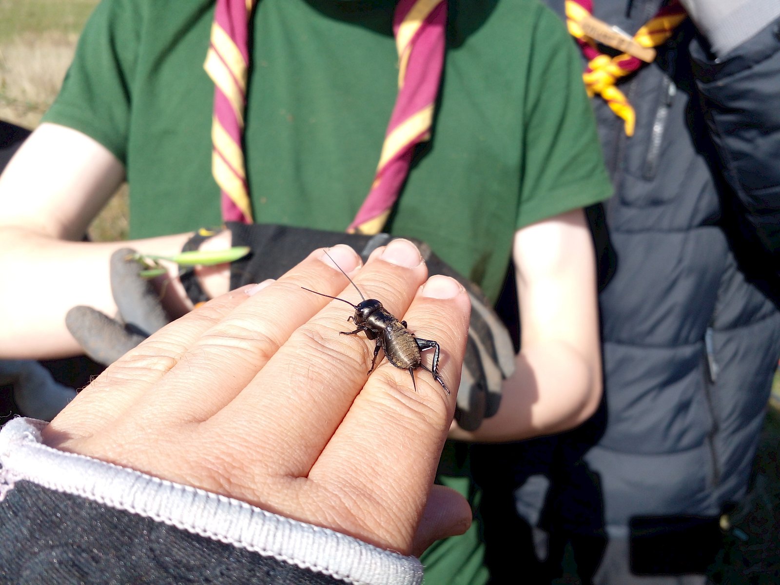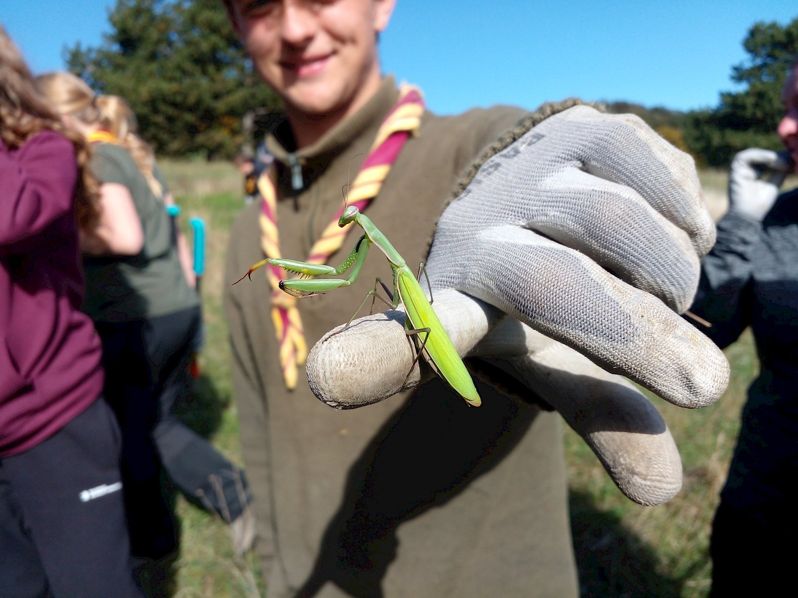Gemeinsam mit Norbert und unseren Praktikanten Torben und Stefan wurden kleine Büsche, wie jungen Eichen und Rosen geschnitten und Brombeeren ausgehackt. Diese drohen die offenen Flächen zu verbuschen und müssen daher regelmäßig entfernt werden. Das Wetter war prächtig und so konnte neben der Arbeit auch viel Interessantes entdeckt werden: eine Gottesanbeterin (Mantis religiosa) wärmte sich in den herbstlichen Sonnenstrahlen und auch ihr Gelege (Oothek) wurde gefunden. Auch ein paar Feldgrillen (Gryllus campestris) krabbelten aus ihren Erdbauten und besonders schön war die Blüte einiger Exemplare der Schwarzen Wiesen-Küchenschelle (Pulsatilla pratensis (subsp. nigricans)).
