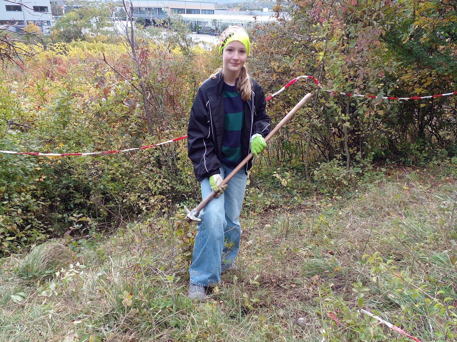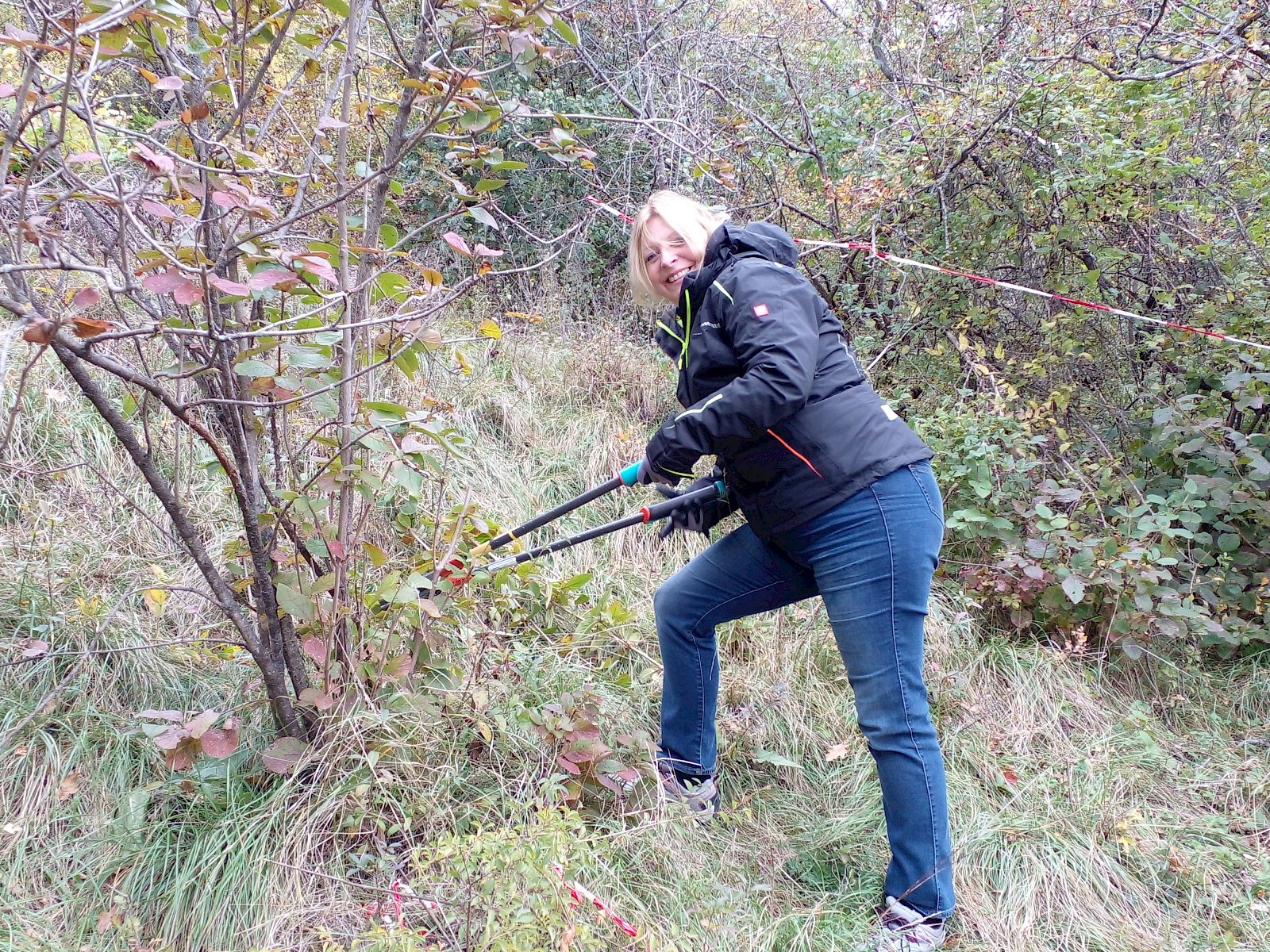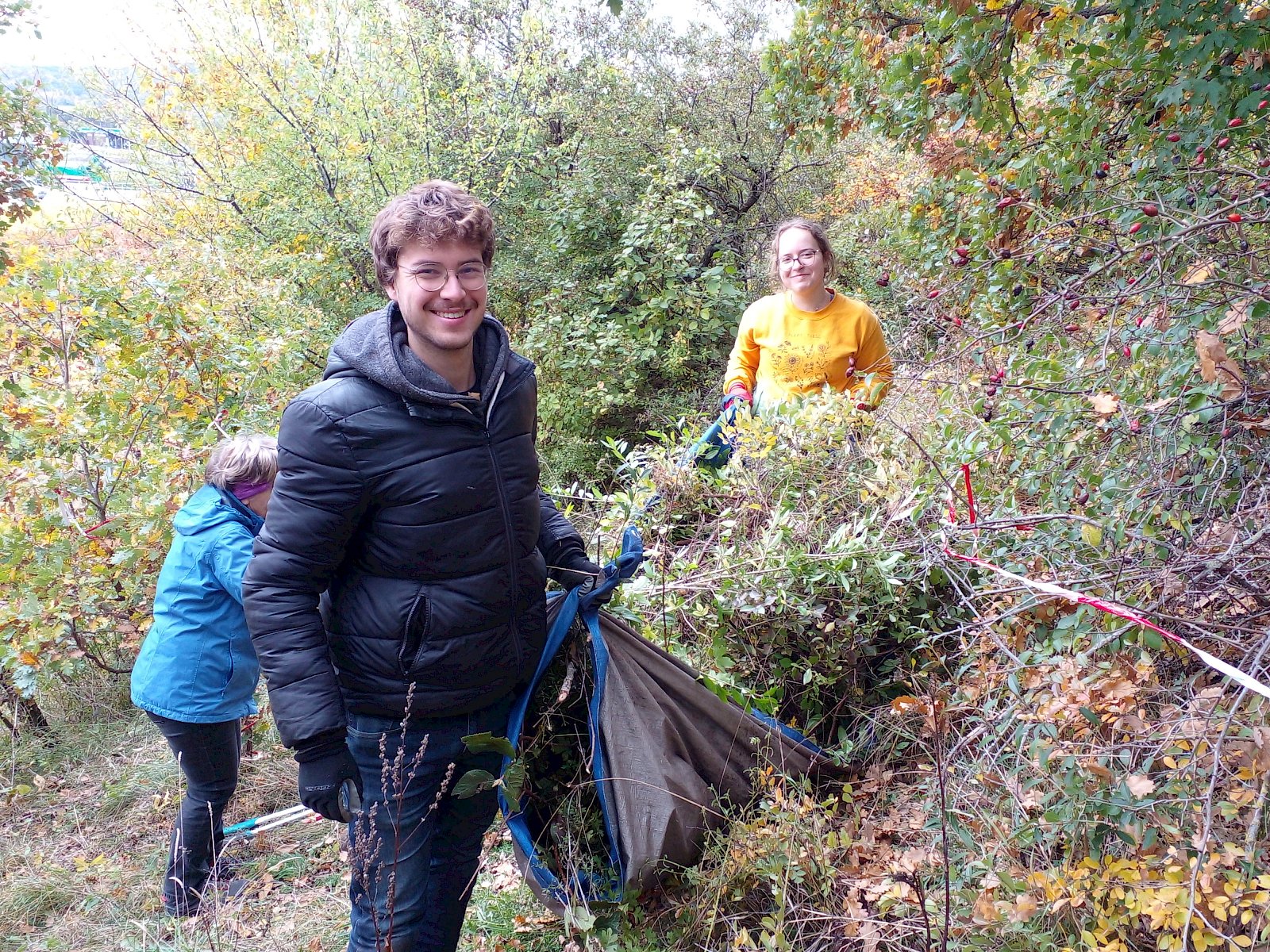 Vormittags teilten wir uns in zwei Gruppen. Nach einer kurzen fachlichen Einführung durch unsere Naturpädagog:innen Felix und Norbert, bei der wir viel Spannendes zur Geschichte des Trockenrasens und dessen Bewohner erfuhren ging es auch schon los. Die Pfadfinder:innen Gruppe machte sich mit voller Einsatzbereitschaft ans Werk und schnitt Liguster, Waldrebe und Roten Hartriegel, die den Trockenrasen sonst überwuchern und seltene Arten, wie die Große Kuhschelle (Pulsatilla grandis), verdrängen würden. Die erwachsenen Pfadfinder:innen hackten Büsche mit dem Krampen aus. (zum Bericht der Pfadfinder:innen geht es hier). Die zweite Gruppe, bestehend aus drei Praktikant:innen des LPVs, und sechs weiteren Personen der lokalen Bevölkerung entfernten ebenfalls Liguster & Co. und ringelte unerwünschte Bäume um deren Nährstofftransport zu unterbrechen und diese zum Absterben zu bringen. So wird Licht und Platz für wertvolle Eichen und andere Arten des Trockenrasens geschaffen.