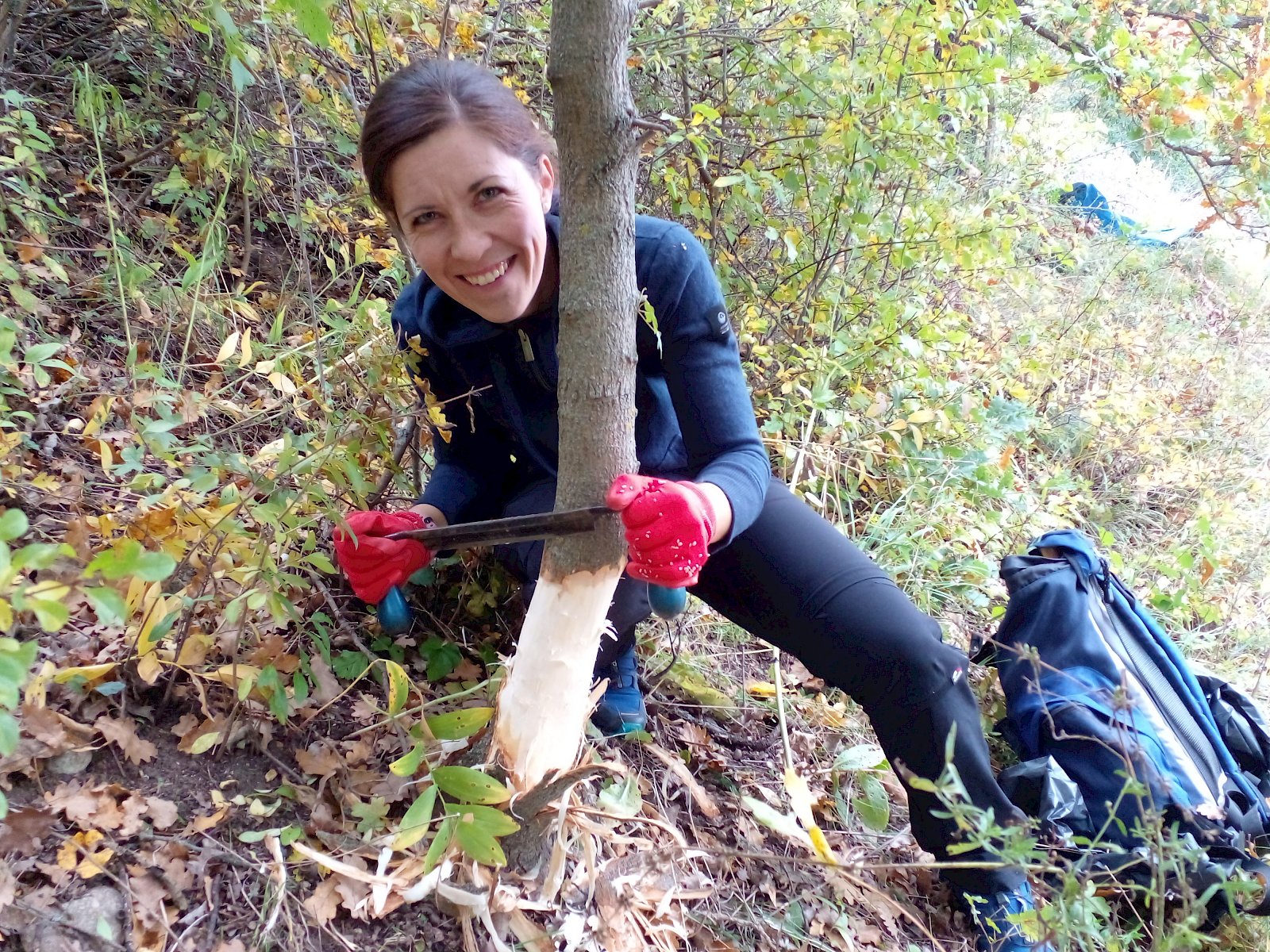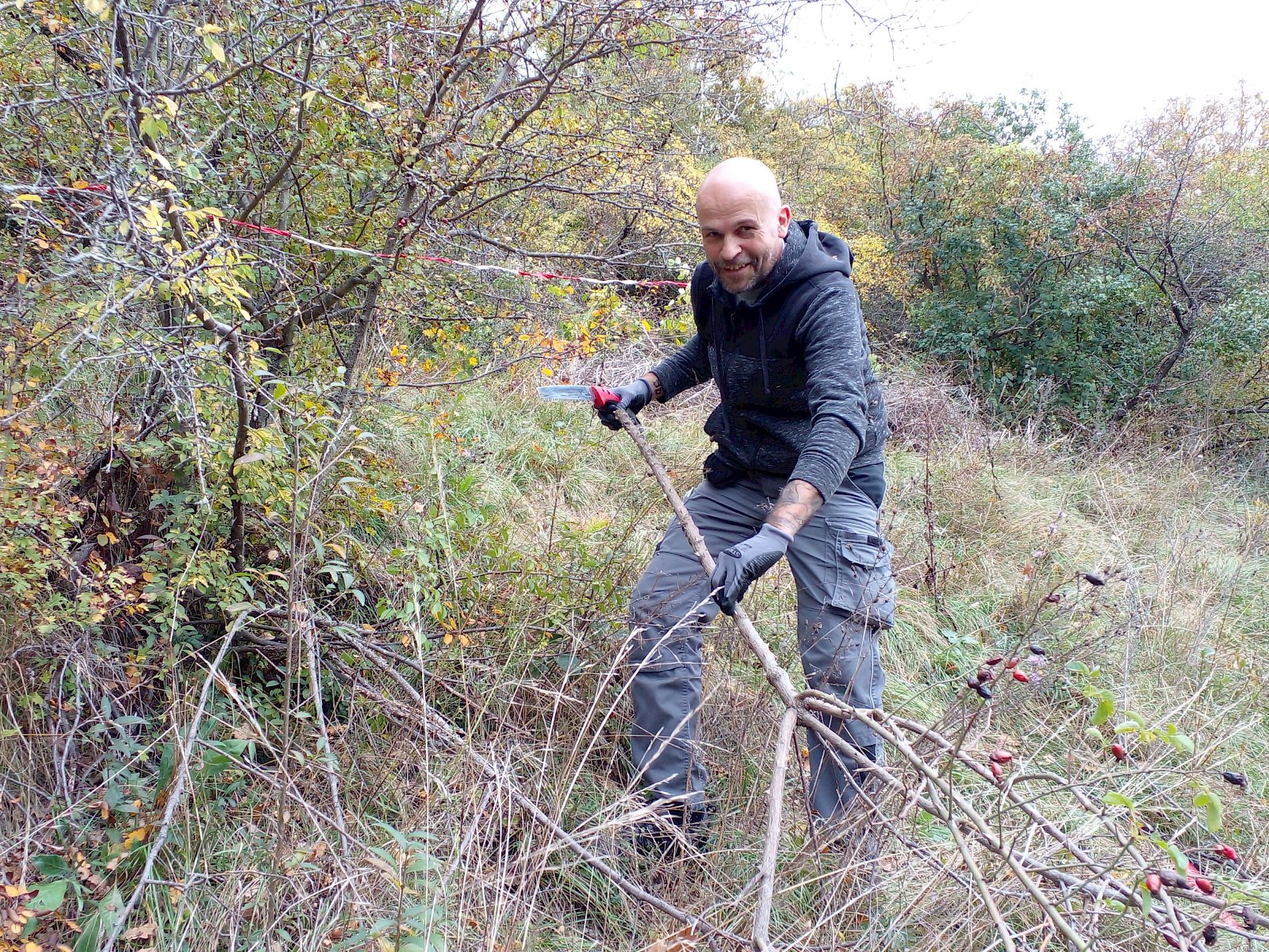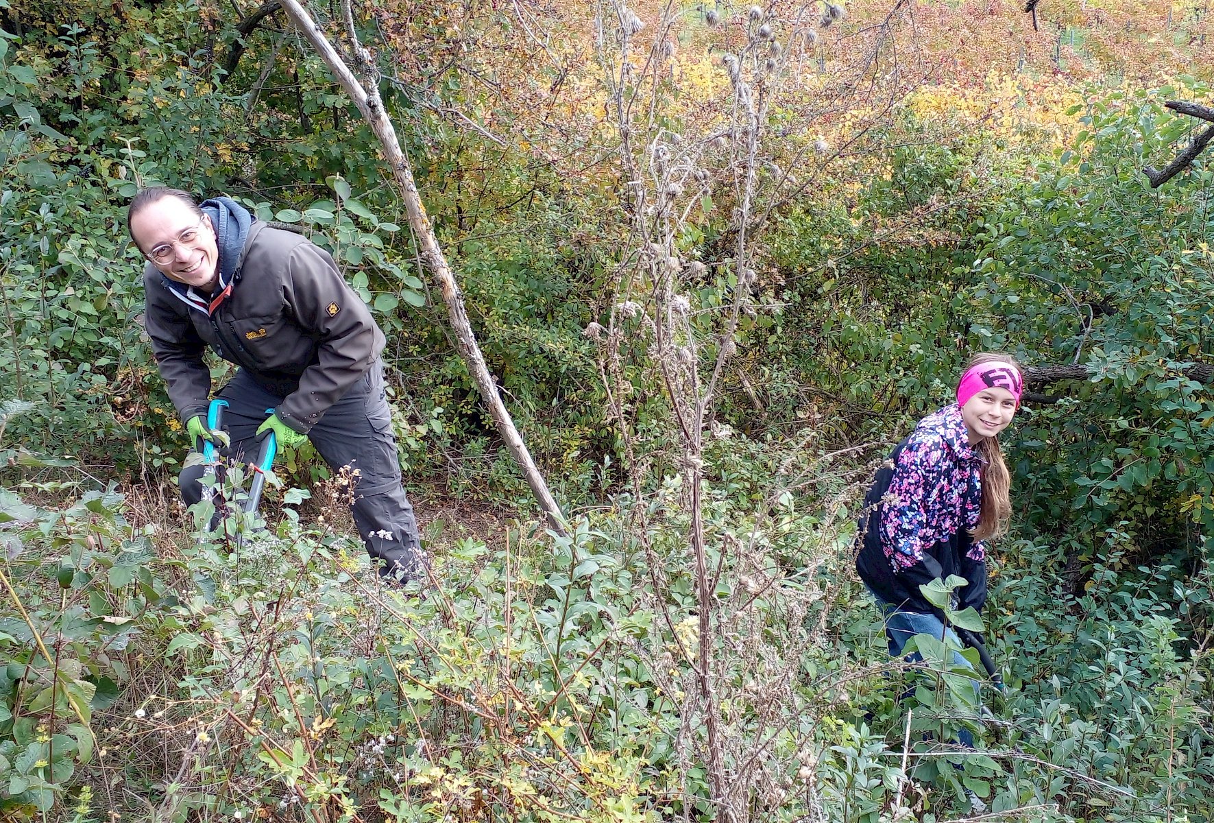 Vormittags teilten wir uns in zwei Gruppen. Nach einer kurzen fachlichen Einführung durch unsere Naturpädagog:innen Felix und Norbert, bei der wir viel Spannendes zur Geschichte des Trockenrasens und dessen Bewohner erfuhren ging es auch schon los. Die Pfadfinder:innen Gruppe machte sich mit voller Einsatzbereitschaft ans Werk und schnitt Liguster, Waldrebe und Roten Hartriegel, die den Trockenrasen sonst überwuchern und seltene Arten, wie die Große Kuhschelle (Pulsatilla grandis), verdrängen würden. Die erwachsenen Pfadfinder:innen hackten Büsche mit dem Krampen aus. (zum Bericht der Pfadfinder:innen geht es hier). Die zweite Gruppe, bestehend aus drei Praktikant:innen des LPVs, und sechs weiteren Personen der lokalen Bevölkerung entfernten ebenfalls Liguster & Co. und ringelte unerwünschte Bäume um deren Nährstofftransport zu unterbrechen und diese zum Absterben zu bringen. So wird Licht und Platz für wertvolle Eichen und andere Arten des Trockenrasens geschaffen.