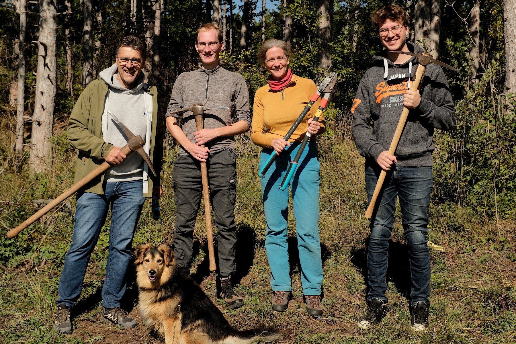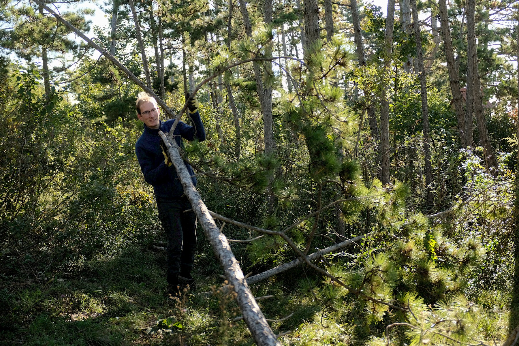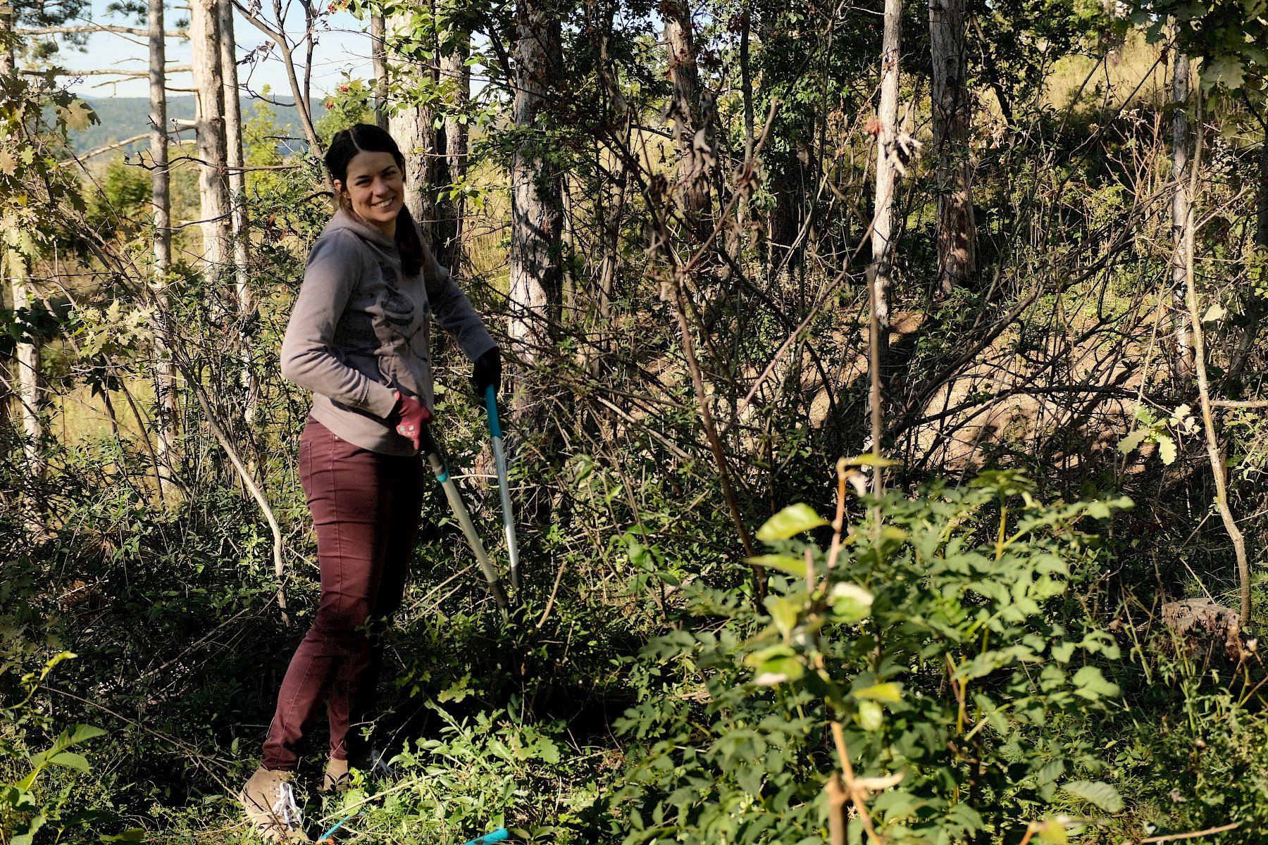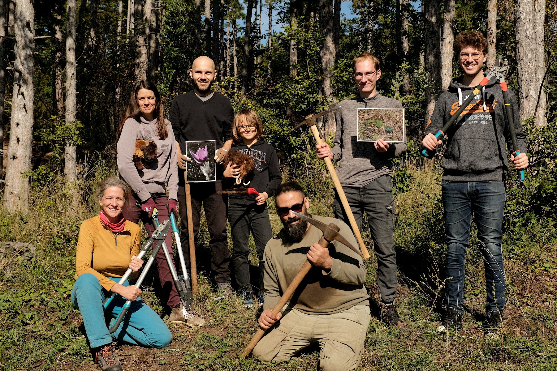 Gemeinsam wurde gesägt und mit dem Krampen und der Astschere gearbeitet. Das sonnige Herbstwetter begleitete die fleißigen Helfer:innen bis in den Nachmittag, sodass die Arbeit mit noch mehr Elan voran ging. Nebenbei war noch genug Zeit um einige besondere Funde zu beobachten und zu besprechen: die "flauschige" Raupe eines Schmetterling aus der Familie der Eulenfalter (Noctuidae), eine Steppen-Sattelschrecke (Ephippiger ephippiger) und die Rote Röhrenspinne (Ersus kollari) wurden entdeckt.