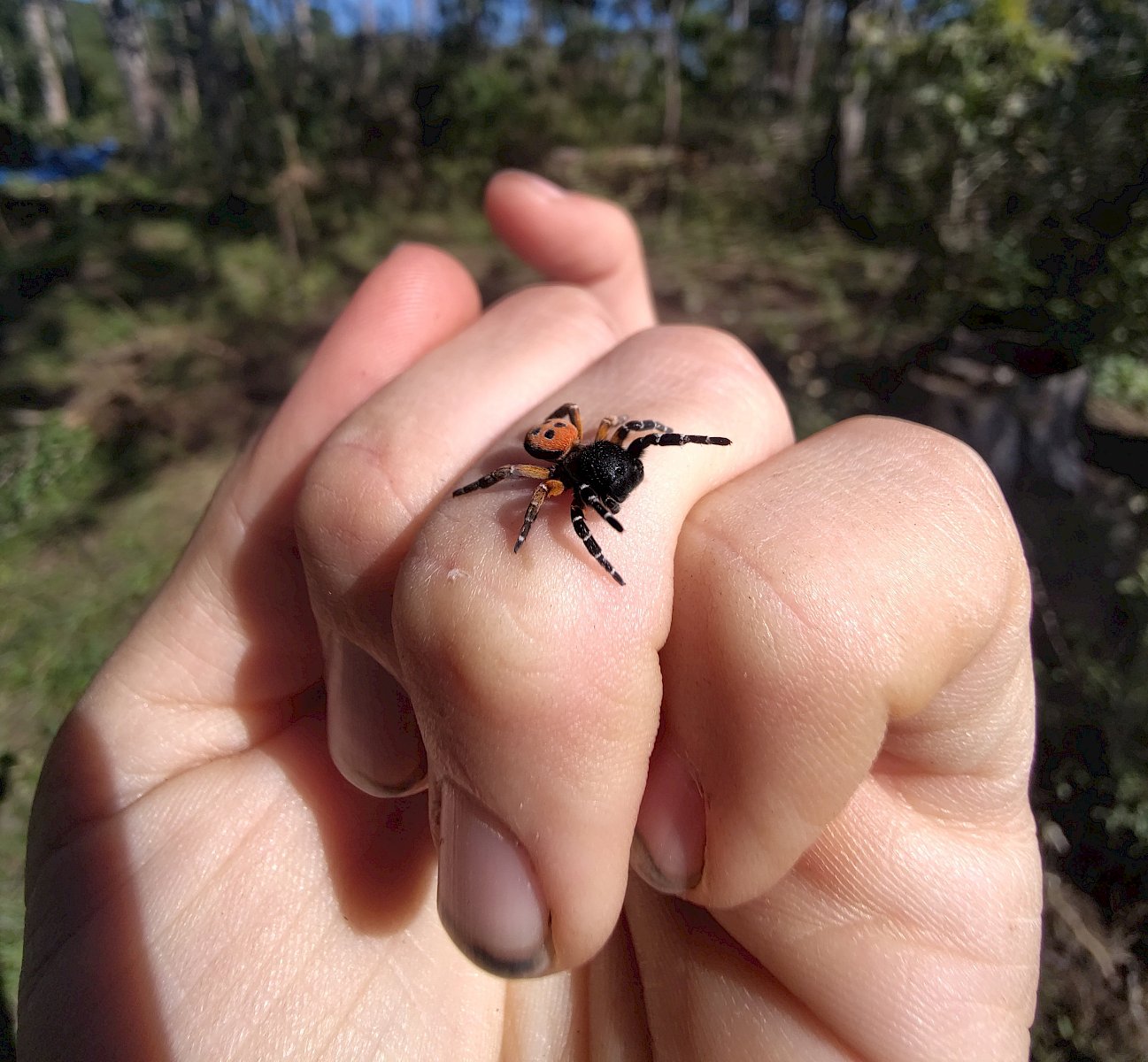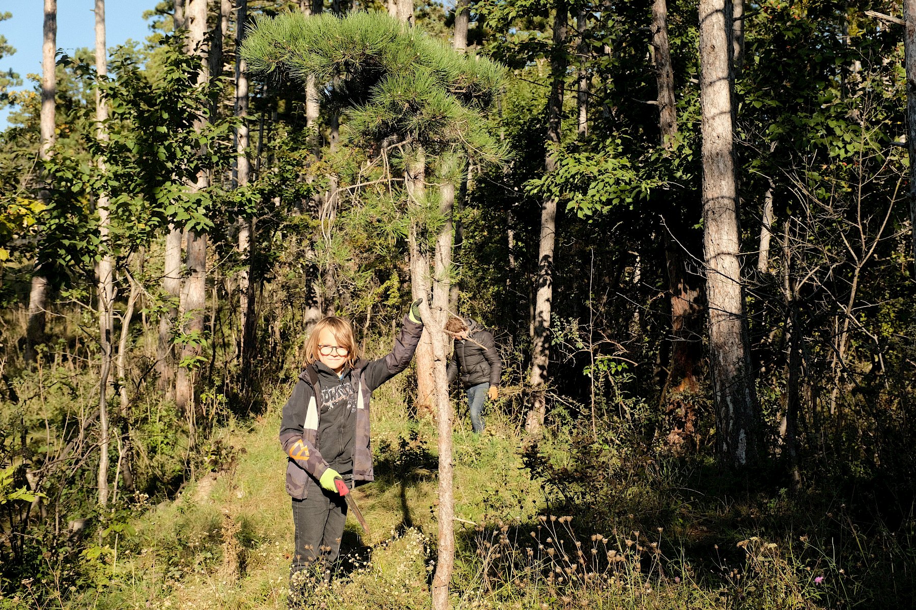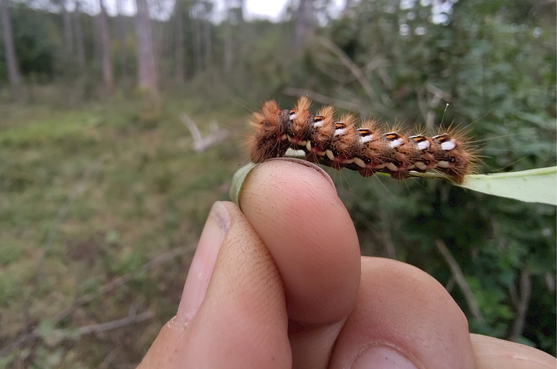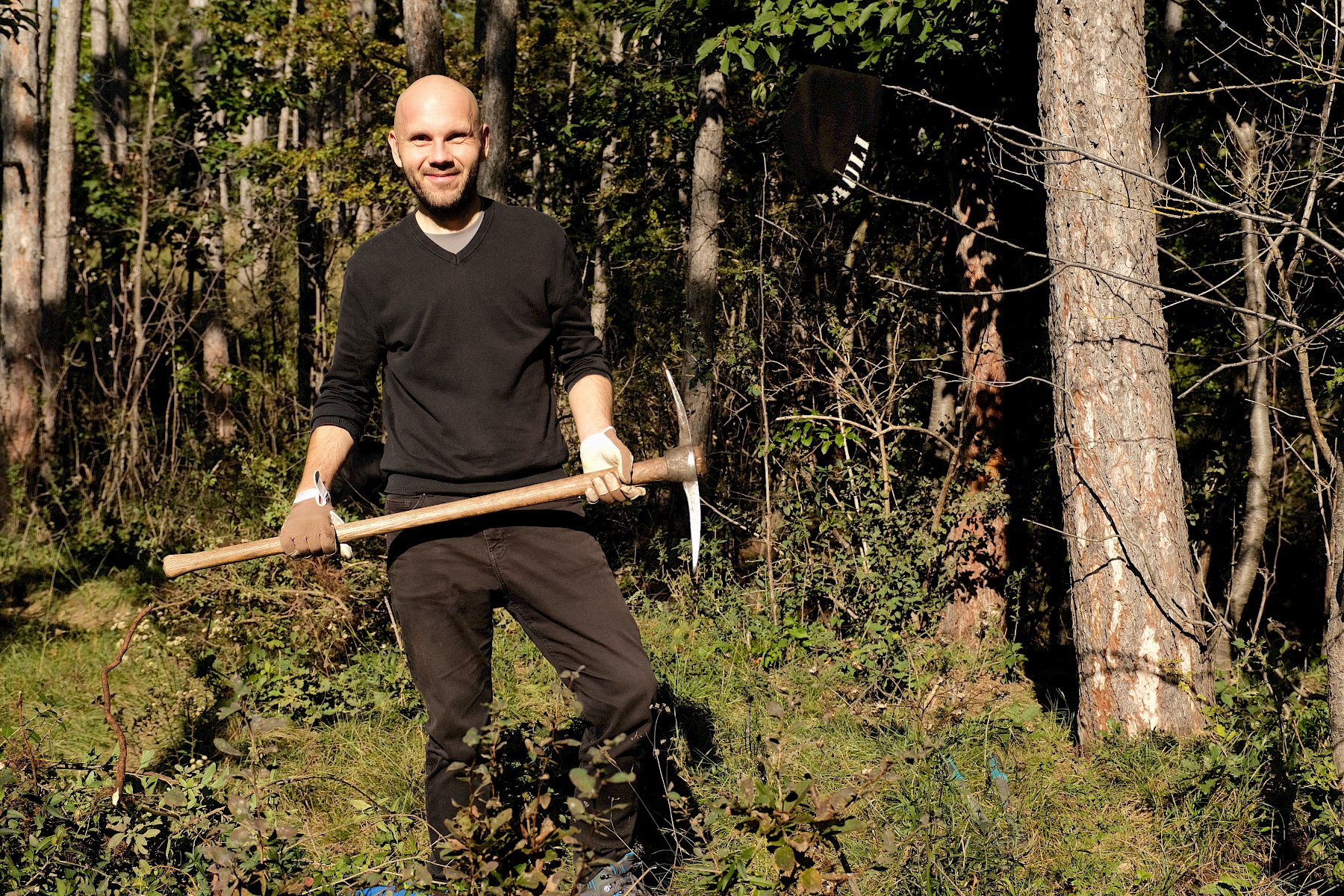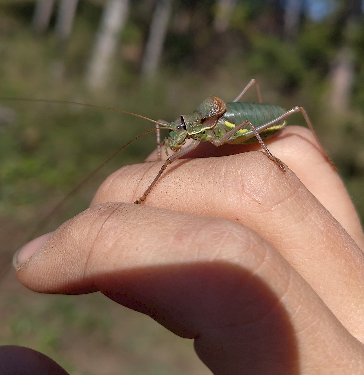 Gemeinsam wurde gesägt und mit dem Krampen und der Astschere gearbeitet. Das sonnige Herbstwetter begleitete die fleißigen Helfer:innen bis in den Nachmittag, sodass die Arbeit mit noch mehr Elan voran ging. Nebenbei war noch genug Zeit um einige besondere Funde zu beobachten und zu besprechen: die "flauschige" Raupe eines Schmetterling aus der Familie der Eulenfalter (Noctuidae), eine Steppen-Sattelschrecke (Ephippiger ephippiger) und die Rote Röhrenspinne (Ersus kollari) wurden entdeckt.