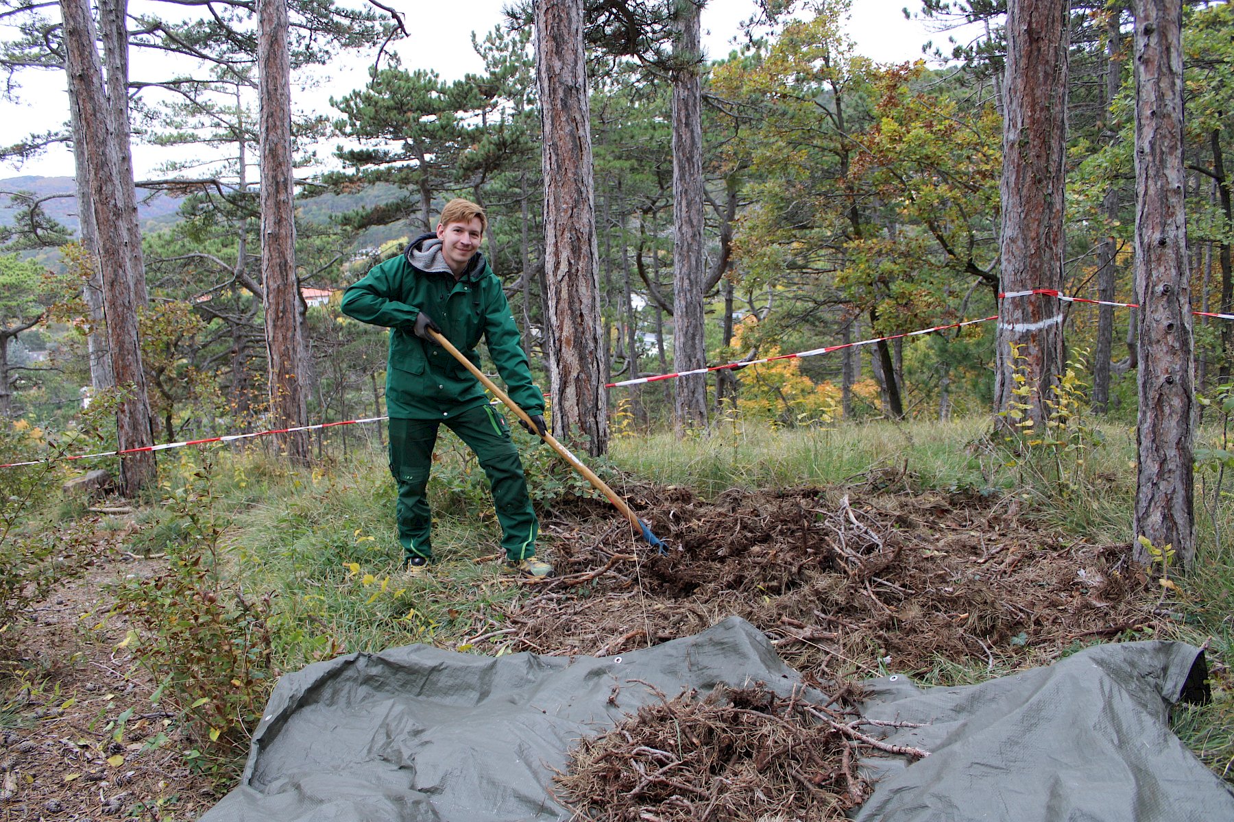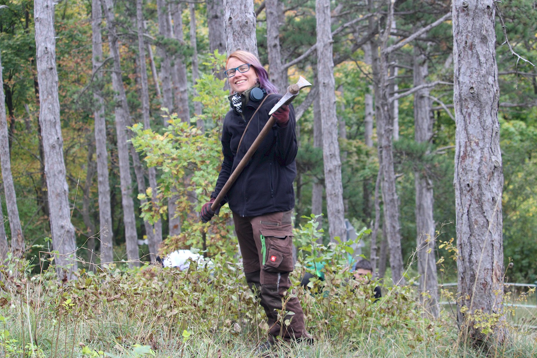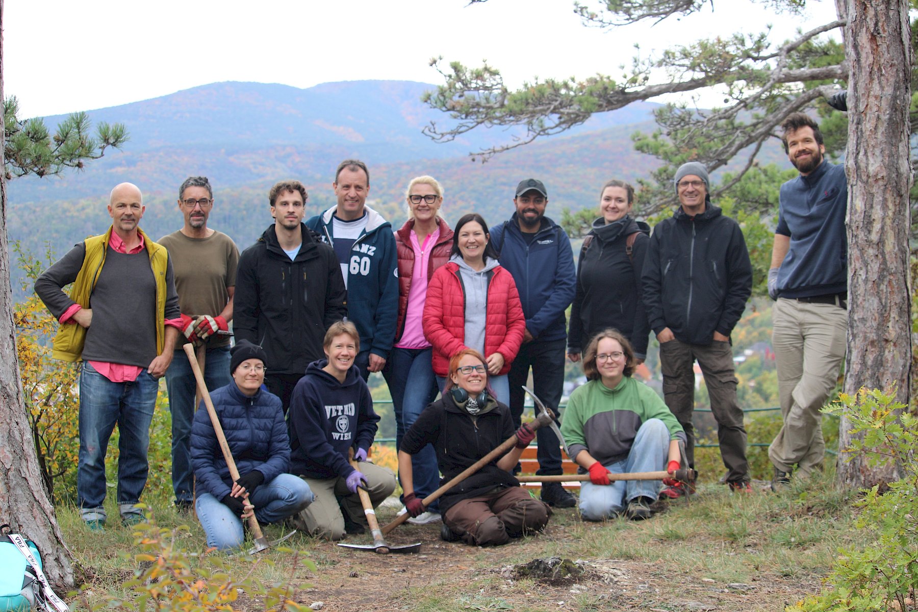 Von unserer Obfrau Irene Drozdowski gab es zunächst für alle eine eine fachliche Einführung zu den Trockenrasen und deren Bedeutung, sowie eine sorgfältige Einschulung zum Werkzeuggebrauch. Dann ging es auch schon los an die Arbeit und es wurden zwei Gruppen gebildet: die "Hacker" rund um unsere Biolog:innen Felix und Fischi machten sich ausgerüstet mit Krampen zur Fläche unterhalb der Ferdinand-Raimund-Aussicht auf, um dort Flieder samt Wurzeln auszuhacken. Die "Schneider" rund um unsere Biolog:innen Irene, Norbert und Luca und Praktikantin Magdalena schnitten Kleingehölze wie Liguster und Hartriegel auf den neuen Renaturierungsflächen.