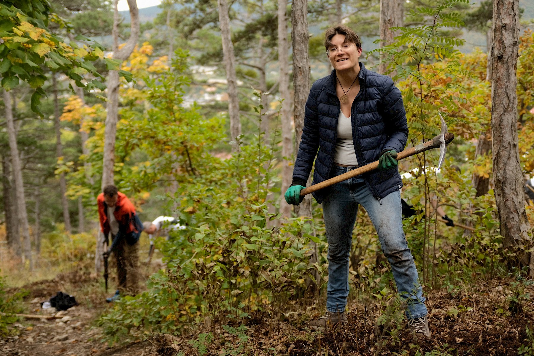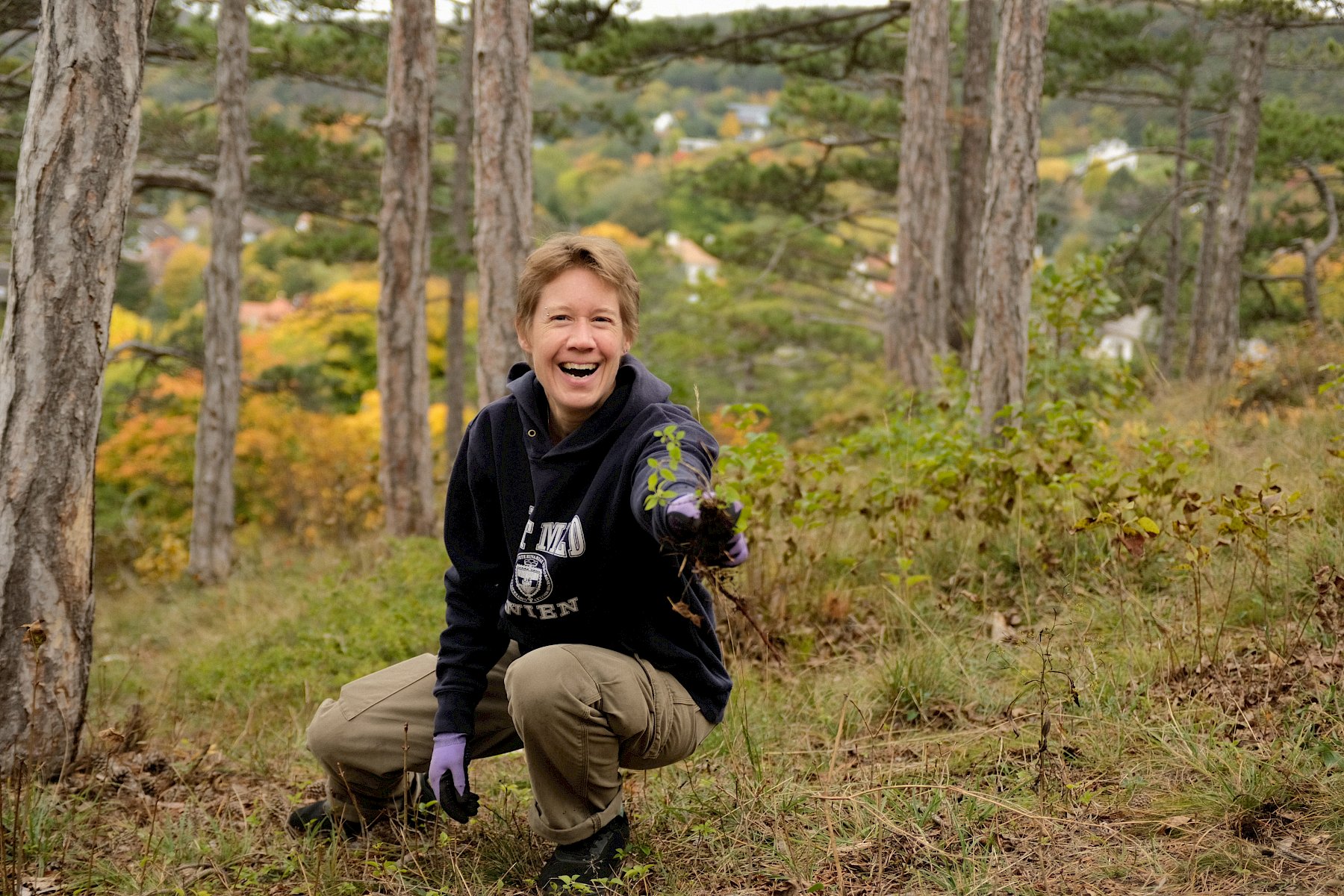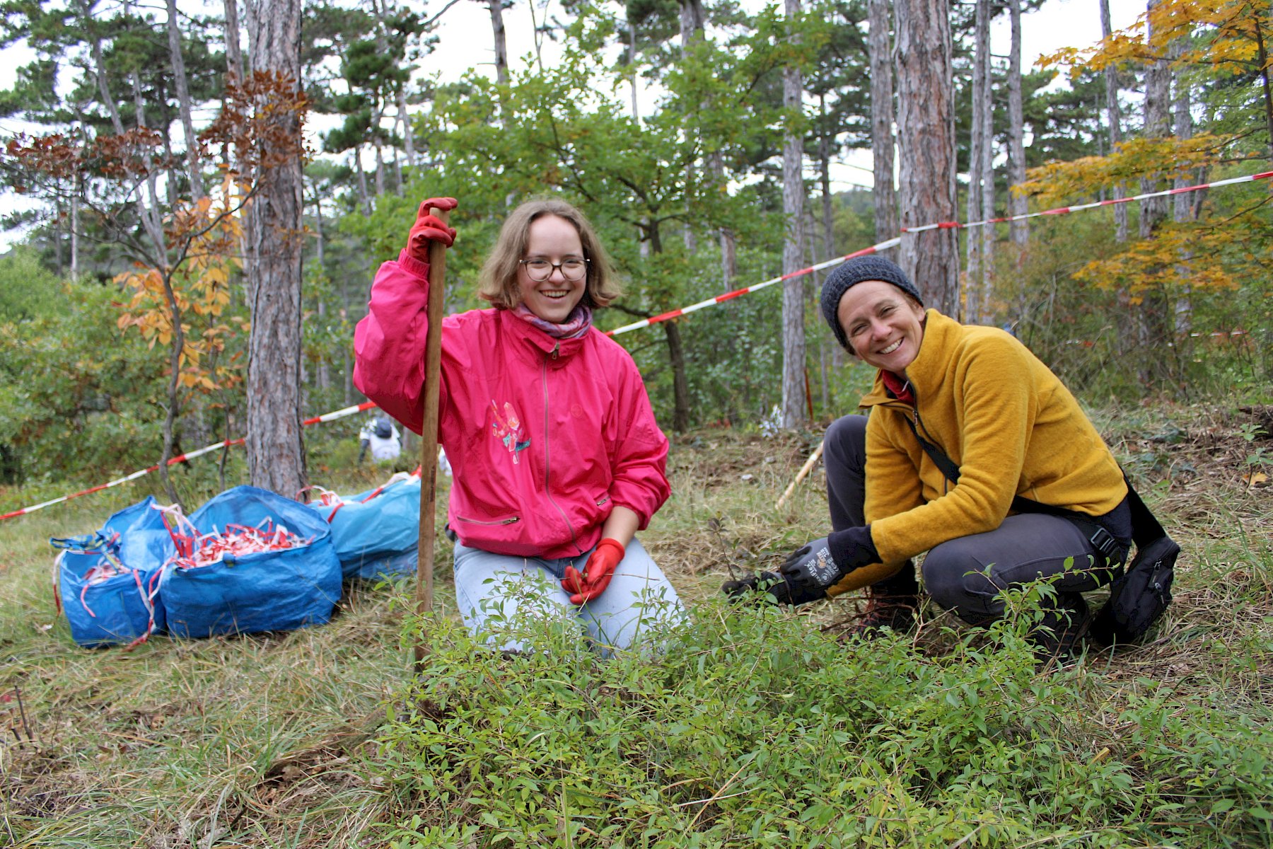Von unserer Obfrau Irene Drozdowski gab es zunächst für alle eine eine fachliche Einführung zu den Trockenrasen und deren Bedeutung, sowie eine sorgfältige Einschulung zum Werkzeuggebrauch. Dann ging es auch schon los an die Arbeit und es wurden zwei Gruppen gebildet: die "Hacker" rund um unsere Biolog:innen Felix und Fischi machten sich ausgerüstet mit Krampen zur Fläche unterhalb der Ferdinand-Raimund-Aussicht auf, um dort Flieder samt Wurzeln auszuhacken. Die "Schneider" rund um unsere Biolog:innen Irene, Norbert und Luca und Praktikantin Magdalena schnitten Kleingehölze wie Liguster und Hartriegel auf den neuen Renaturierungsflächen.