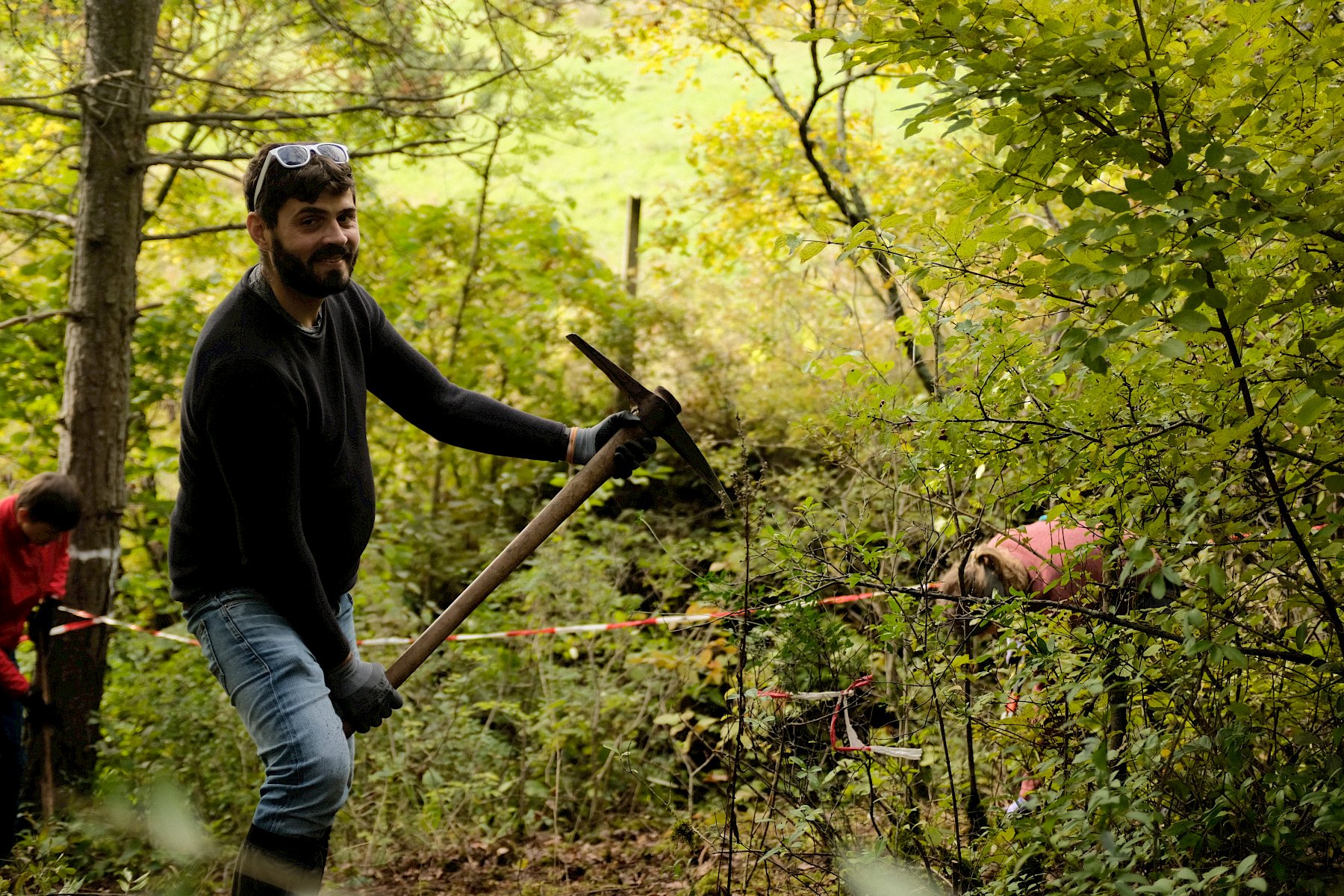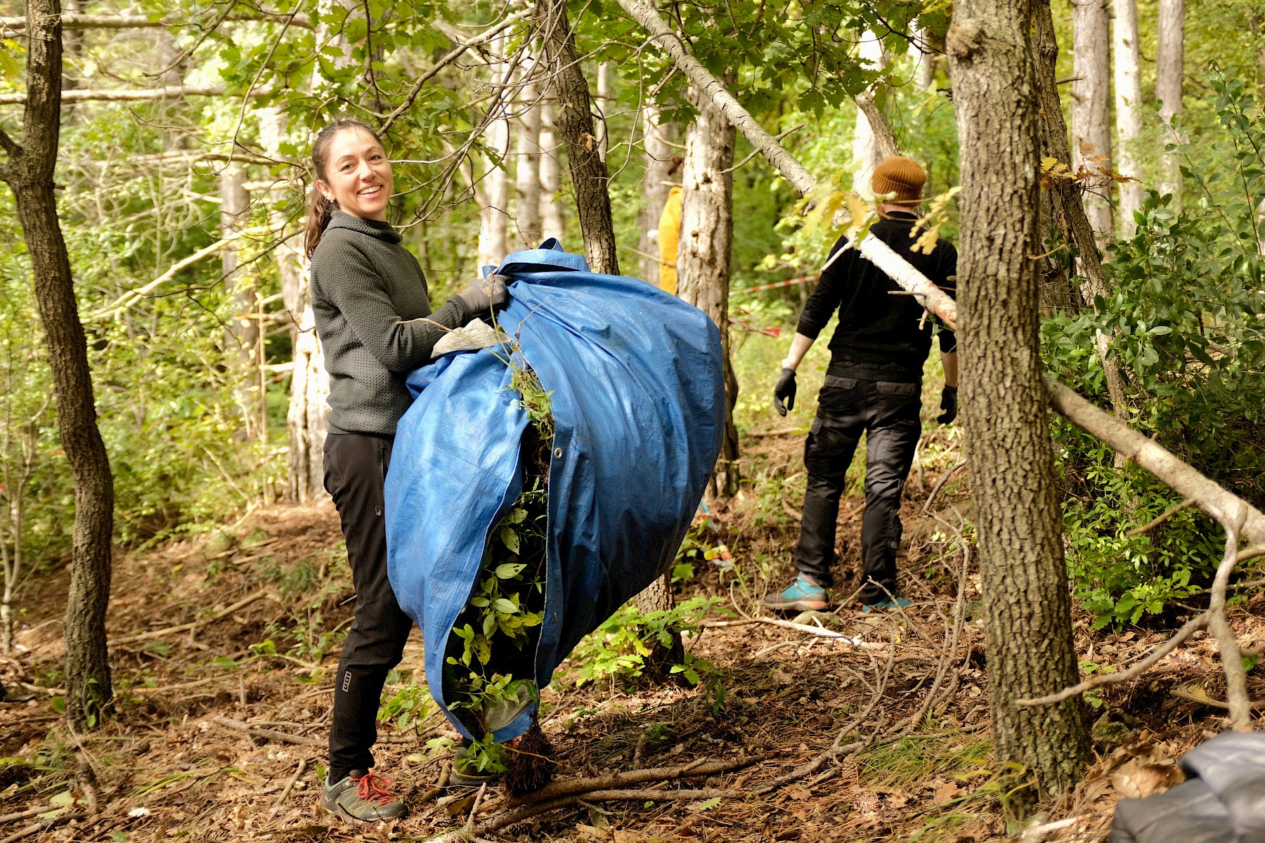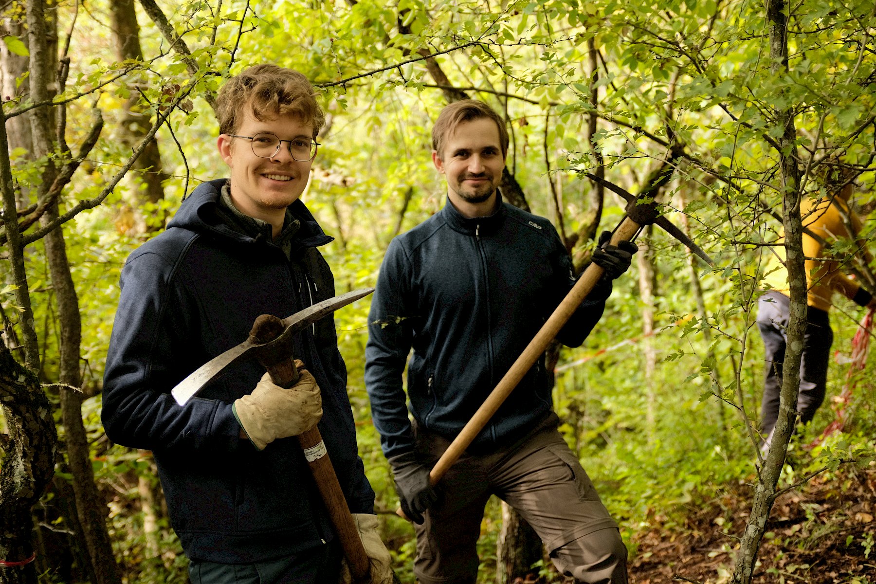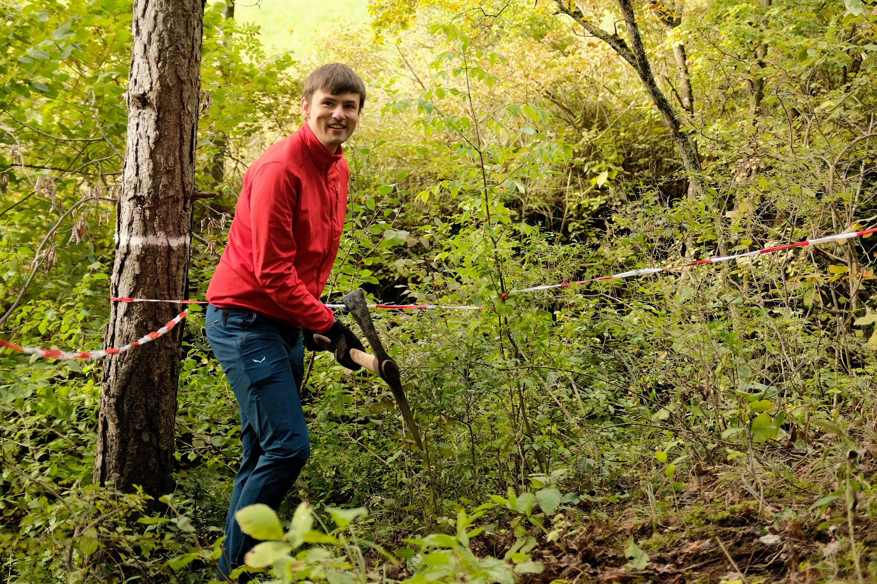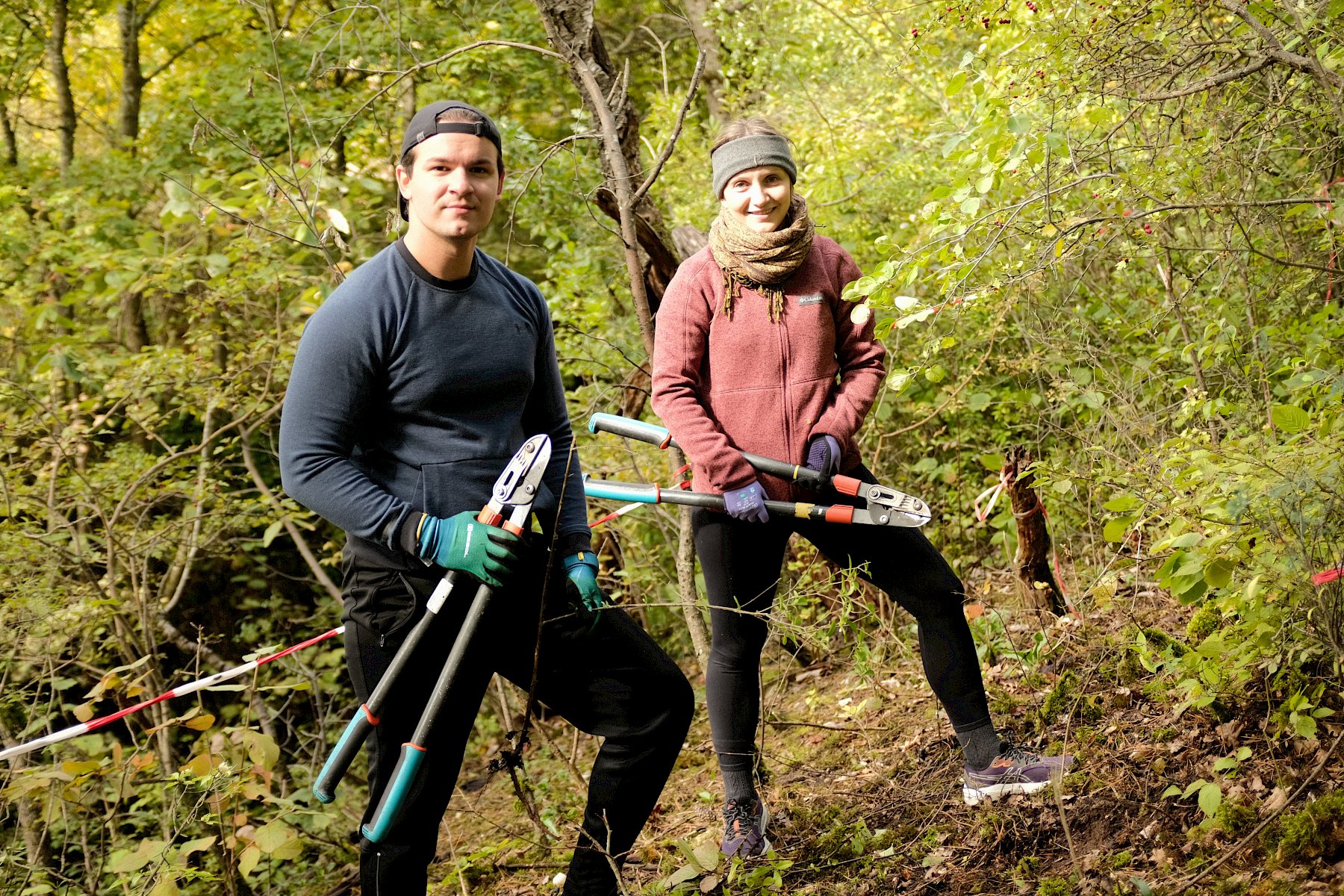 Nach dem Vortrag ging es direkt los mit der Arbeit. Mit Scheren wurde große Büsche zurückgeschnitten, um ein besseres Aushacken danach zu ermöglichen. Hier war dann voller Muskeleinsatz bei der Arbeit mit dem Krampen gefragt. Die Mitarbeitenden der Vienna Insurance Group AG waren voll motiviert, gönnten sich nur eine kurze Mittagspause und arbeiteten dann mit vollen Elan bis zum frühen Nachmittag. Am Ende des Arbeitseinsatzes sind viele Planen mit Schnittgut weggetragen worden - ein erfolgreicher Tag für die Biodiversität.