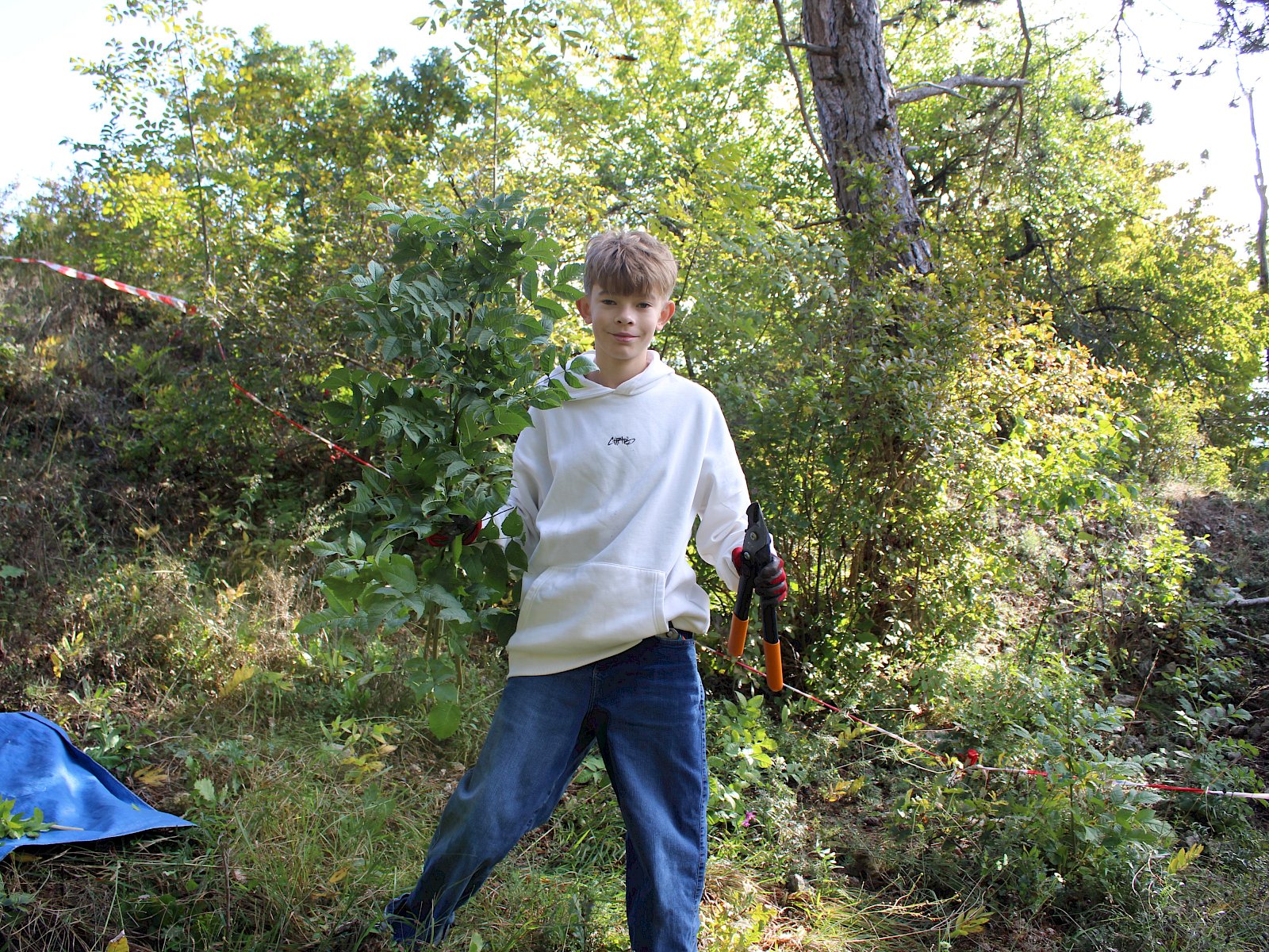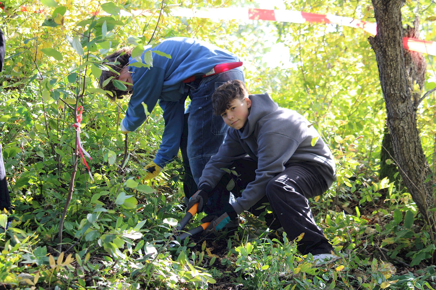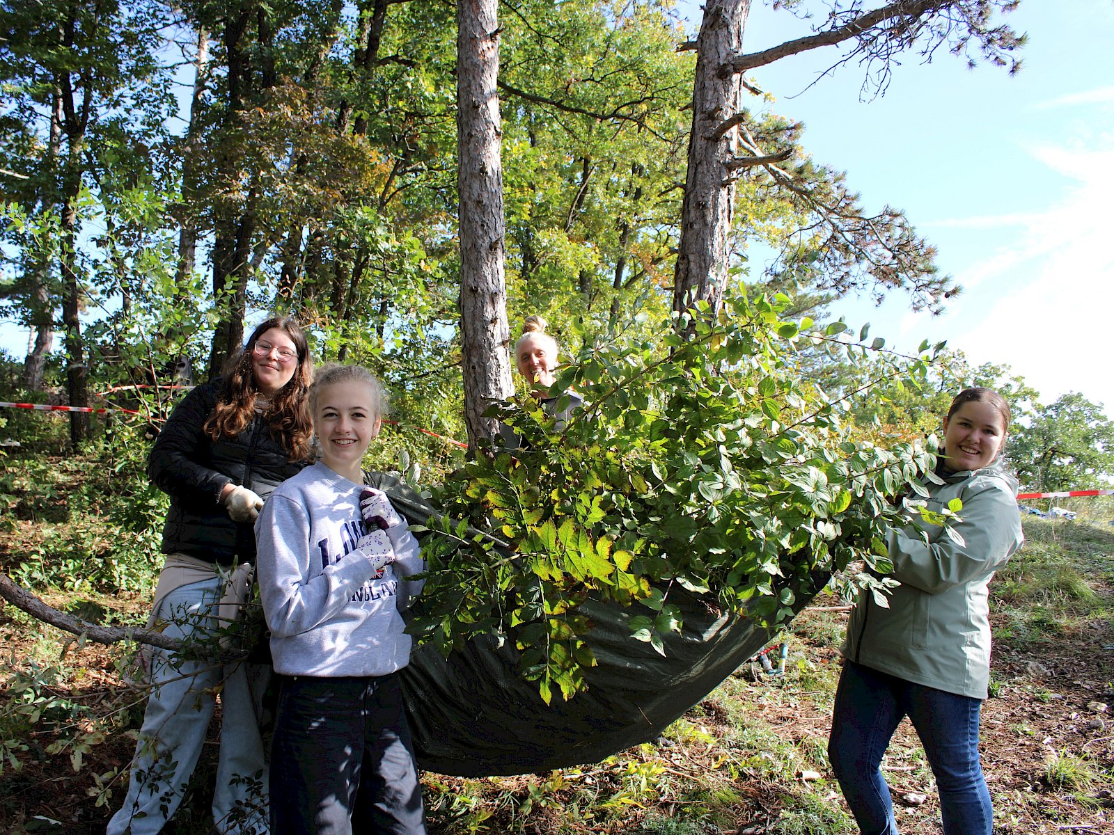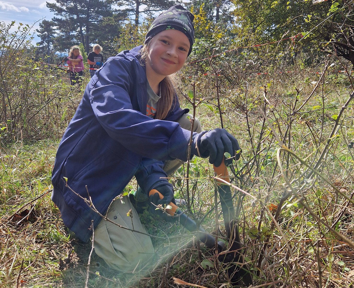 Unsere Naturpädagog:innen vermittelten den Schüler:innen zunächst viel über den Lebensraum Trockenrasen, über die besonderen Tiere und Pflanzen und den großen Artenreichtum. Nach einer gewissenhaften Einschulung zum Werkzeuggebrauch und der Arbeitssicherheit ging es dann motiviert und mit viel Engagement und Freude los. Im Teamwork wurde geschnitten und gesägt, um in Zukunft neue Flächen für wertvollen und artenreichen Trockenrasen zu ermöglichen.