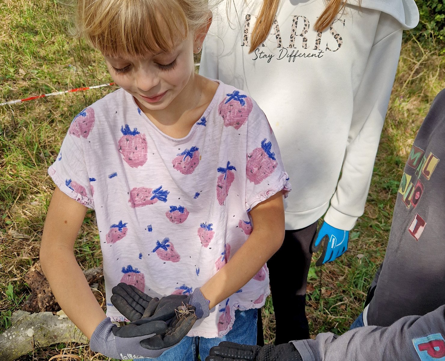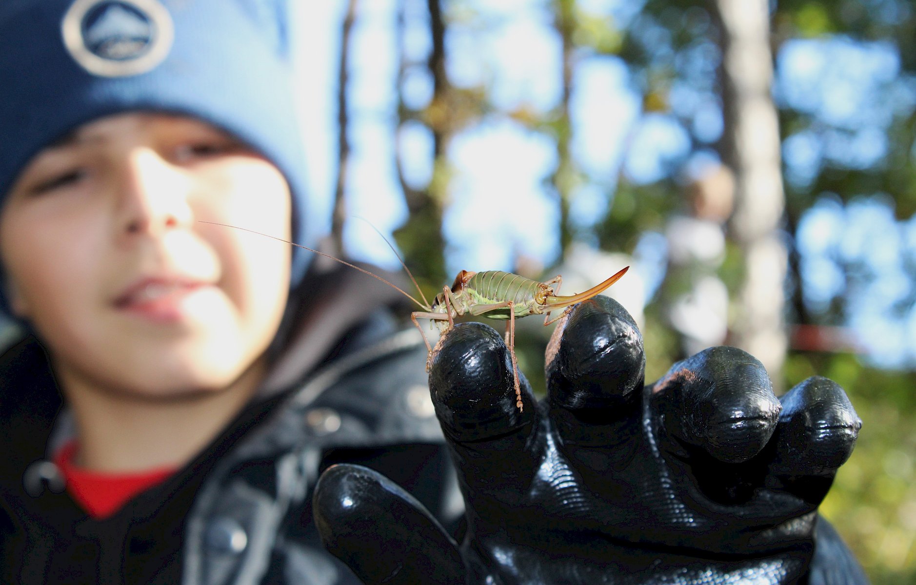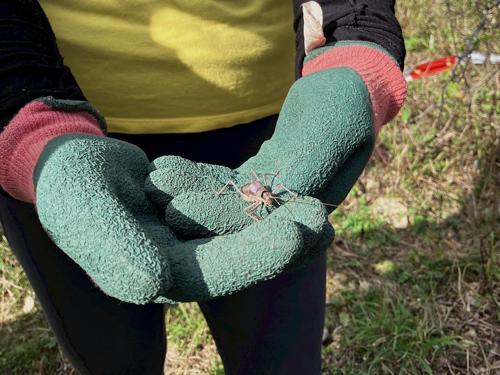 Nebenbei gab es auch einiges zu entdecken: eine Gottesanbeterin (Mantis religiosa) konnte aus nächster Nähe betrachtet werden und auch die Steppen-Sattelschrecke (Ephippiger ephipigger) ließ sich in den Sonnenstrahlen wärmen und zirpte so laut, dass sie entdeckt wurde. Keine Berührungsängste zeigten die jungen Helfer:innen auch mit der wunderschön gefärbten Grünen Huschspinne (Micrommata virescens).