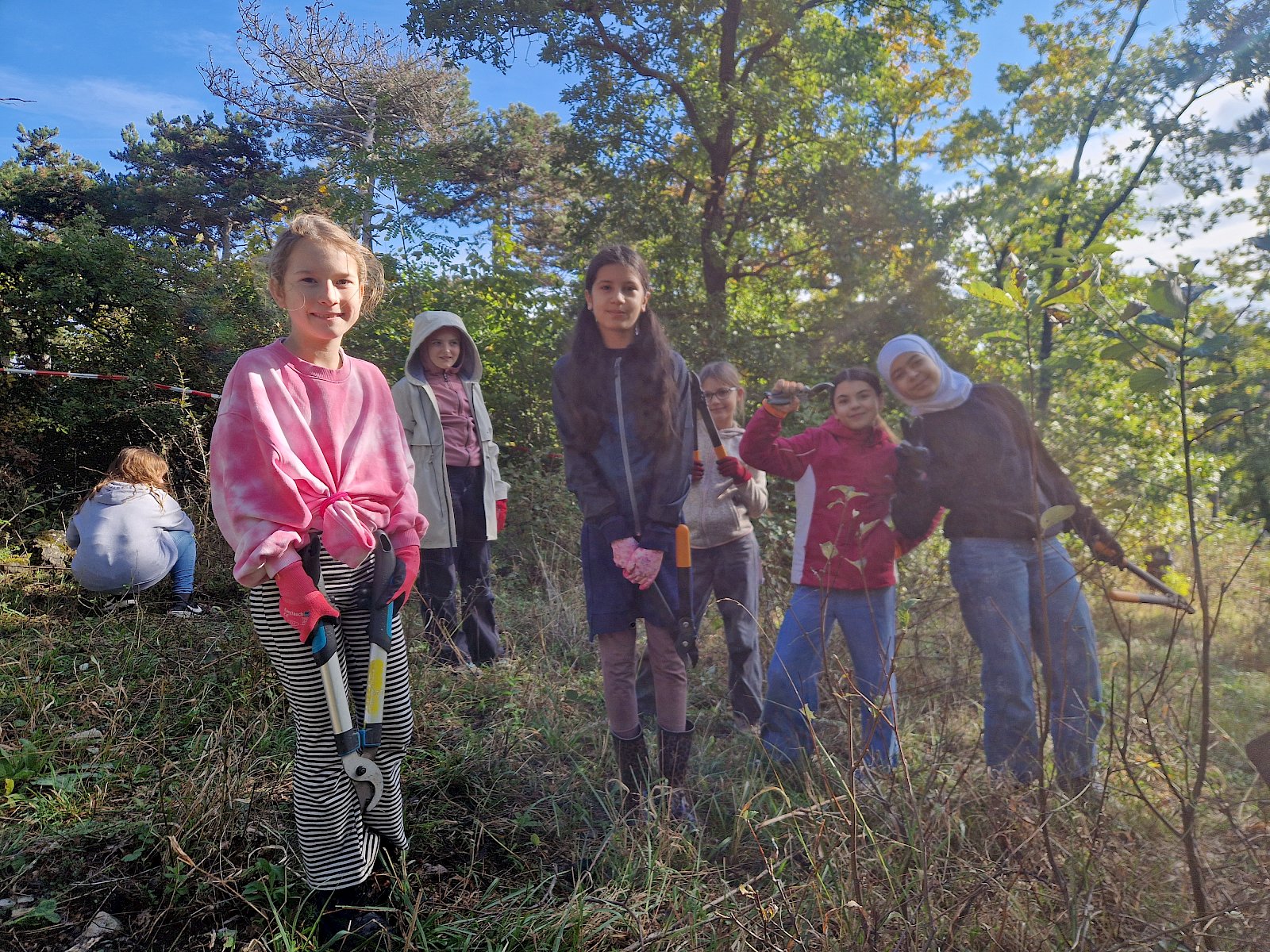 Heute, am vierten Tag der Trockenrasen-Pflegetage in Pfaffstätten, stieg die MMS Gumpoldskirchen ins Geschehen ein. Endlich schien die Sonne und so machten sich 99 Schüler:innen der 1a, 1b, 1c, 4a und 4b gut gelaunt auf den Weg hinauf zum Naturschutzgebiet Heferlberg-Glasrauterriegel-Fluxberg, um dort mit unseren Naturpädagog:innen wertvolle Arbeit zum Erhalt der Biodiversität zu leisten.