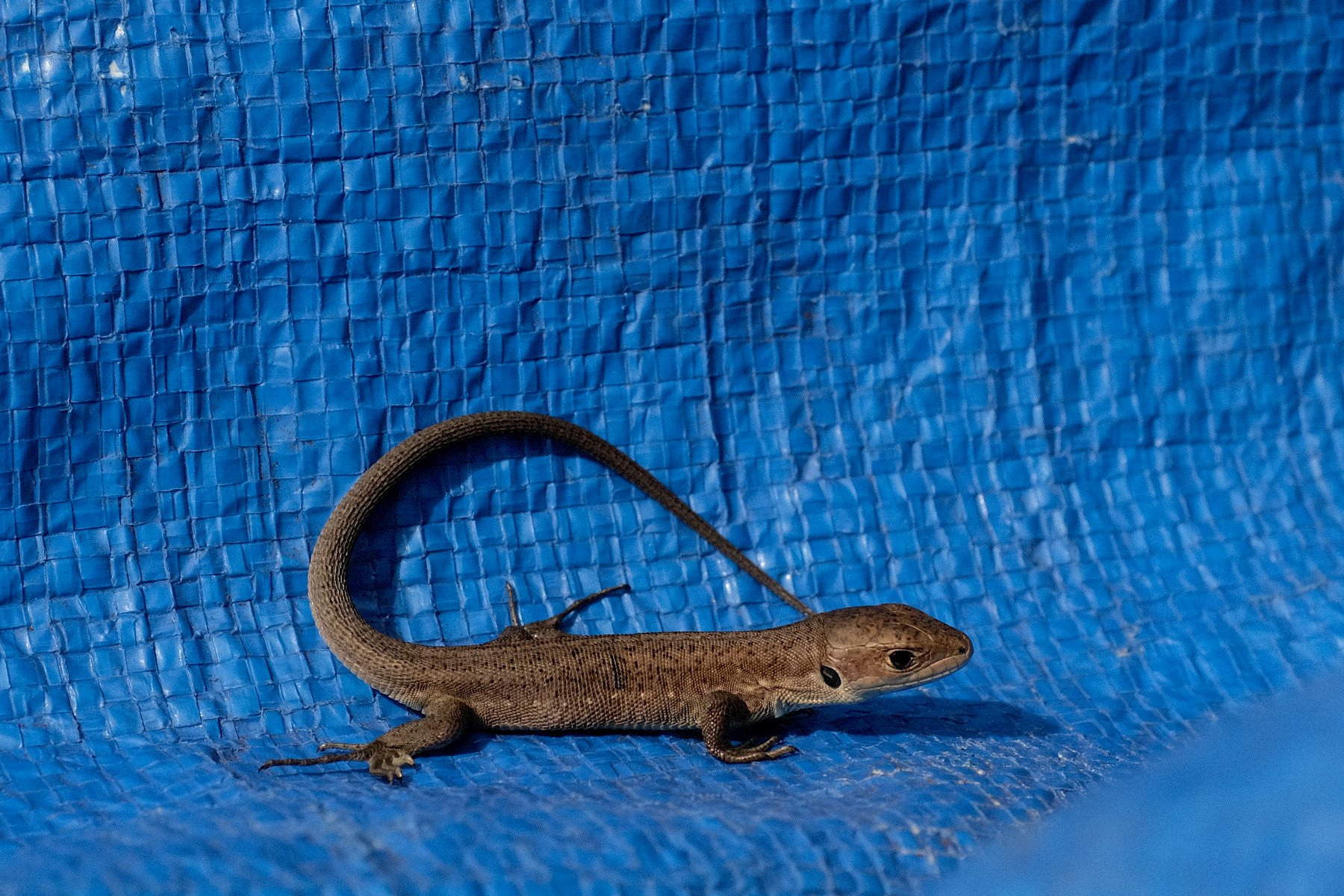 Aber nicht nur die jungen Generation legte sich heute für den Artenschutz ins Zeug. Vormittags und nachmittags arbeitete das Team des LPV und die Praktikant:innen auf der Fläche. Mit Krampen und vollem Muskeleinsatz wurden Kleingehölze samt Wurzeln von der Fläche entfernt. Das Schnittgut wurde mit Planen von der Fläche getragen - doch einmal war die Plane schon besetzt: auf dem von der Sonnen aufgewärmten Material hatte es sich eine Smaragdeidechse (Lacerta viridis) bequem gemacht und ließ sich bereitwillig fotografieren.
