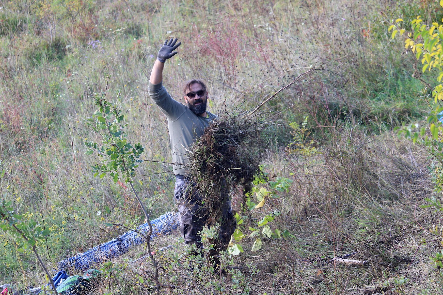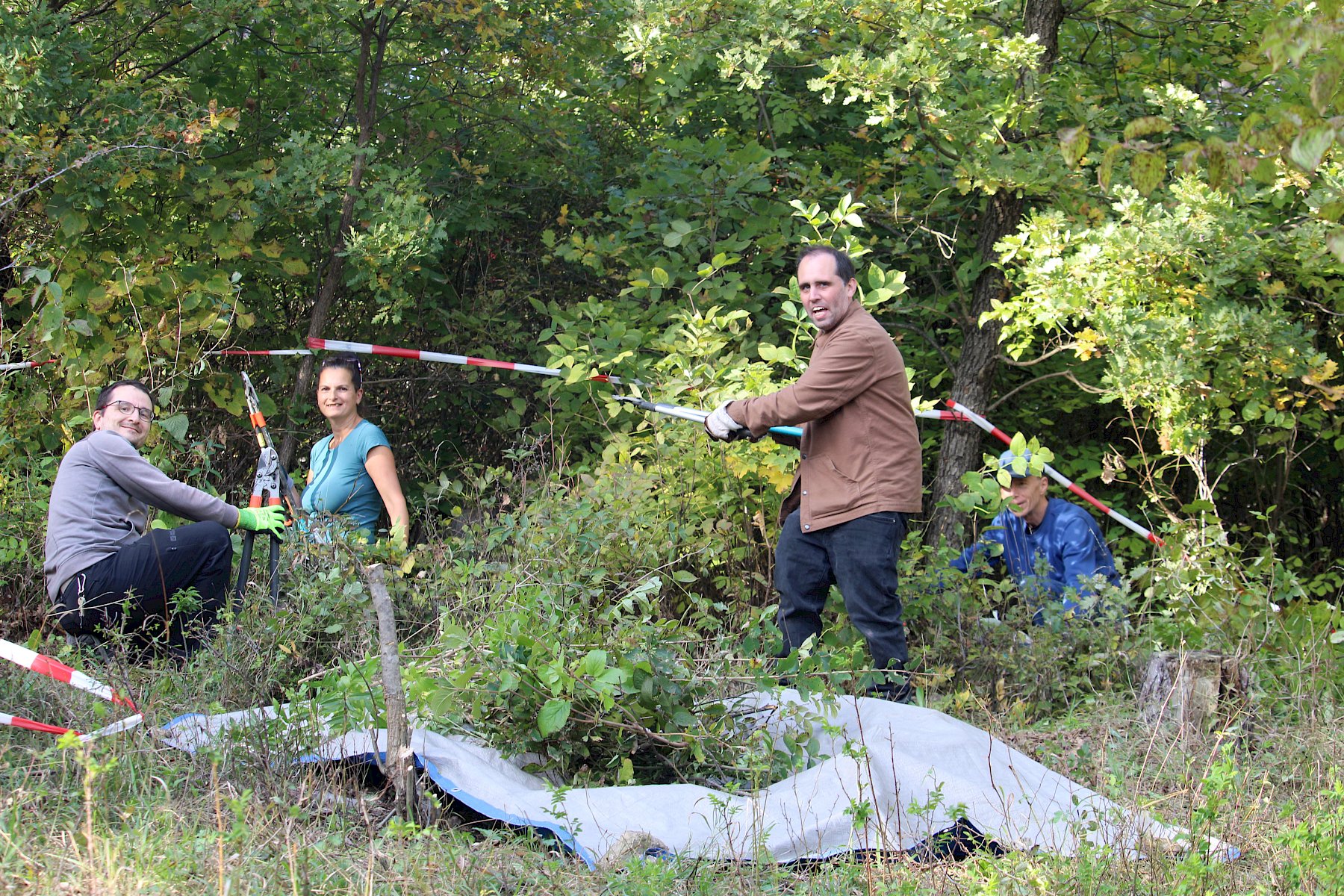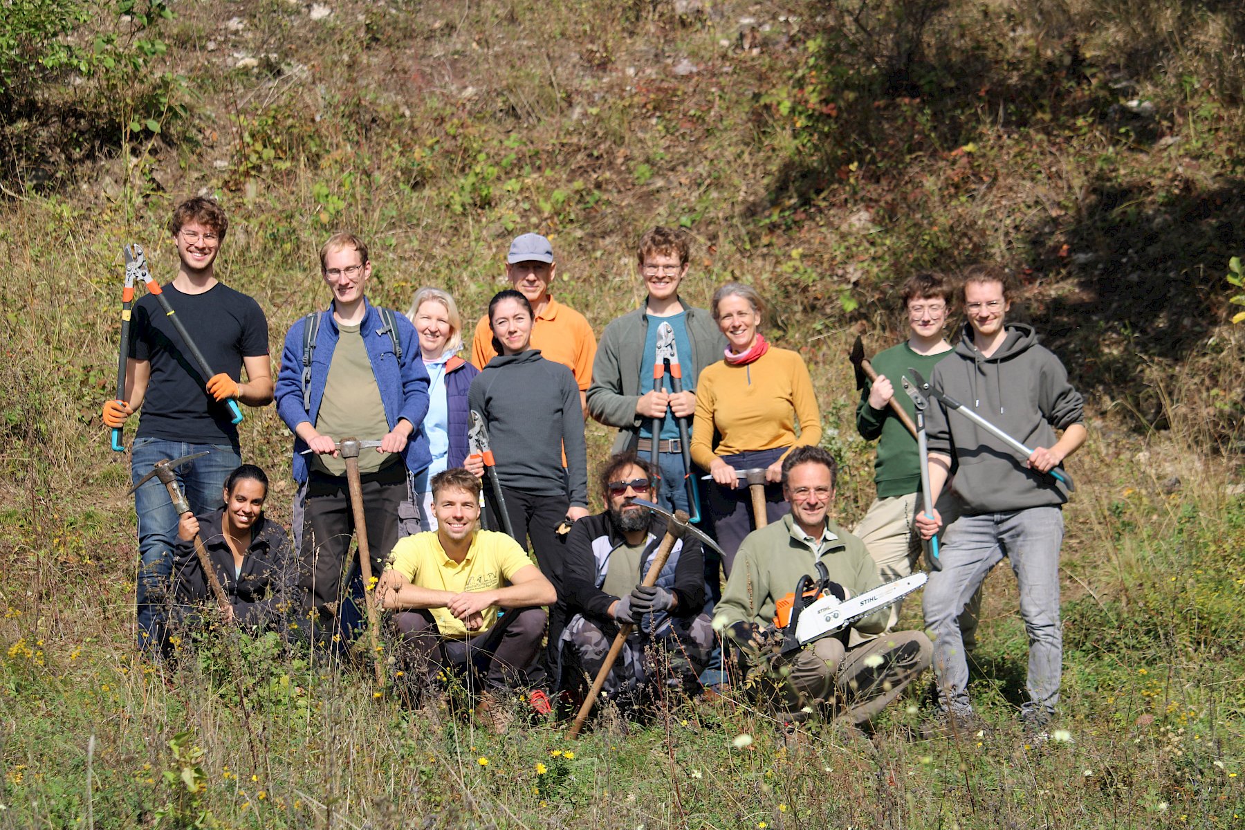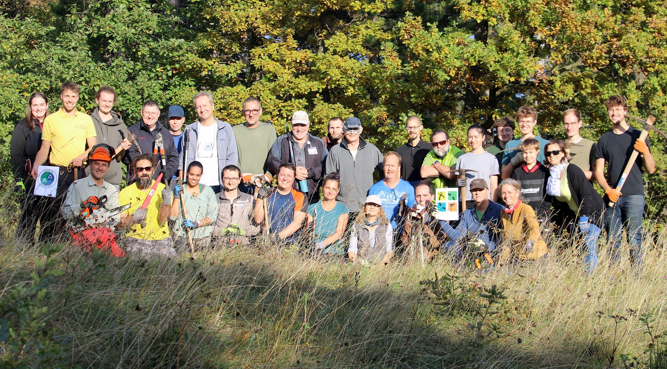 Mit reichlich gutem Essen gestärkt, ging es am Nachmittag mit der Trockenrasenpflege weiter. Wir trafen uns an der Trockenmauer am Fluxbergweg, unterhalb des Naturschutzgebiets Heferlberg-Glasrauterriegel-Fluxberg, in dem wir bereits am Vormittag arbeiteten. Dort bekamen wir zusätzliche große Unterstützung von vier Helfer:innen aus Pfaffstätten, sowie 15 Geocacher:innen, die im Rahmen eines CITO (Cache in Trash out)-Events engagiert mitanpackten. Organisiert von Elisabeth Hintringer und Klaus Haberzettl kamen nun schon im dritten Jahr begeisterte Geocacher:innen zusammen, um sich einen Nachmittag für die artenreichen und bunt blühenden Trockenrasen des einzusetzen.