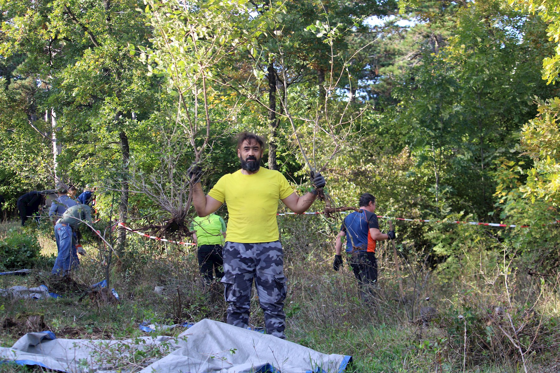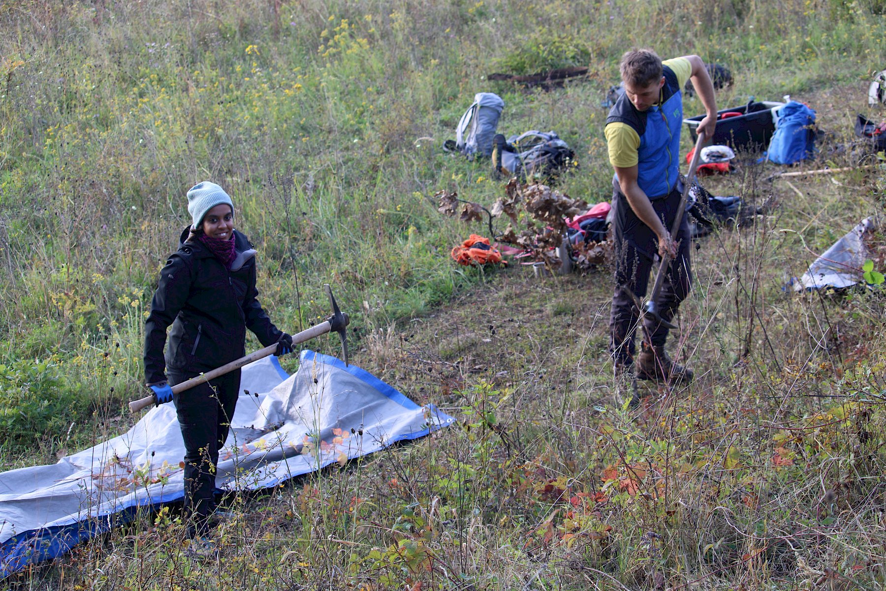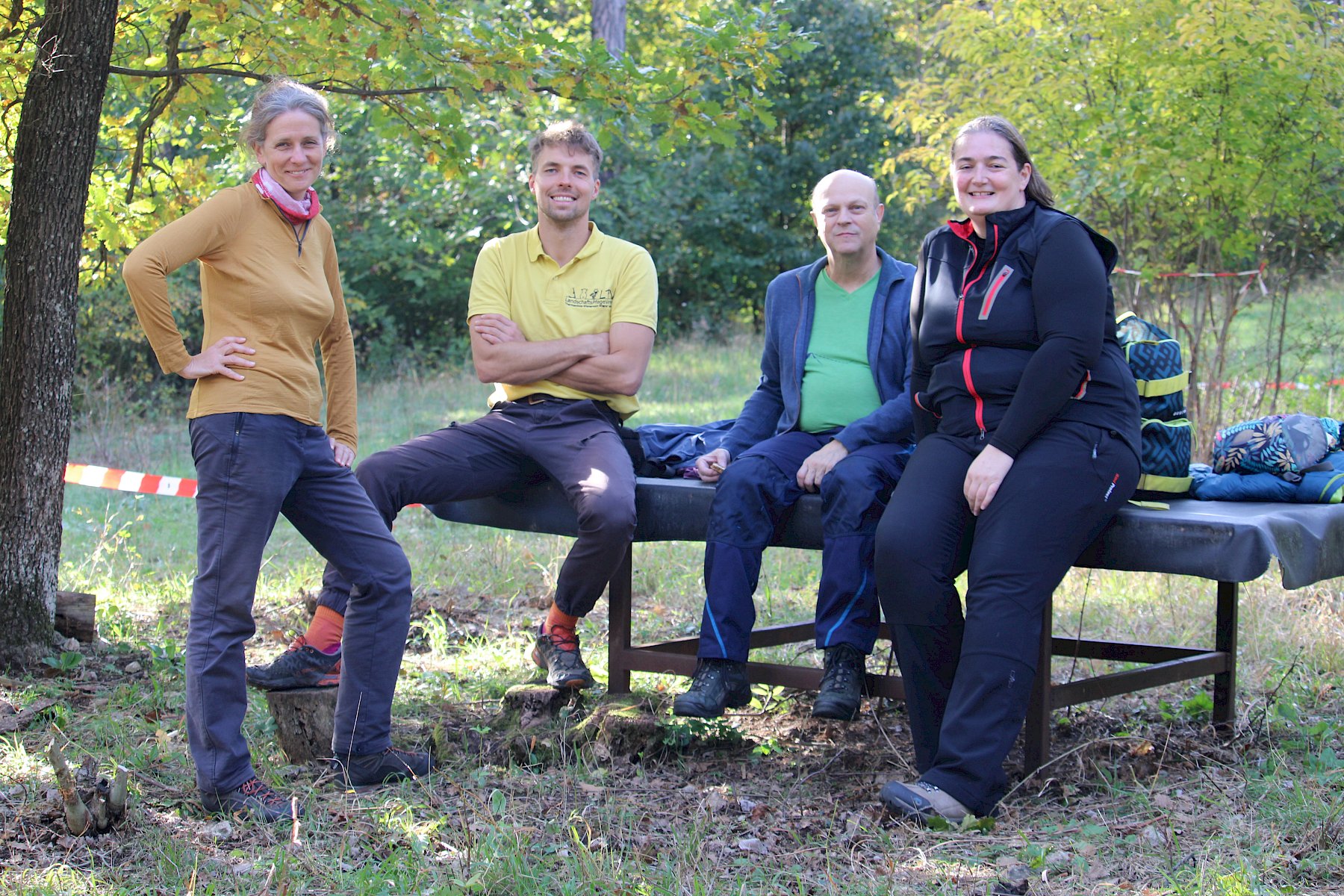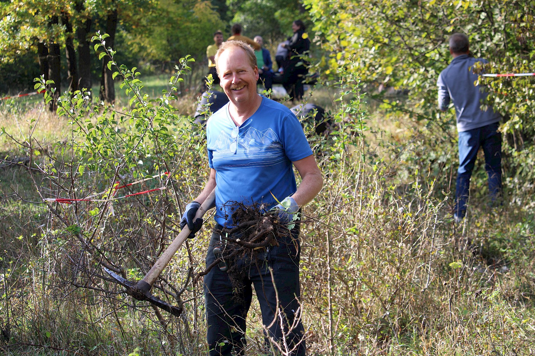 Mit reichlich gutem Essen gestärkt, ging es am Nachmittag mit der Trockenrasenpflege weiter. Wir trafen uns an der Trockenmauer am Fluxbergweg, unterhalb des Naturschutzgebiets Heferlberg-Glasrauterriegel-Fluxberg, in dem wir bereits am Vormittag arbeiteten. Dort bekamen wir zusätzliche große Unterstützung von vier Helfer:innen aus Pfaffstätten, sowie 15 Geocacher:innen, die im Rahmen eines CITO (Cache in Trash out)-Events engagiert mitanpackten. Organisiert von Elisabeth Hintringer und Klaus Haberzettl kamen nun schon im dritten Jahr begeisterte Geocacher:innen zusammen, um sich einen Nachmittag für die artenreichen und bunt blühenden Trockenrasen des einzusetzen.