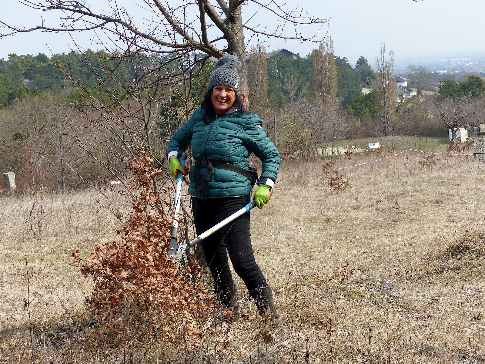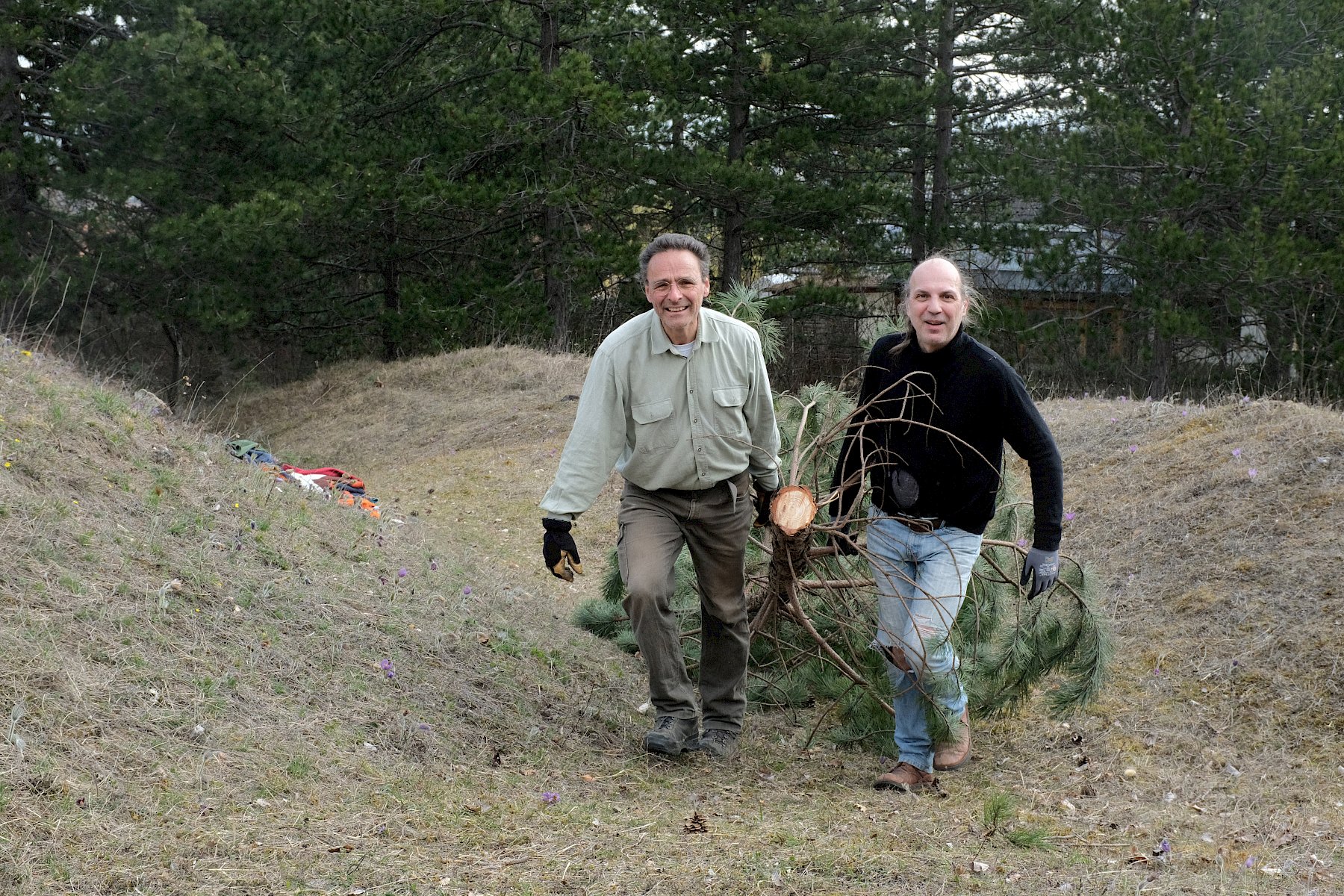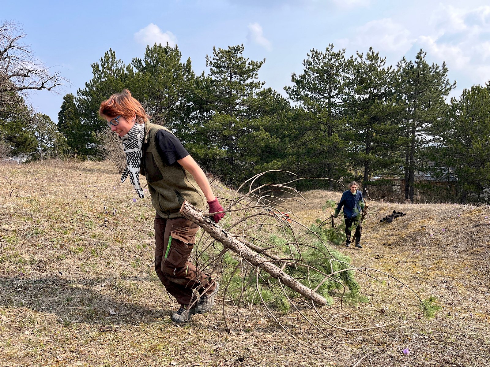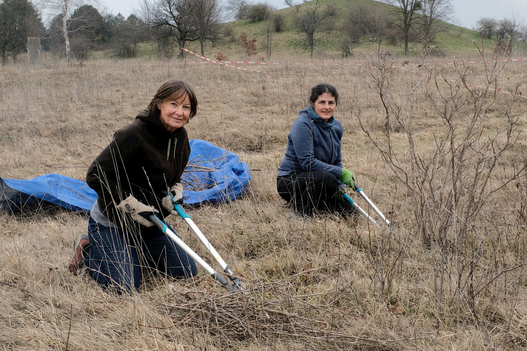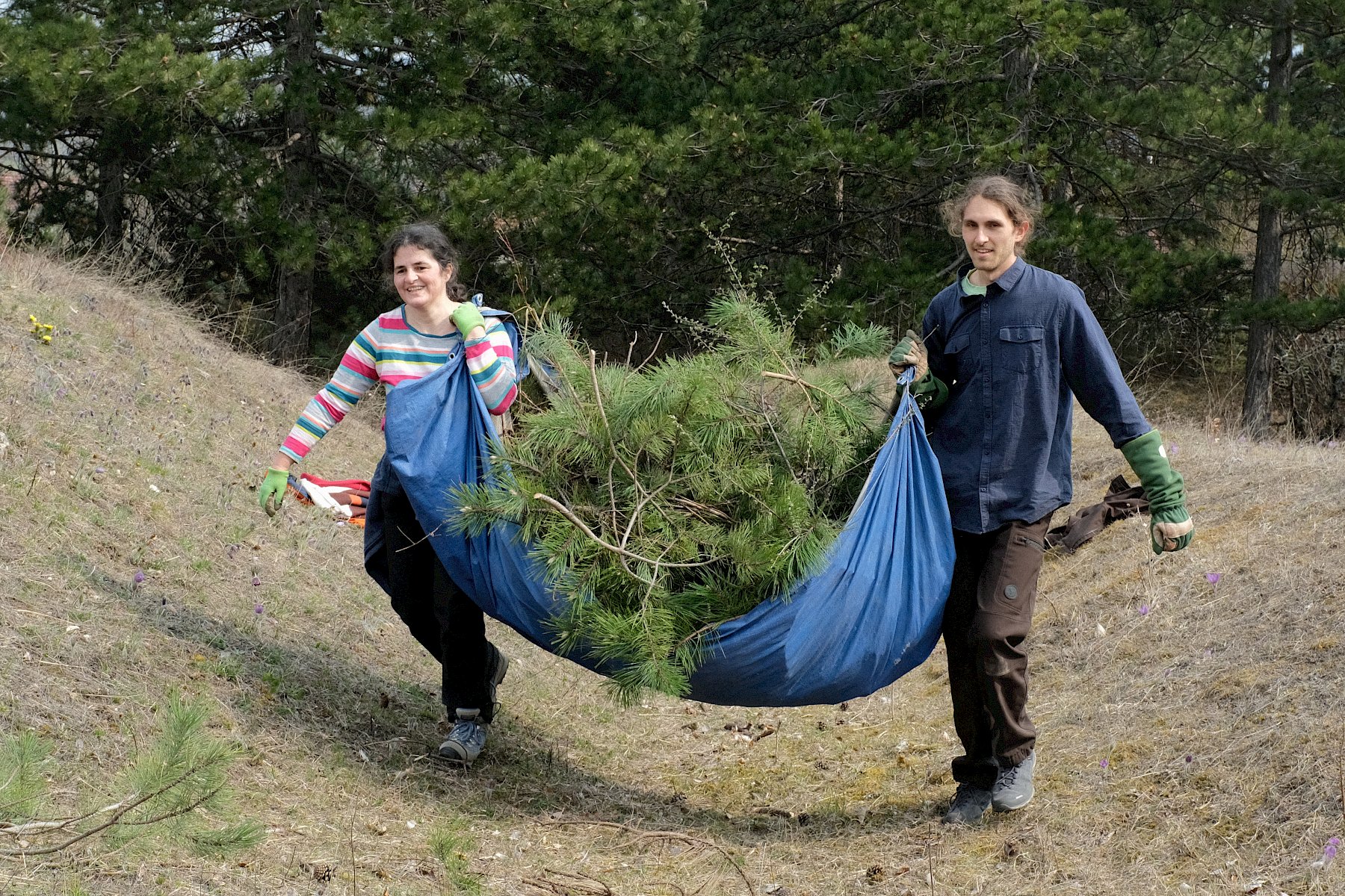 Daher machte sich nach der Einführung eine Gruppe Freiwilliger daran, die zahlreichen Ausläufer des Blutroten Hartriegels (Cornus sanguinea) mit dem Krampen zu entfernen. Nur durch das vollständige Aushacken mitsamt den Wurzeln kann dieser hartnäckige Strauch nachhaltig zurückgedrängt werden. Eine weitere Gruppe beseitigte mithilfe von Bürgermeister Stefan Rabl und seiner Motorsäge junge Schwarzföhren (Pinus nigra) am Rand der Fläche. Die übrigen Teilnehmenden waren mit Astscheren ausgestattet und kümmerten sich um den Rückschnitt aufkommender Gehölze wie kleiner Schwarzföhren, Liguster (Ligustrum vulgare), Hartriegel und einzelnen Eichen. Das anfallende Schnittgut wurde auf Planen gesammelt und in gemeinsamer Arbeit von den Flächen abgetragen. Auf den freigemachten Flächen finden die seltenen Trockenrasenarten künftig wieder mehr Platz und Licht.