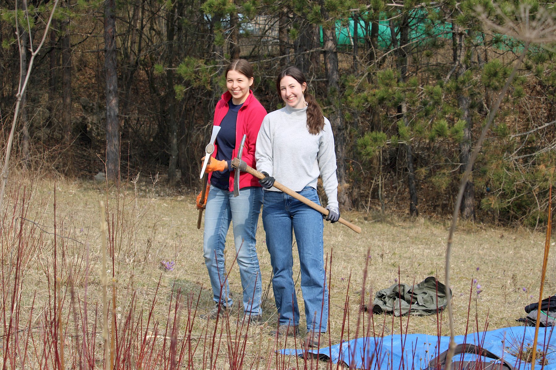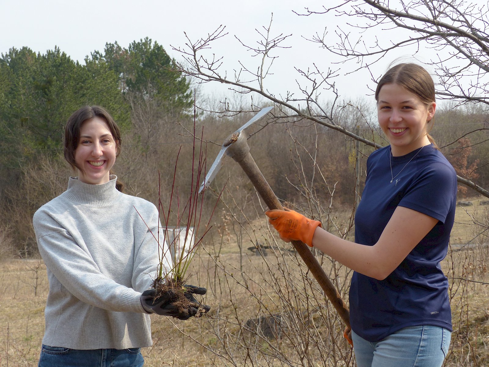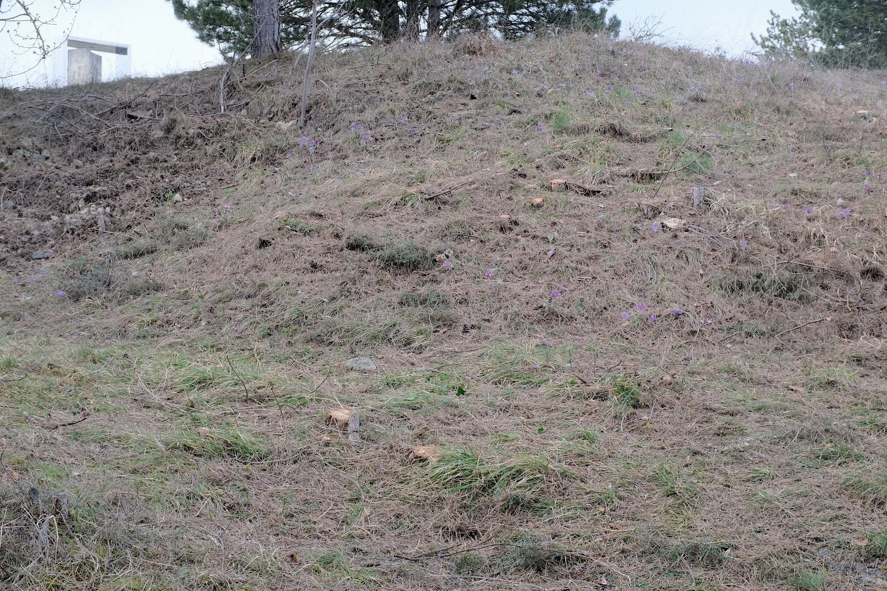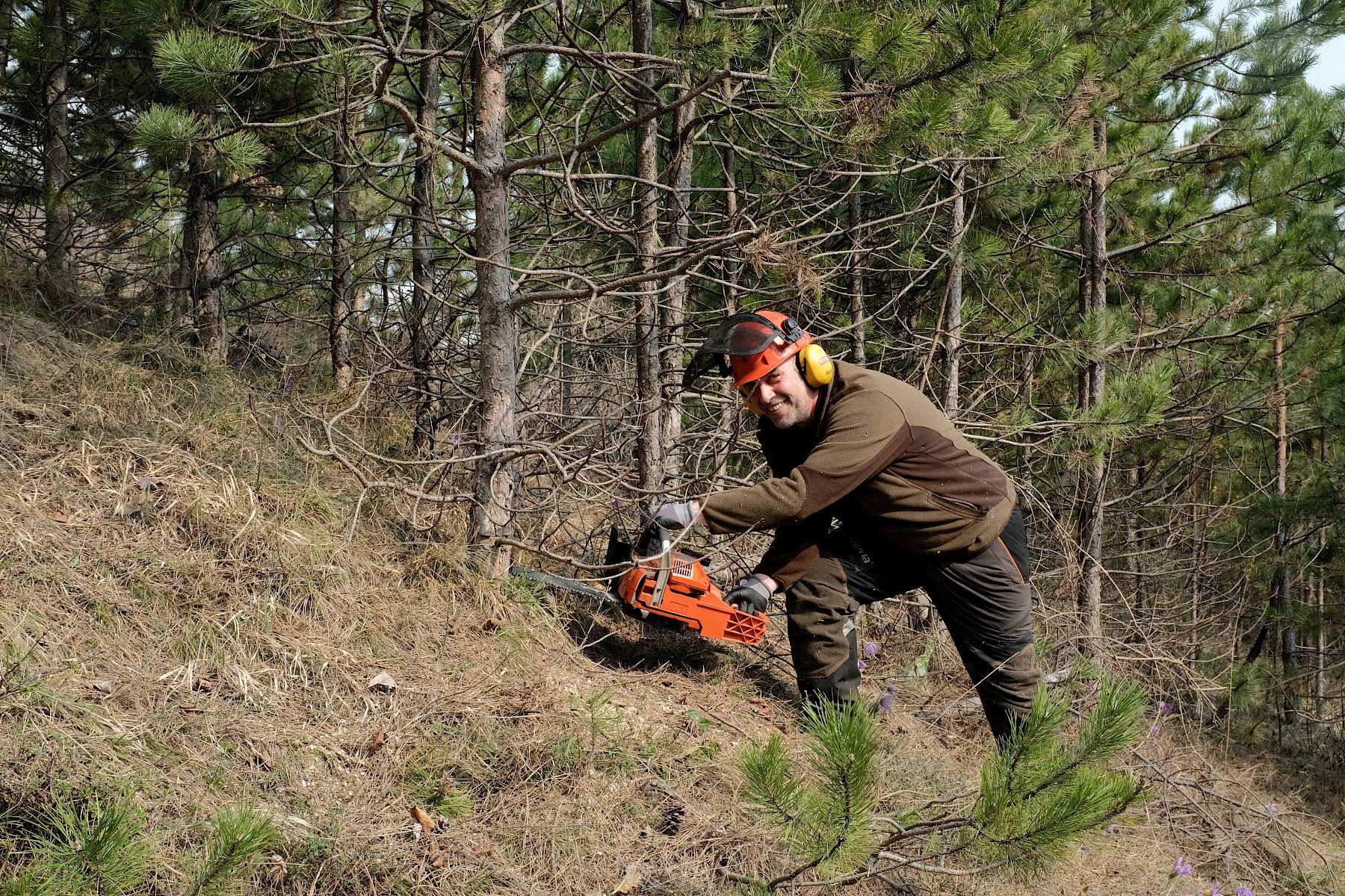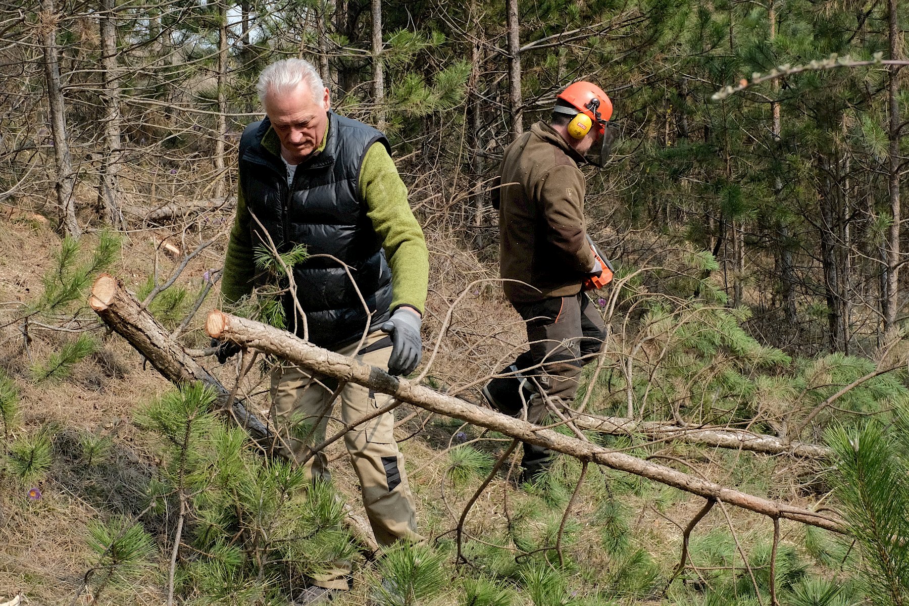 Daher machte sich nach der Einführung eine Gruppe Freiwilliger daran, die zahlreichen Ausläufer des Blutroten Hartriegels (Cornus sanguinea) mit dem Krampen zu entfernen. Nur durch das vollständige Aushacken mitsamt den Wurzeln kann dieser hartnäckige Strauch nachhaltig zurückgedrängt werden. Eine weitere Gruppe beseitigte mithilfe von Bürgermeister Stefan Rabl und seiner Motorsäge junge Schwarzföhren (Pinus nigra) am Rand der Fläche. Die übrigen Teilnehmenden waren mit Astscheren ausgestattet und kümmerten sich um den Rückschnitt aufkommender Gehölze wie kleiner Schwarzföhren, Liguster (Ligustrum vulgare), Hartriegel und einzelnen Eichen. Das anfallende Schnittgut wurde auf Planen gesammelt und in gemeinsamer Arbeit von den Flächen abgetragen. Auf den freigemachten Flächen finden die seltenen Trockenrasenarten künftig wieder mehr Platz und Licht.