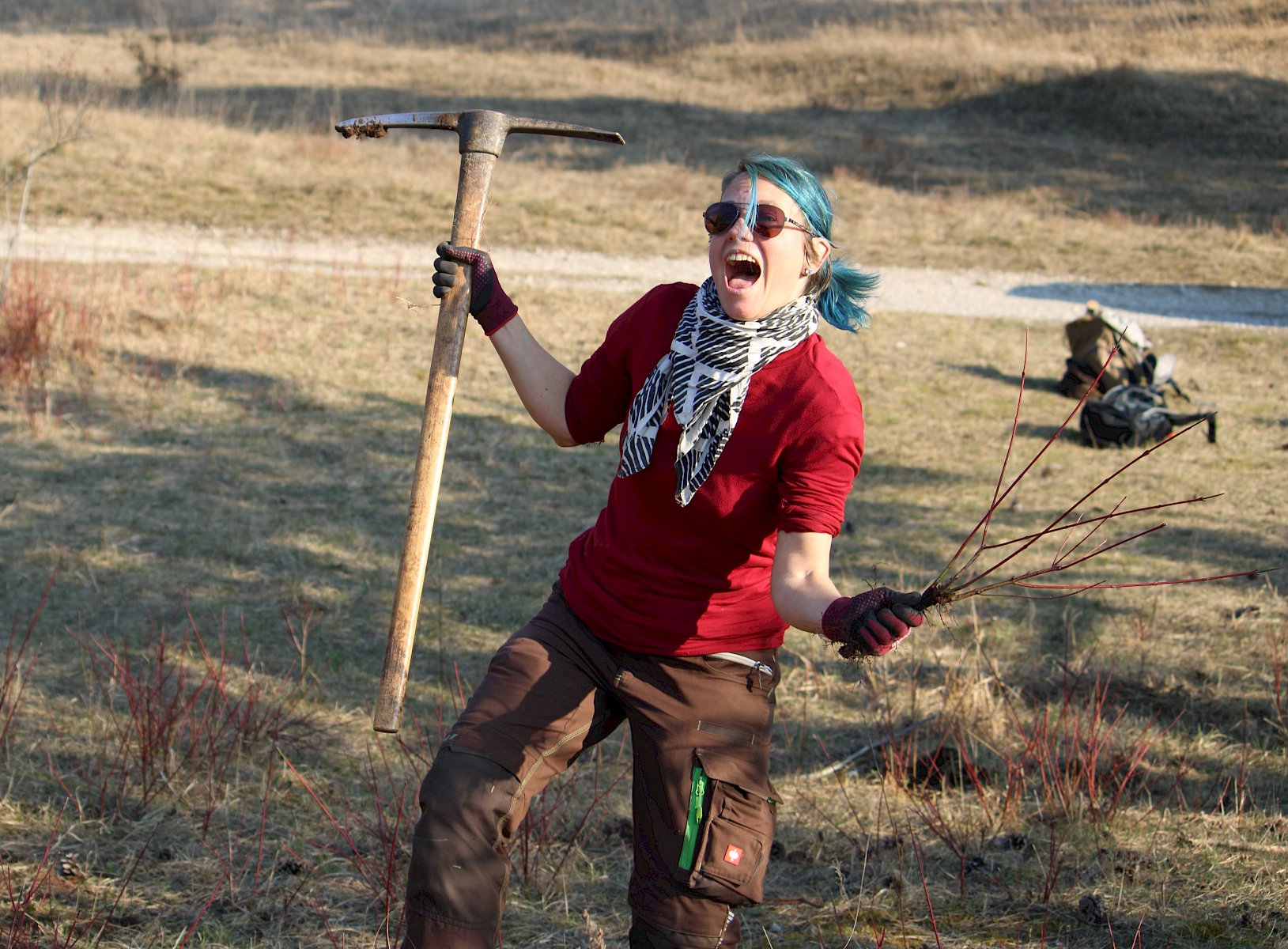 In manchen Bereichen haben sich Liguster und Blutroter Hartriegel sehr stark ausgebreitet. Gemeinsam entbuschen wir den Trockenrasen, damit er nicht verwaldet. Dabei werden Gebüsche geschnitten und ausgehackt.
