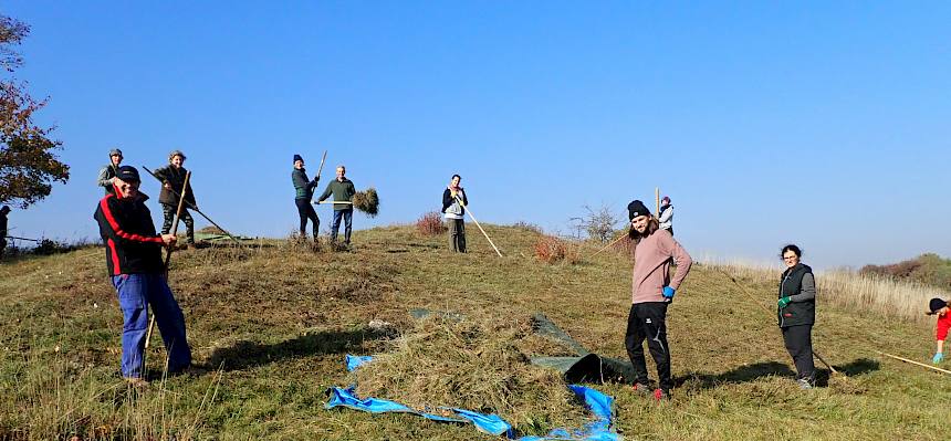 Direkt im Anschluss an die Pflege des Naturdenkmal Kuhschellenwiese wurde auch das Naturdenkmal Trockenrasenklippe in Hölles zur Hälfte mit dem Balkenmäher gemäht und das Mähgut zusammengerecht. Nahezu alle Helfer*innen des vorhergehenden Pflegeeinsatzes waren nach wie vor tatkräftig bei der Arbeit. Auch die Vorgehensweise der Pflege war ident – Teilflächen wurden mit dem Balkenmäher gemäht und das Schnittgut sorgfältig von der Fläche entfernt. Auch hier gingen die Arbeiten zügig voran.