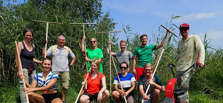 Jeweils neun freiwillige Helfer*innen arbeiteten am Montag und am Dienstag - ausgerüstet mit Rechen, Balkenmäher und reichlich Wasser - im Herrngras. Den hohen Temperaturen zum Trotz ging die Arbeit gut voran und wir konnten am Montag die beiden vorgemähten Teilflächen erfolgreich vom Mähgut befreien. Auch zahlreiche Gehöze wurden entfernt, um künftige Mäheinsätze zu erleichtern. Am Dienstag mähten wir ein ein weiteres Teilstück des Areals mit dem Balkenmäher, rechten das Mähgut zusammen und türmten es zu einem Haufen auf. Das Schneiden des Schilfs in der Vegetationsperiode ist aktuell auf den betreffenden Flächen sehr wichtig, um das Schilf zu schwächen und damit wieder zurück zu drängen. Durch das Wegrechen und Entfernen von der Fläche entstehen freie Bodenstellen, an welchen sich die Feuchtwiesen-Arten erneut etablieren und ausbreiten können. Als Abschluss des Pflegeeinsatzes wurde noch gemeinsam eine kleine Fläche von der invasiven und nicht heimischen Kanadischen Goldrute entfernt, die im Herrngras zum Glück nur äußerst vereinzelt vorkommt und das soll auch so bleiben.